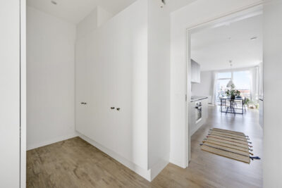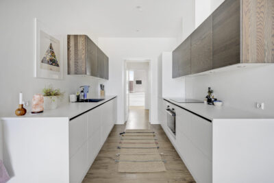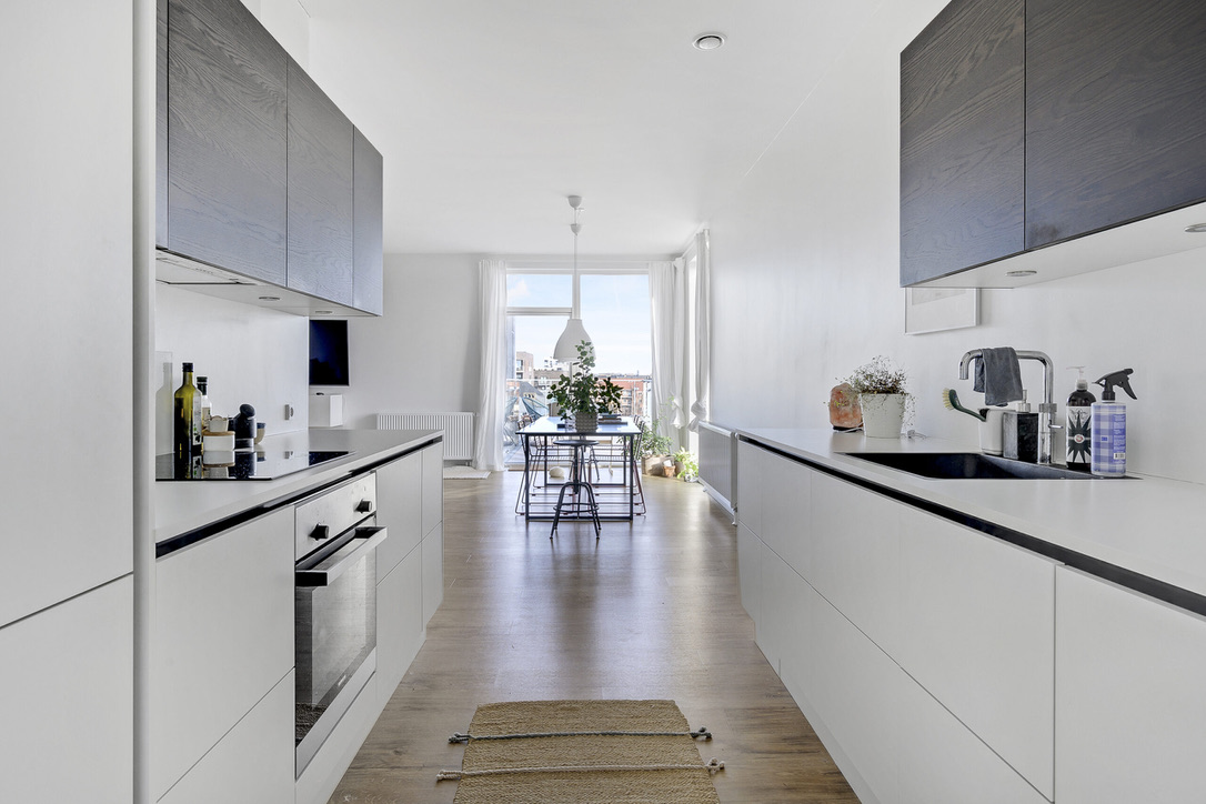 I lejligheden er der et minimalisk hvidt køkken med indbyggede hvidevarer i form af opvaskemaskine og køle/frys. Ydermere er der indbygningsovn, kogeplade, emhætte samt cooker. Der er i lejligheden også vaskemaskine og tørretumbler.