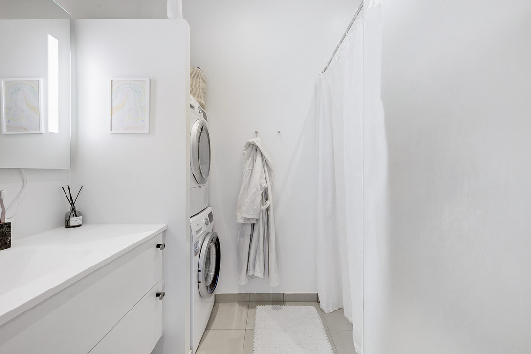 Lejlighedens badeværelse er lækkert lys med gulvvarme samt vask med skabsarrangement. Der er stort garderobeskab i soveværelset. Gulvene i lejligheden er belagt med vinyl i trælook.