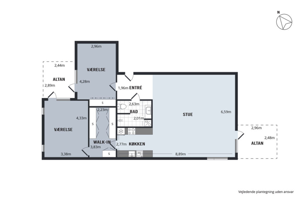 Lejligheden indeholder éntre, soveværelse, værelse, badeværelse og et indbydende køkken-alrum.