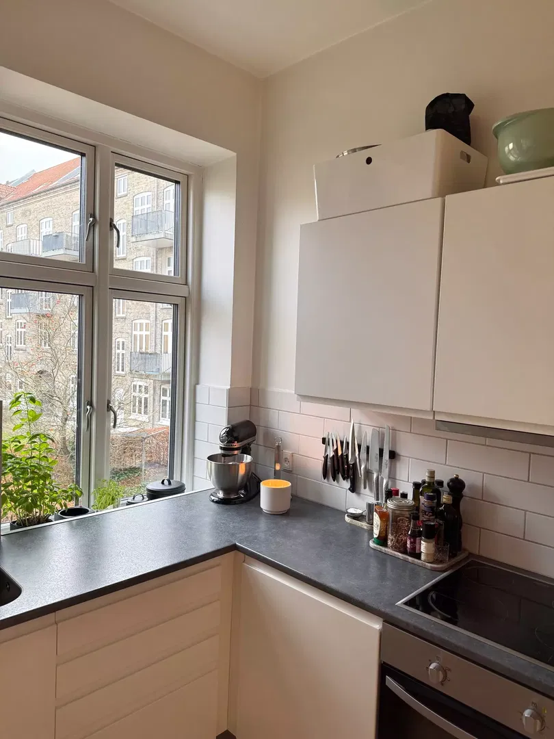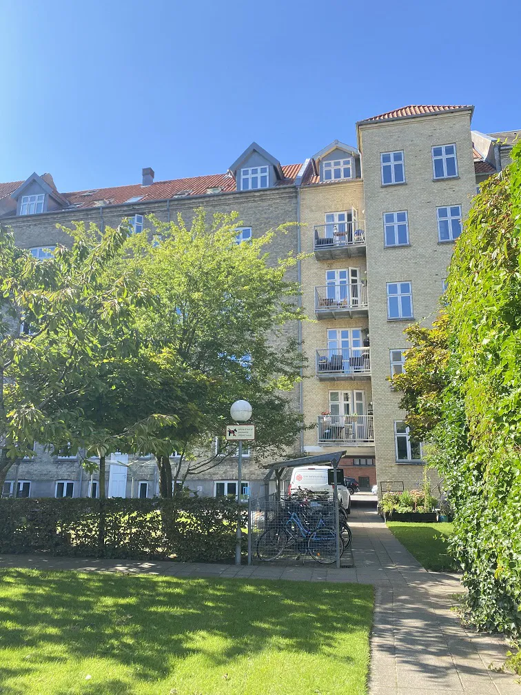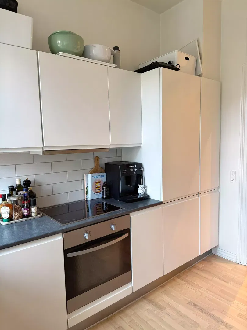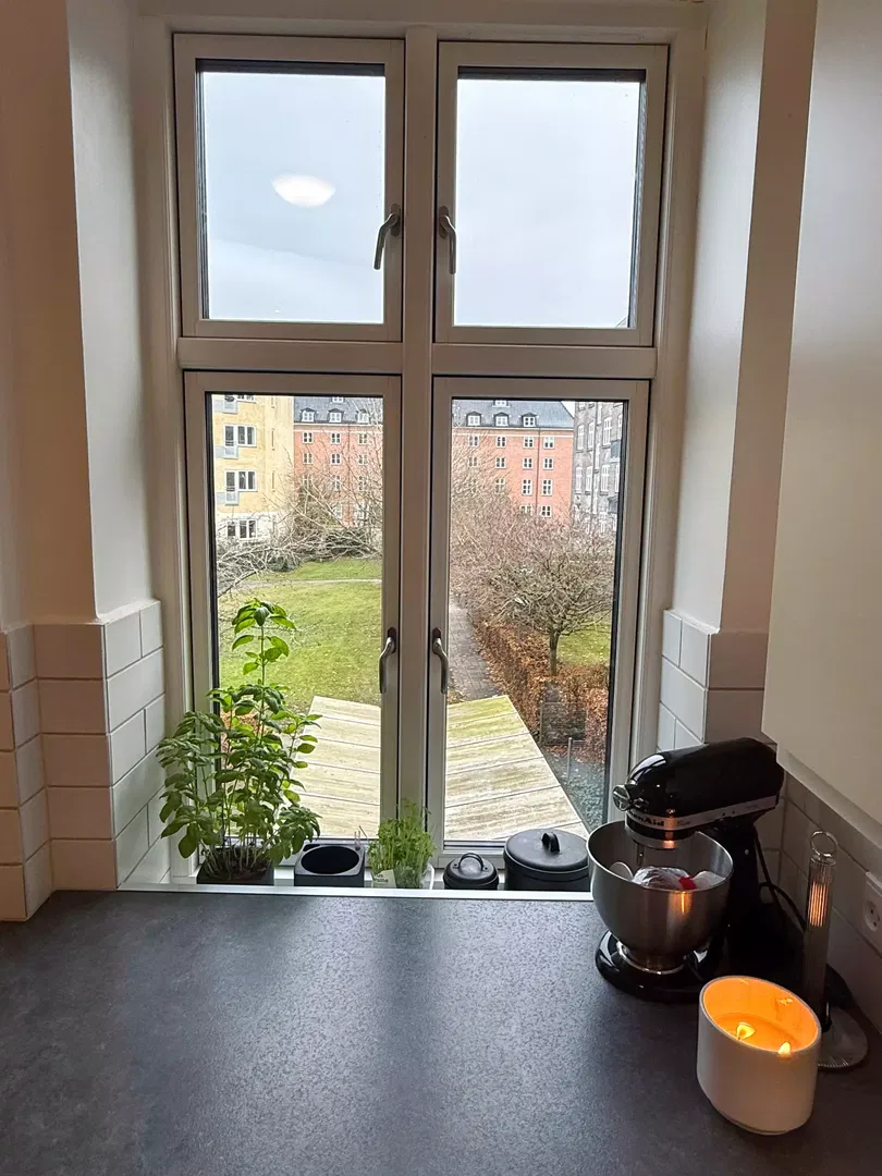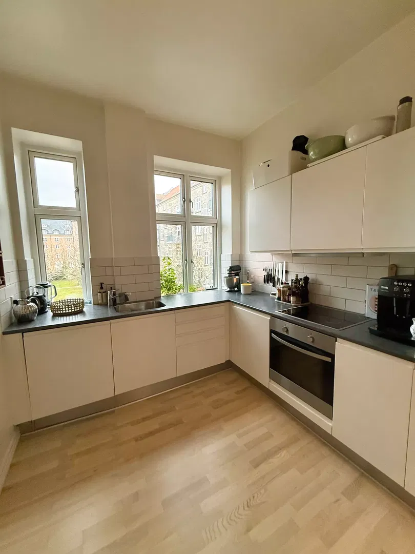 Køkkenet er opdateret med hvide elementer og klassiske fliser, udstyret med opvaskemaskine, indbygningsovn og kogeplade. Soveværelserne er lyse og indretningsvenlige, med plads til både seng, garderobe og skrivebord. Badeværelset er funktionelt indrettet med separat bruseafsnit og god skabsplads. Gennemgående trægulve bidrager til en rolig atmosfære, og flere rum vender mod gården, hvilket giver en fredelig hverdag.
