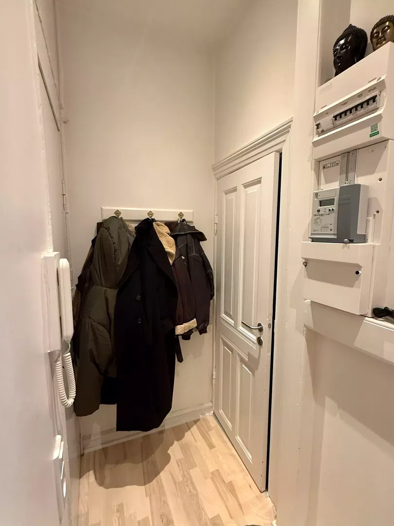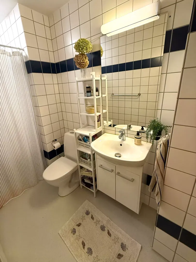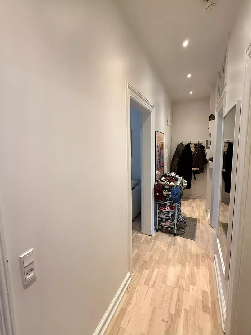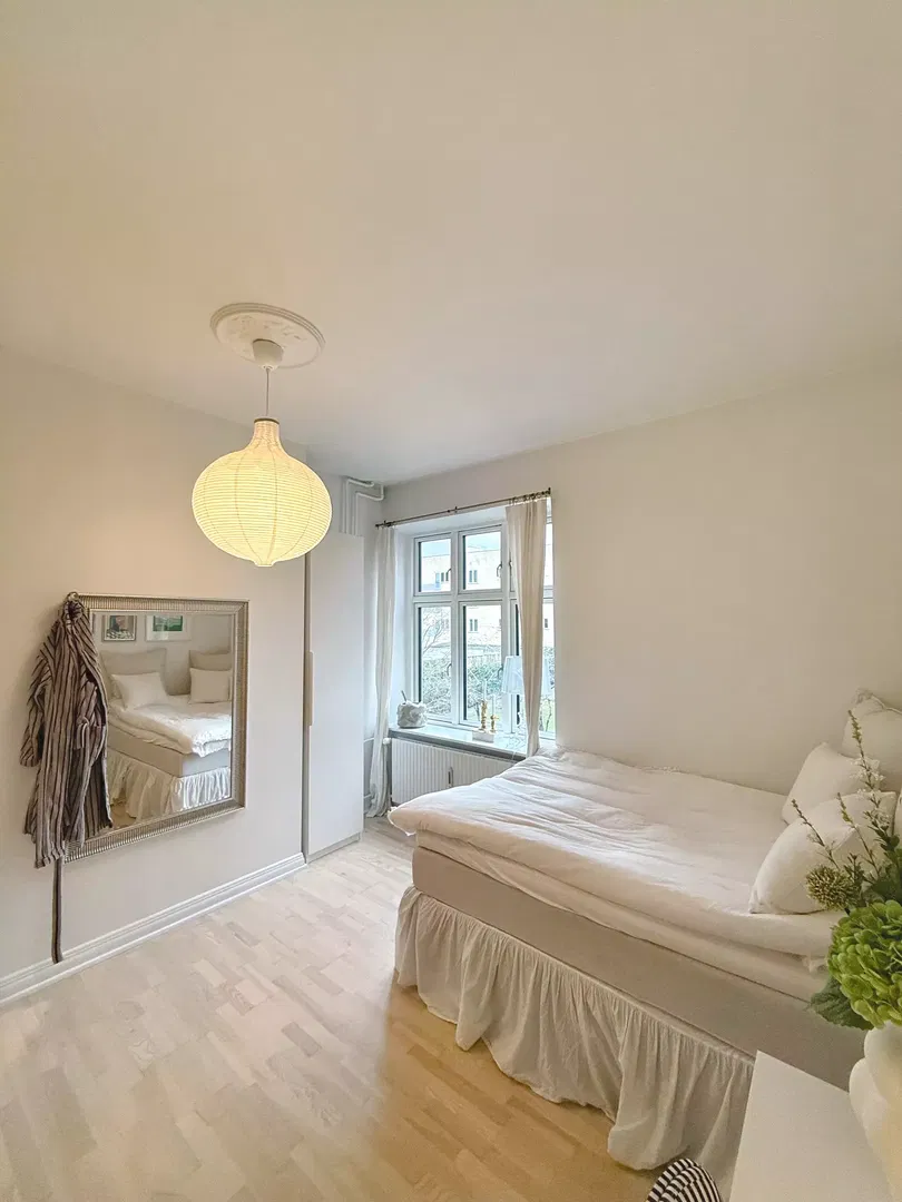 Køkkenet er opdateret med hvide elementer og klassiske fliser, udstyret med opvaskemaskine, indbygningsovn og kogeplade. Soveværelserne er lyse og indretningsvenlige, med plads til både seng, garderobe og skrivebord. Badeværelset er funktionelt indrettet med separat bruseafsnit og god skabsplads. Gennemgående trægulve bidrager til en rolig atmosfære, og flere rum vender mod gården, hvilket giver en fredelig hverdag.