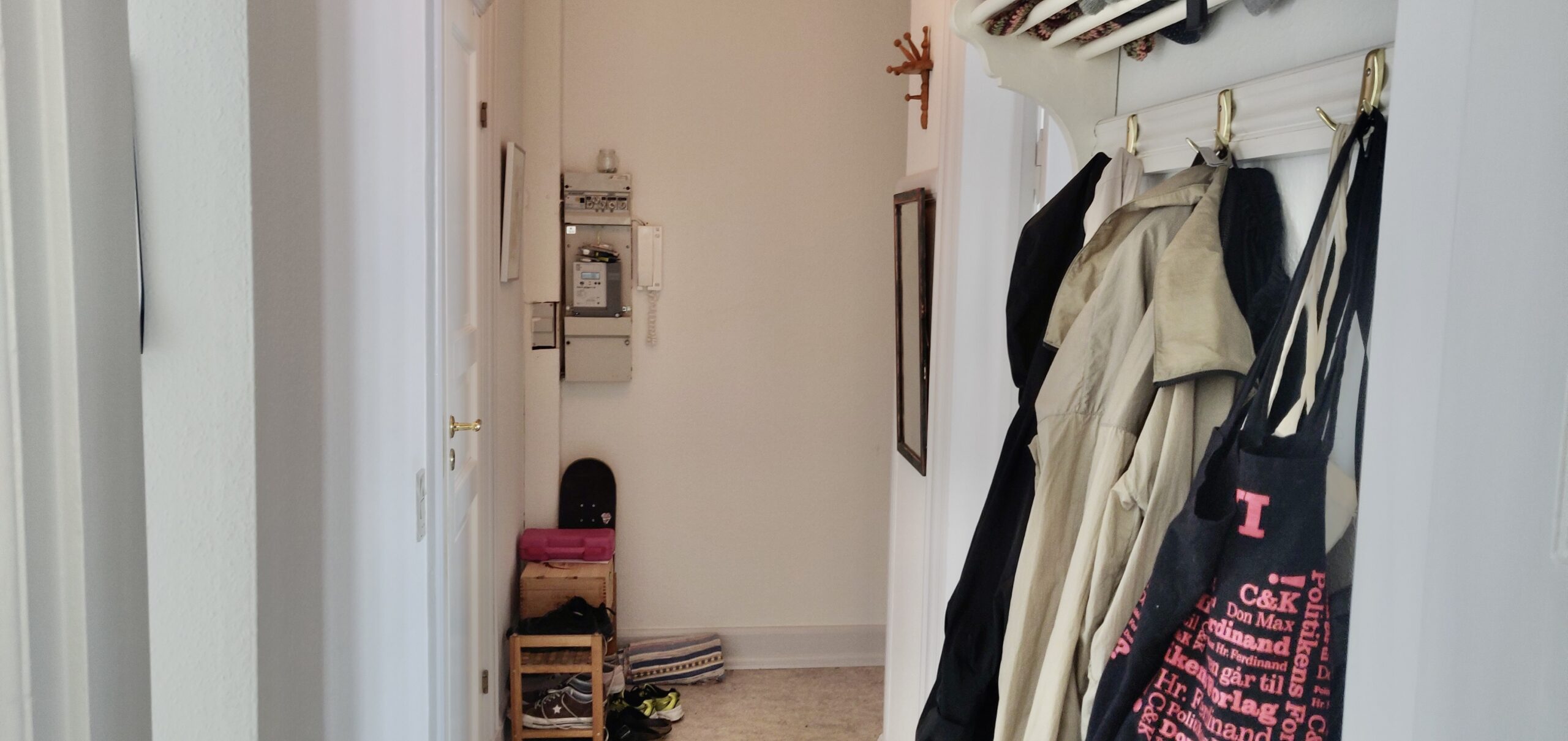 Lejligheden er bestående af en entré, hvor der er godt med plads til overtøj og sko. Det er en rigtig dejlig gang.