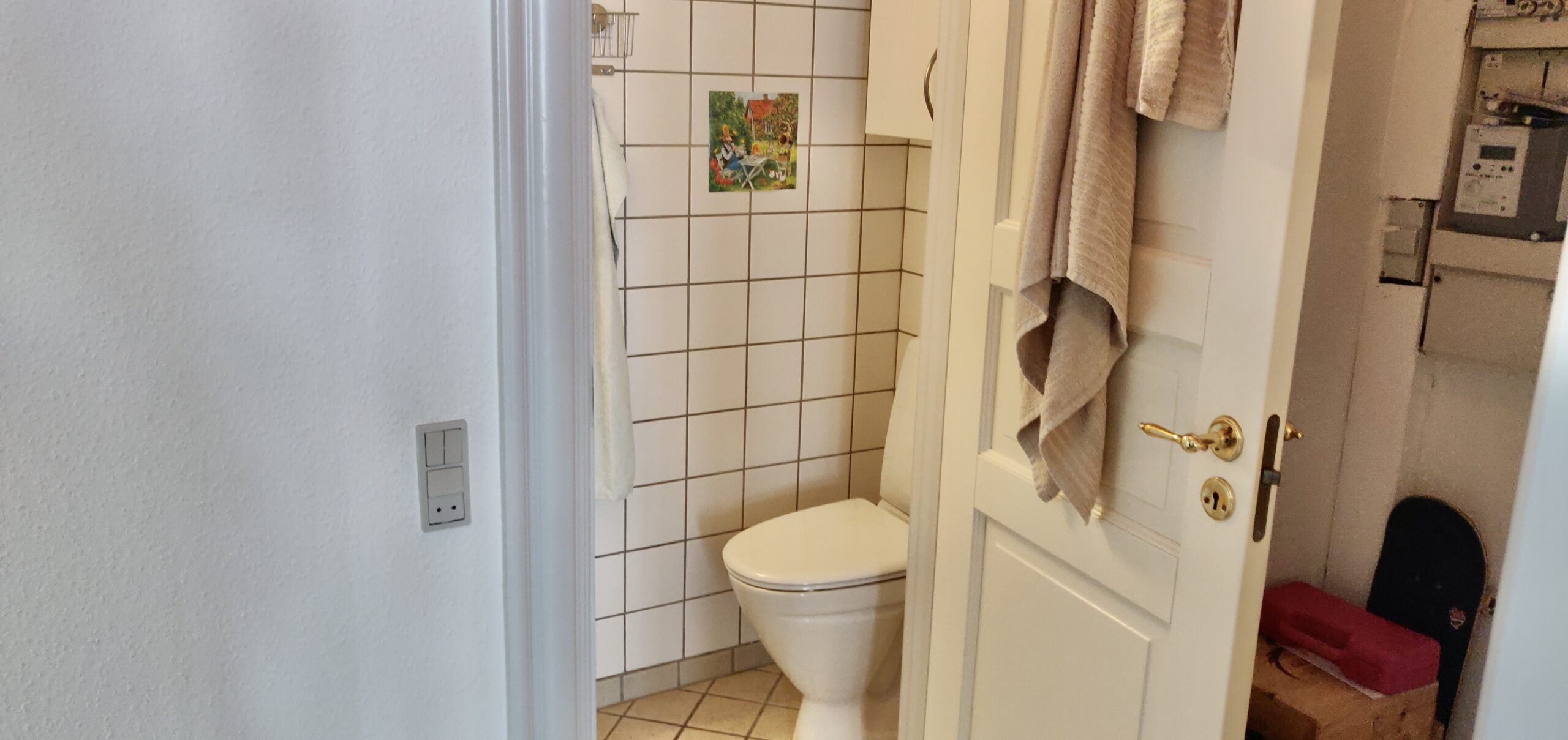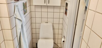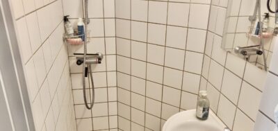 Derefter har vi badeværelset. Det er opdelt i toilet, og så håndvask og bruser. Det er en god løsning ift. at skulle bade oveni toilettet.