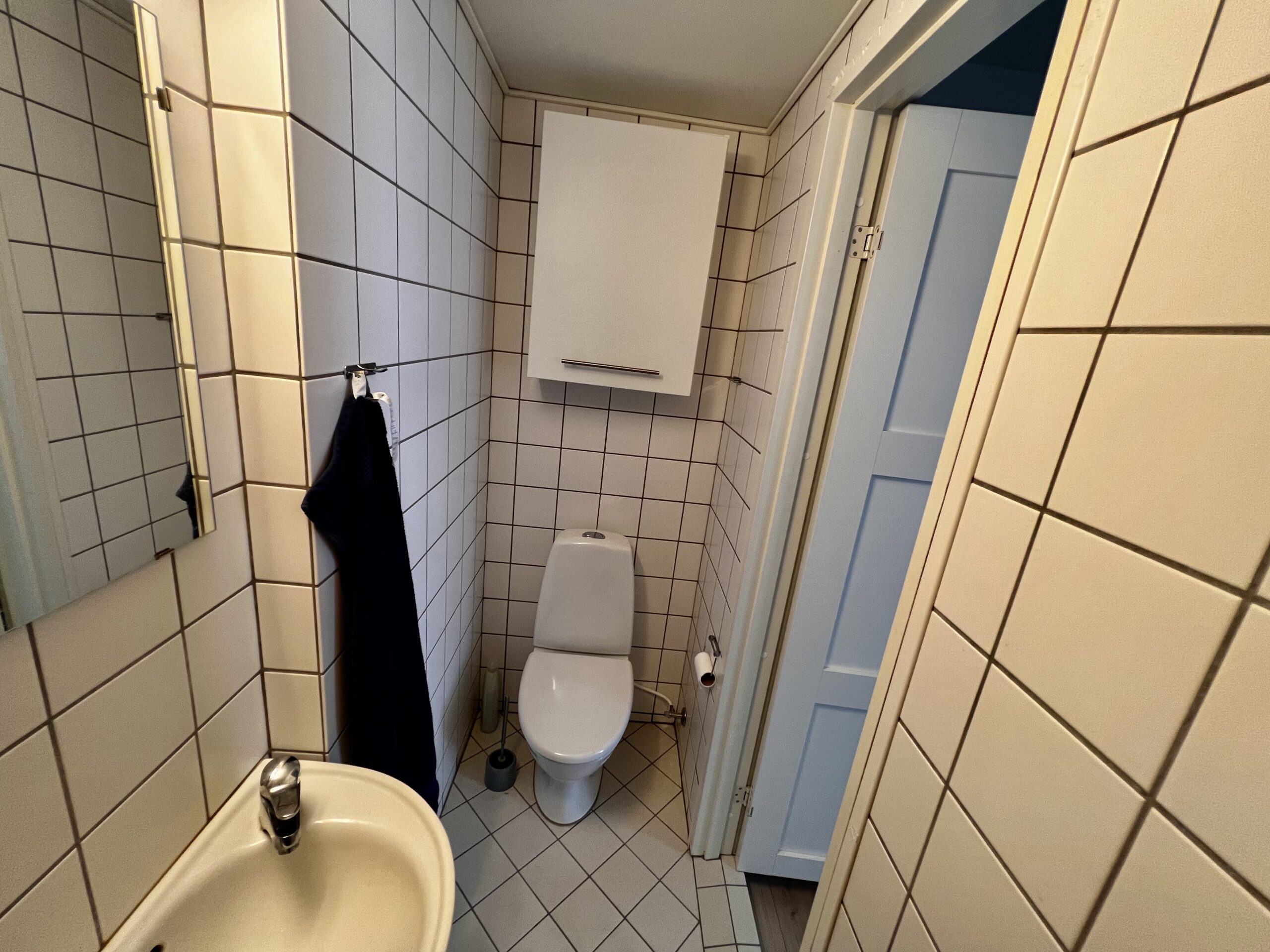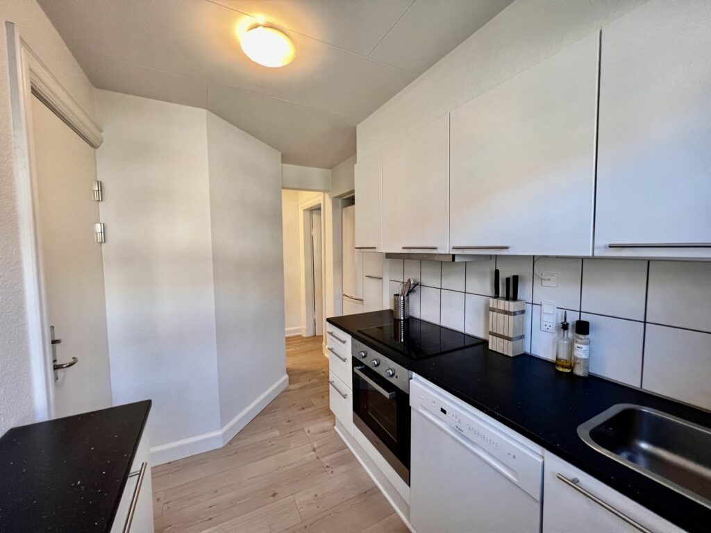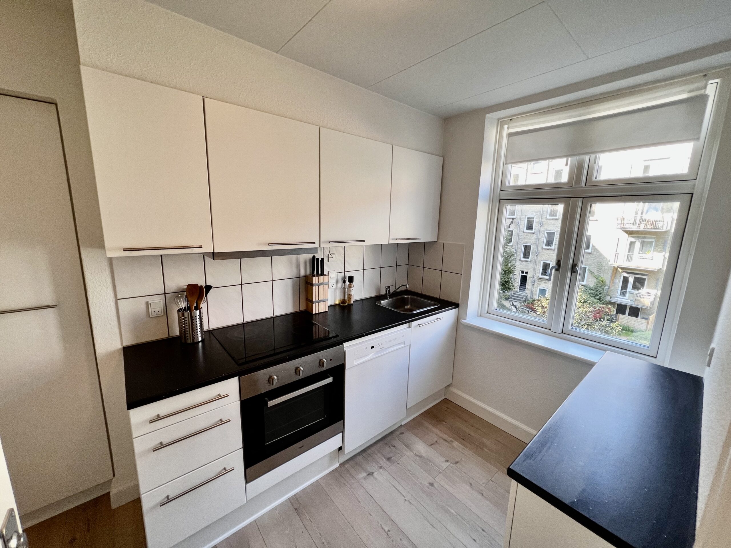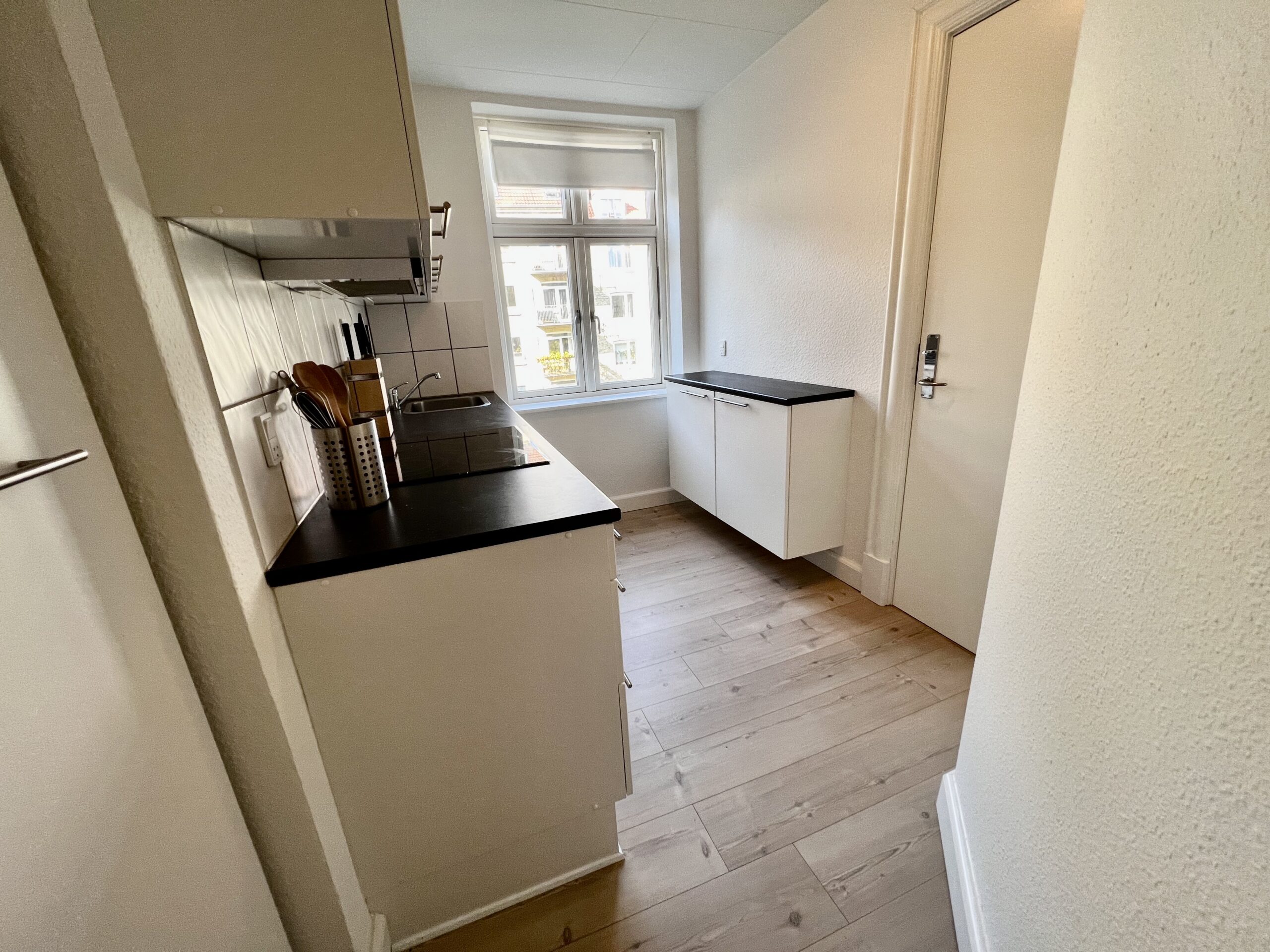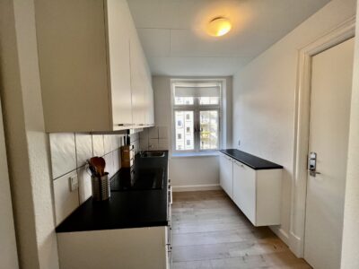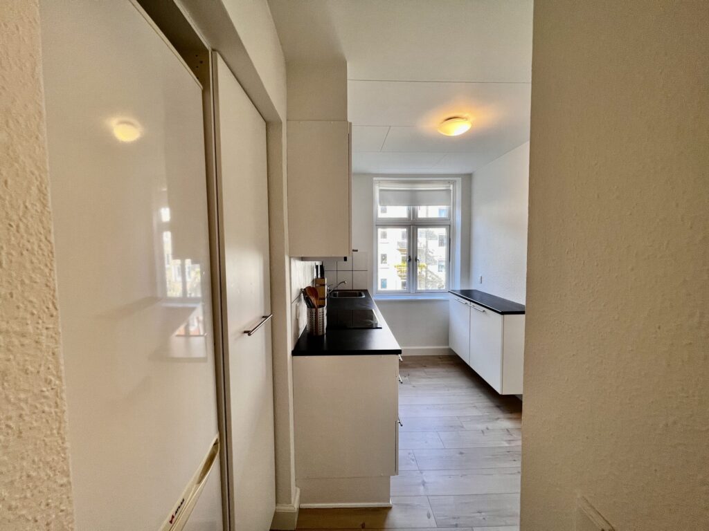 Køkkenet er en ægte perle med sine moderne, hvide elementer, der lyser rummet op. Her er der endda mulighed for at installere en opvaskemaskine, der gør hverdagen endnu mere bekvem. Køleskab medbringer du selv, så du kan tilpasse det præcis efter dine behov.