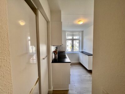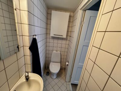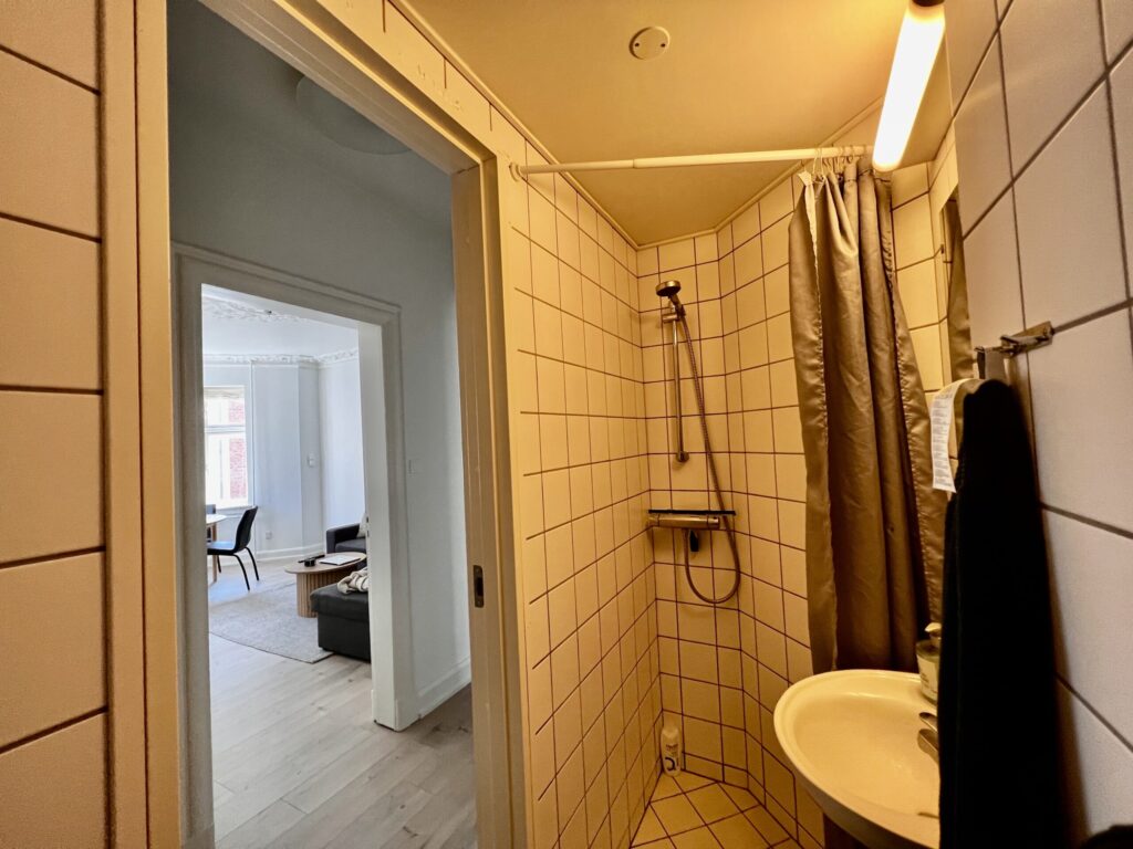 Badeværelset er indbydende og velindrettet med en separat brus, der gør det funktionelt og rummeligt, selvom det er aflangt og opdelt. Alt i alt byder denne lejlighed på en skøn kombination af stil, komfort og praktiske faciliteter, der gør den til det perfekte hjem for dig.