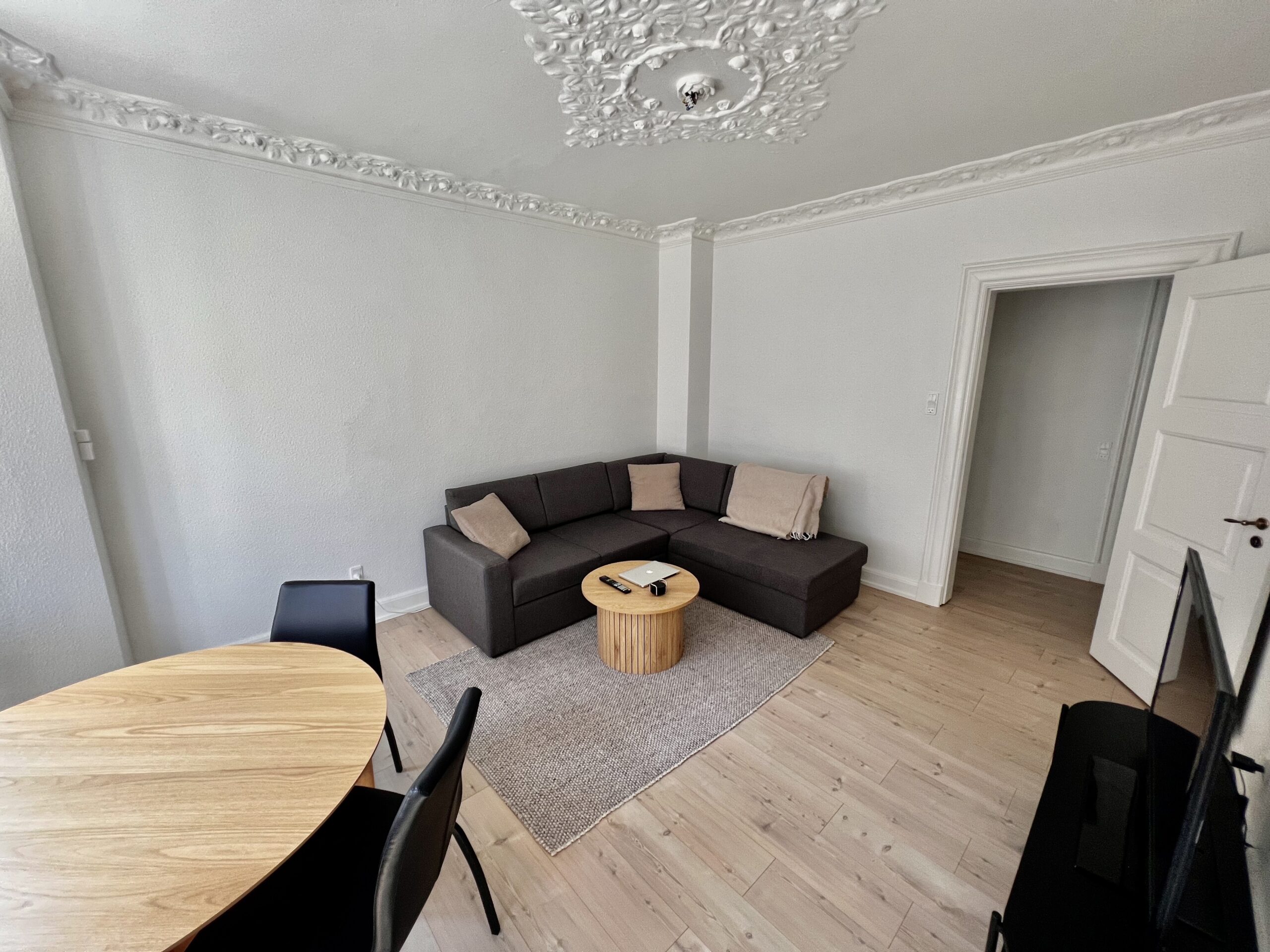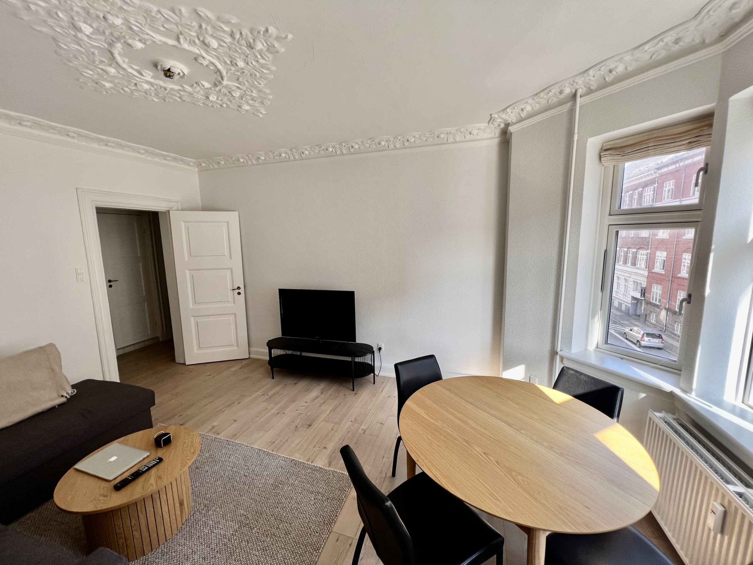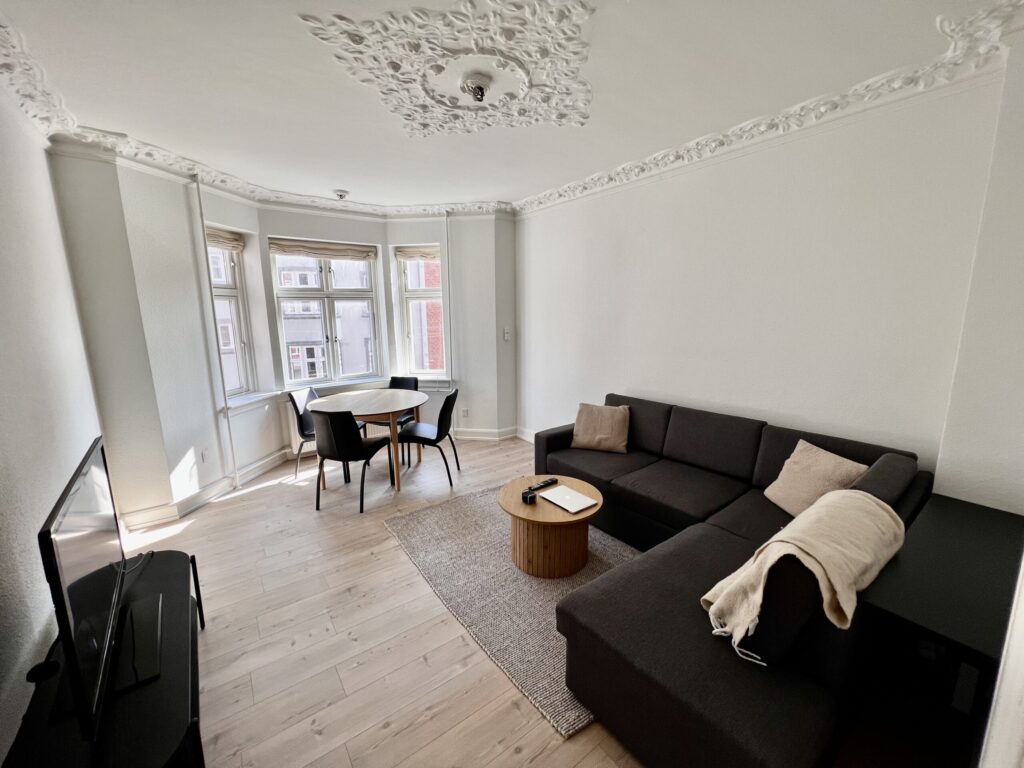 Stuen er et sandt højdepunkt i lejligheden, fyldt med naturligt lys takket være gode vinduer og en karnap. Dette rum er alsidigt og nemt at indrette, da du kan placere spisebordet ved karnappen og bruge resten af pladsen som en hyggelig tv-stue.