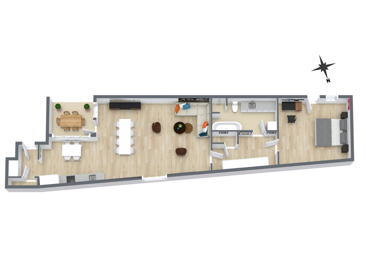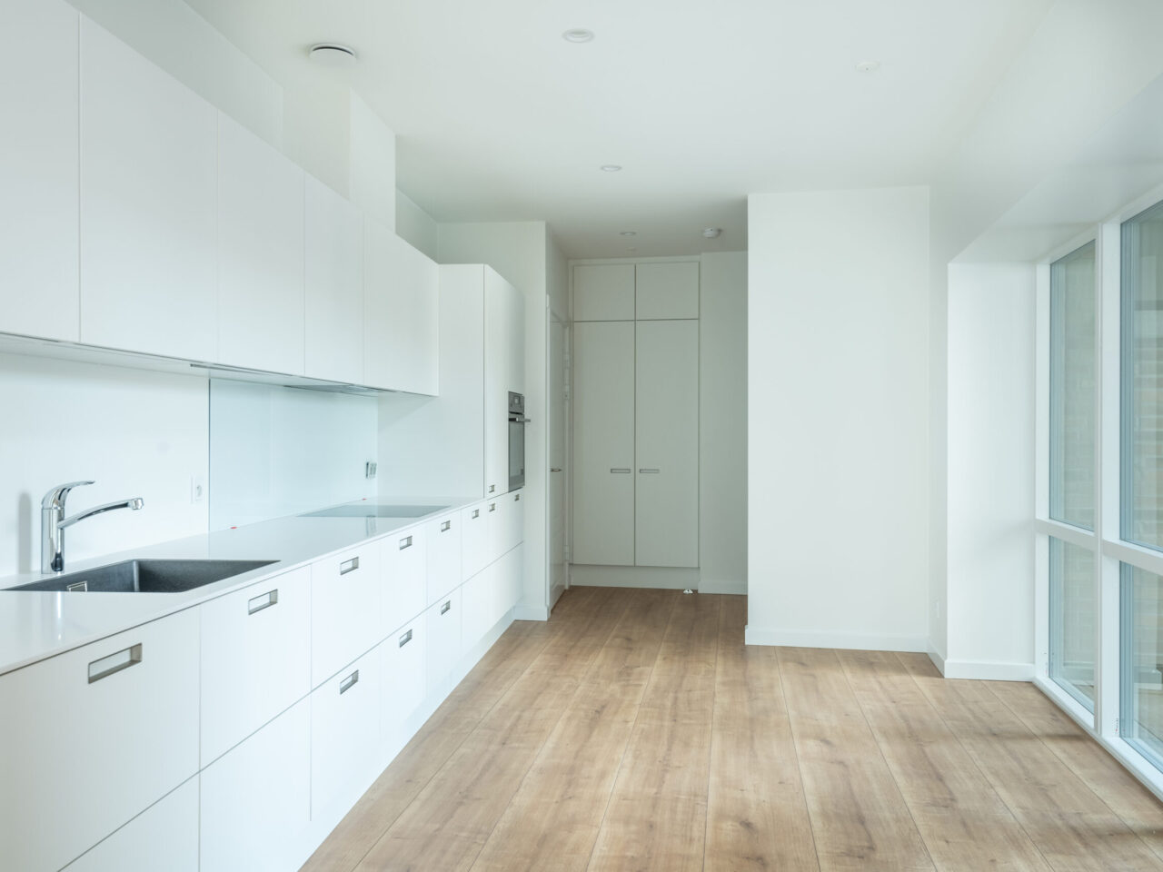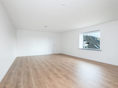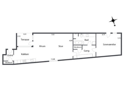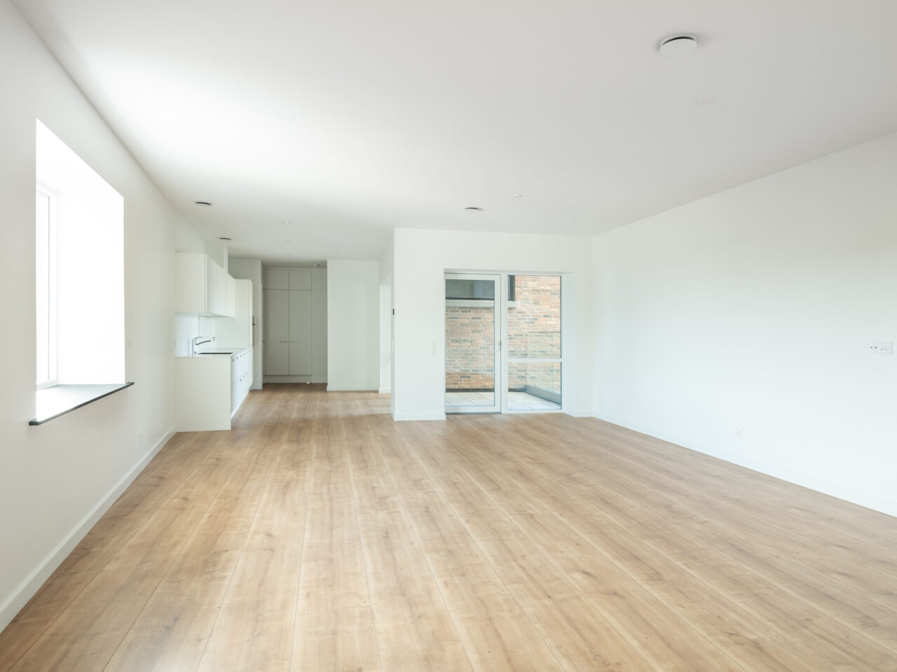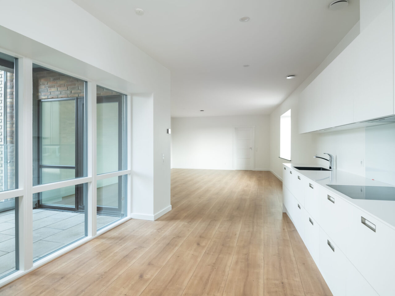 Lejlighederne er indrettet som en stor 2-værelses lejlighed på 140 kvm. Lejligheden indeholder entré med faste skabe. Herfra er der adgang til lejlighedens store lyse køkken/alrum. SVANE køkken med alt i hårde hvidevarer. Der er fra lejlighedens stue adgang til overdækket terrasse som vender ud mod Sallings gårdplads.