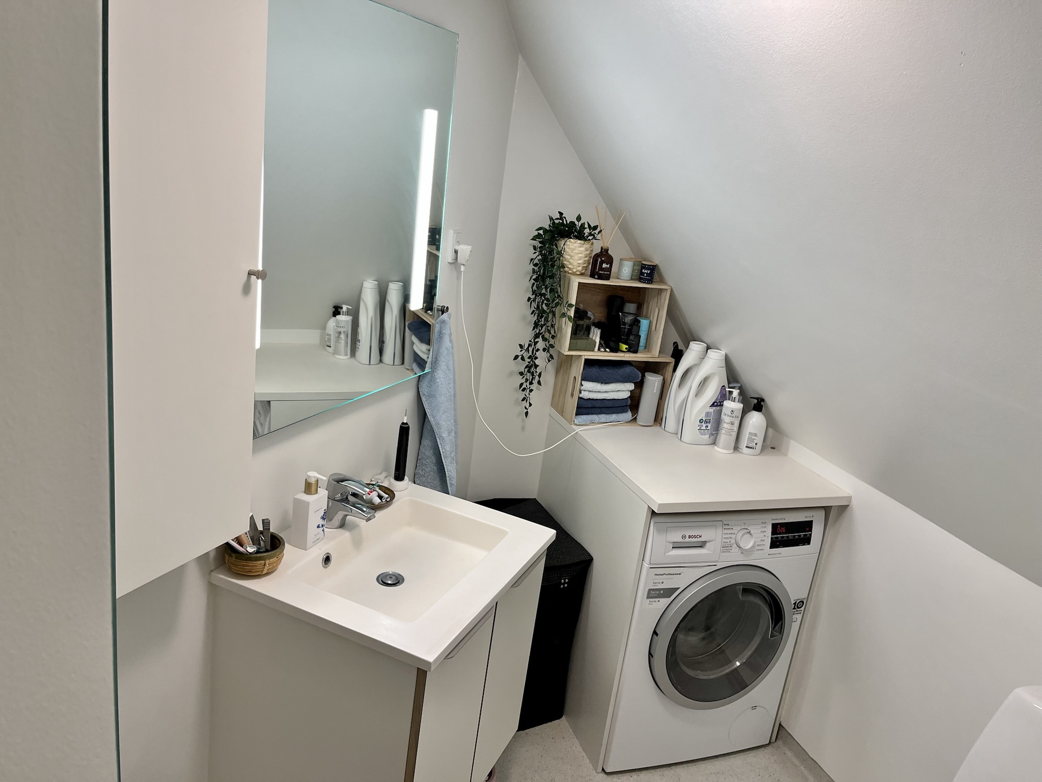 Lejligheden byder på en fin entré med skabsplads, et dejligt badeværelse med en god bruseniche og en praktisk kombineret vaske- og tørremaskine. Det moderne køkken, udstyret med kvalitetsinteriør fra Invita, har rigelig skabsplads og en hyggelig mulighed for spiseplads. Stuen er indbydende med skråvægge og et skønt lysindfald fra de charmerende karnapper, der skaber en varm og indbydende stemning. Et mindre soveværelse fuldender lejlighedens funktionalitet.