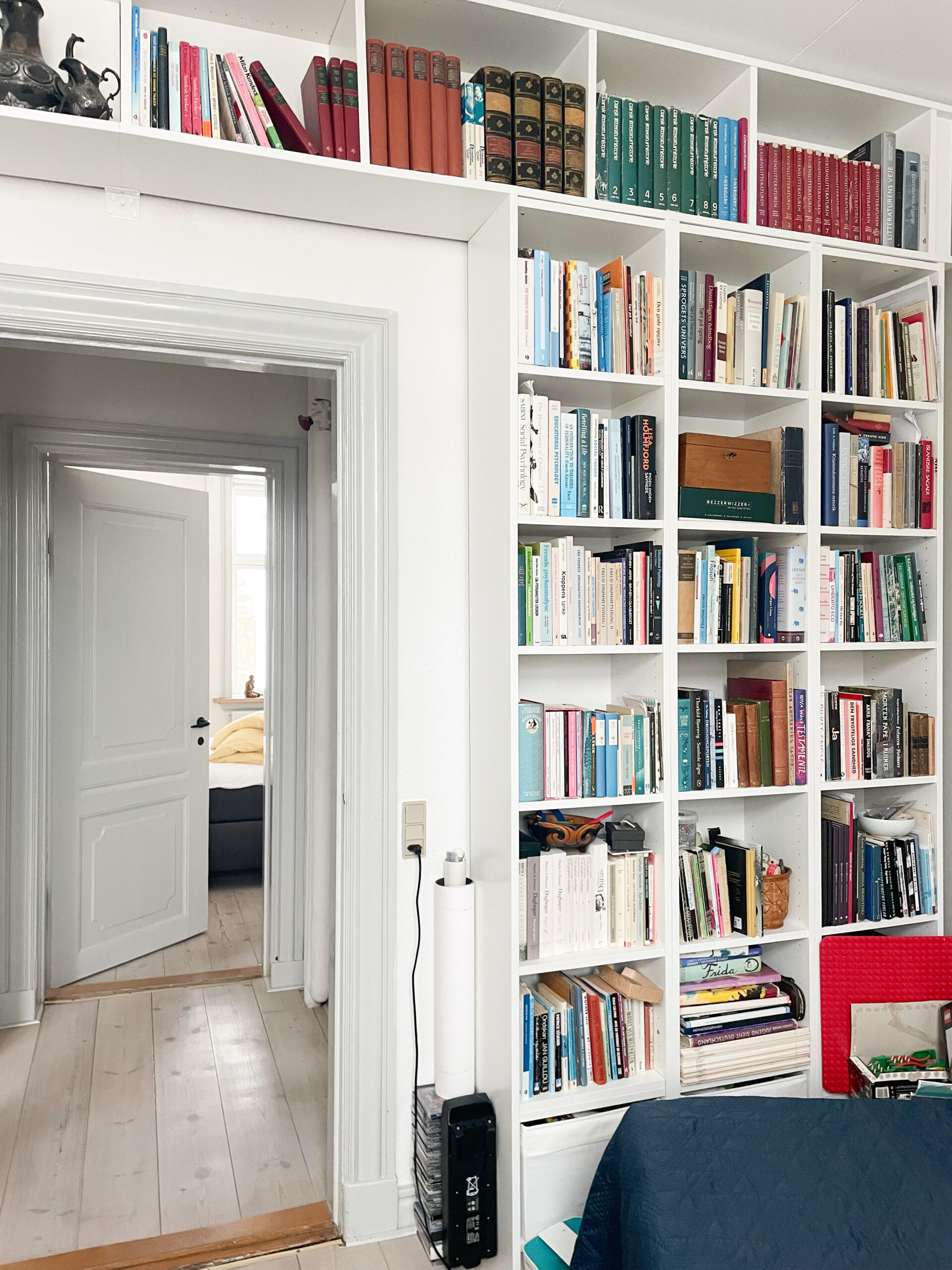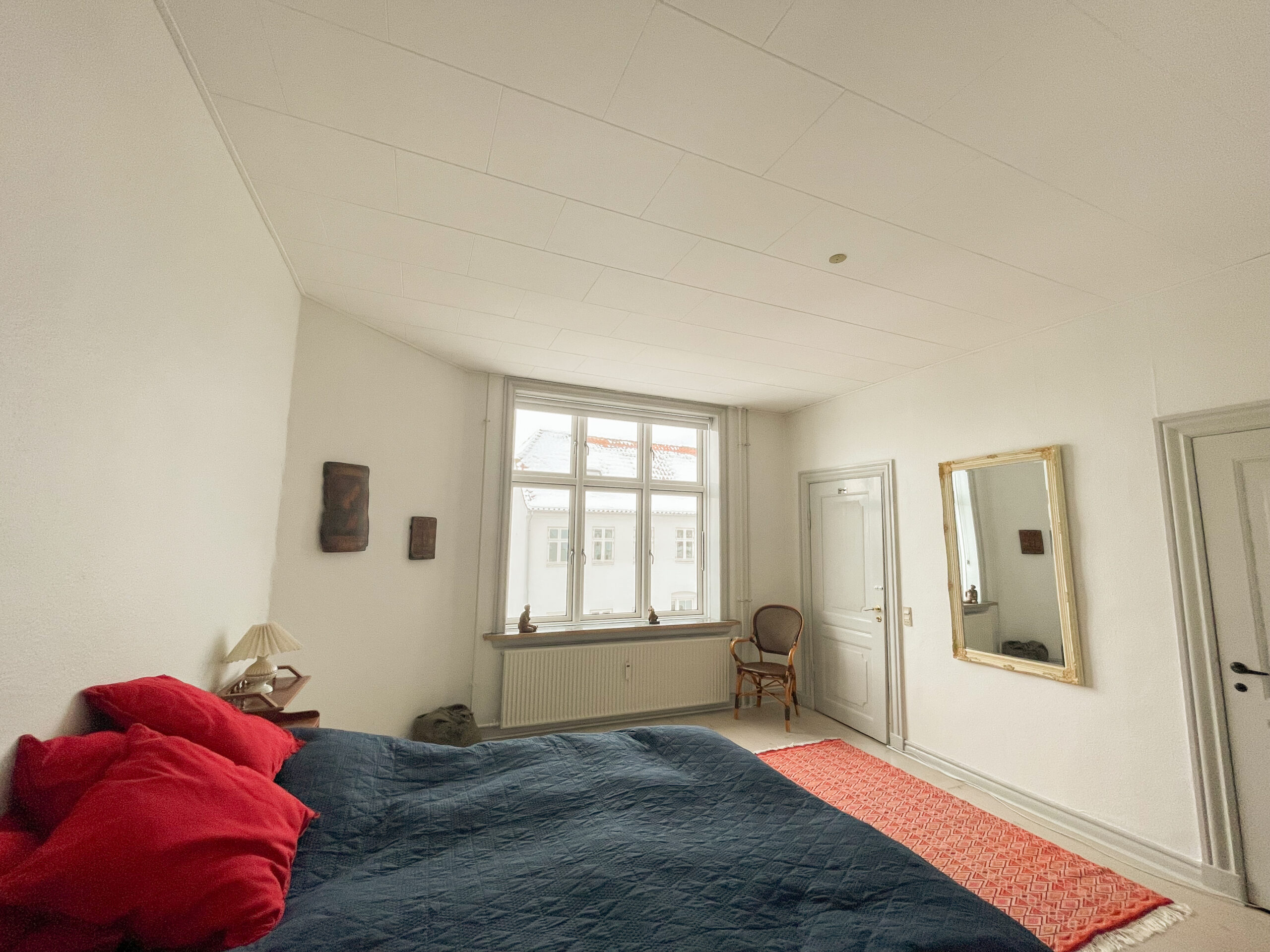 Fra stuen fører en fordelingsgang til lejlighedens øvrige rum. Her finder man et separat toilet, et mindre værelse, der egner sig perfekt som kontor, samt det dejlige soveværelse, som har plads til en stor seng og tilhørende møblement. Fra soveværelset er der direkte adgang til et privat badeværelse, som også rummer en vaskemaskine.