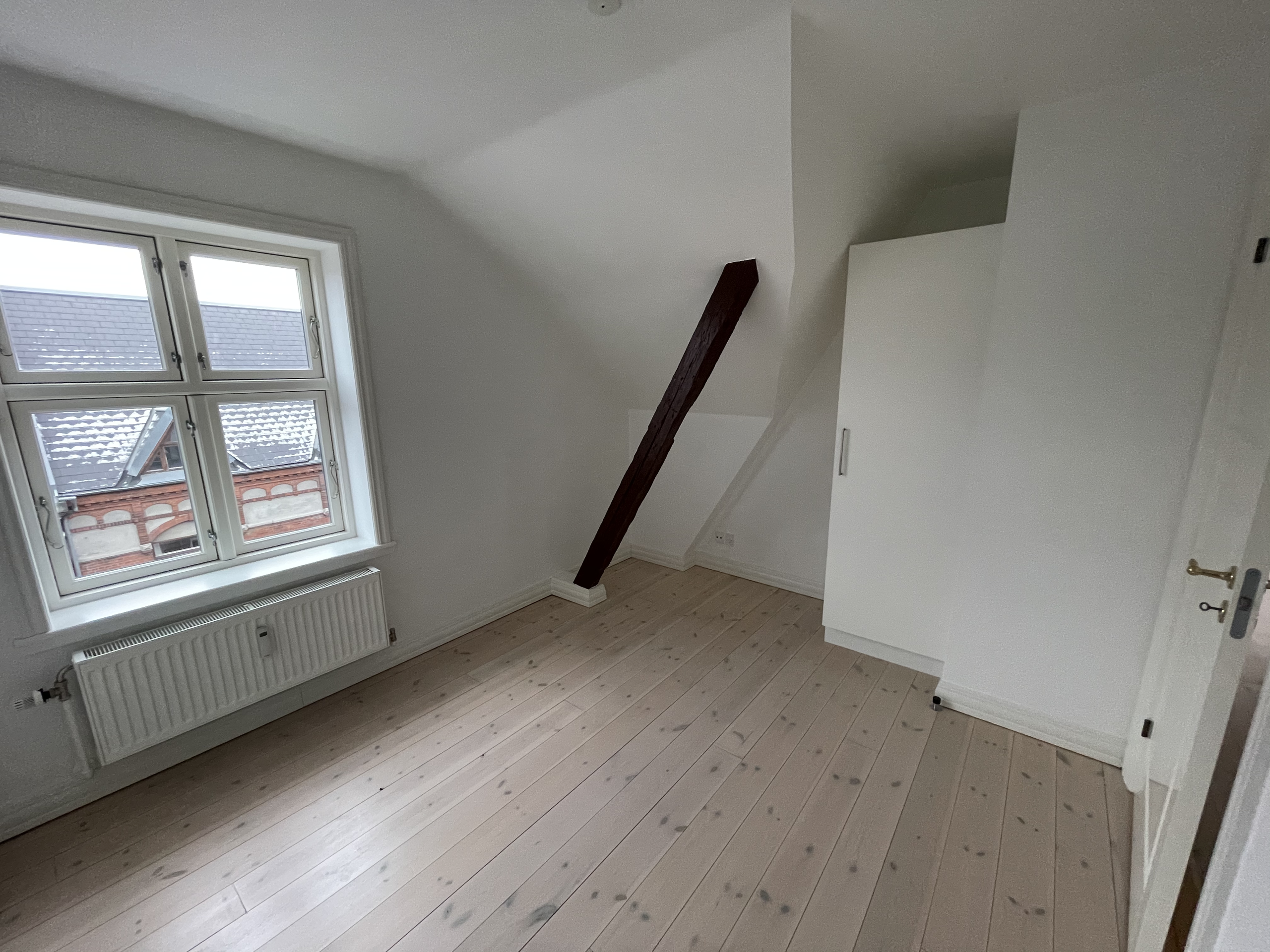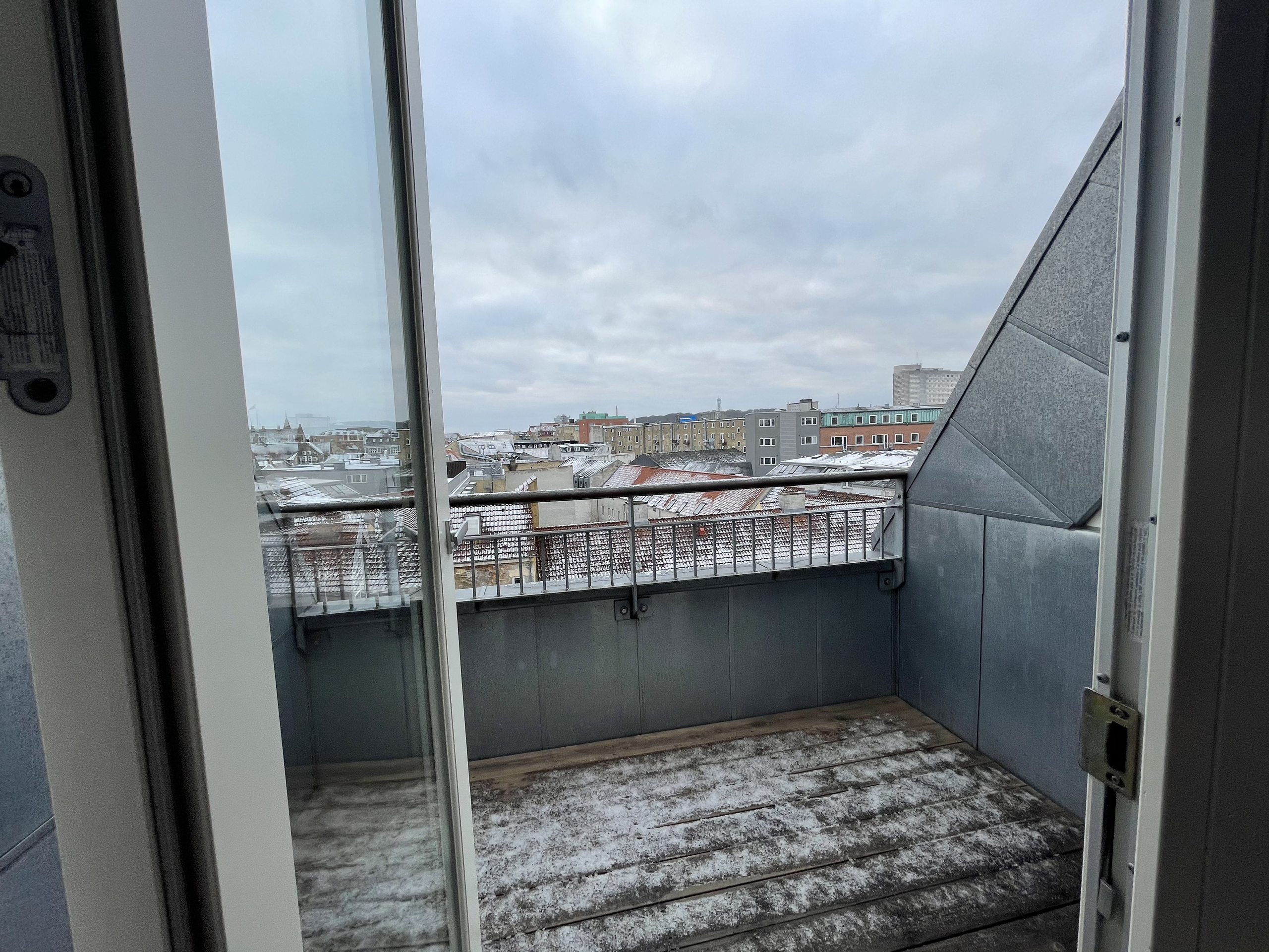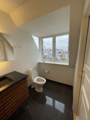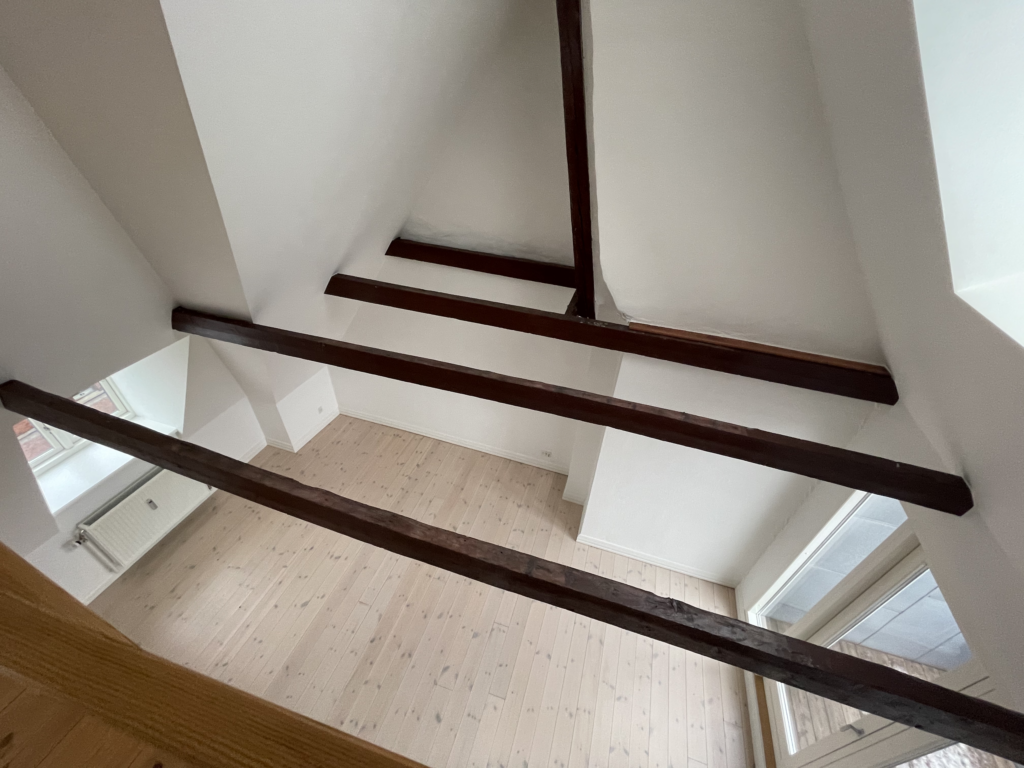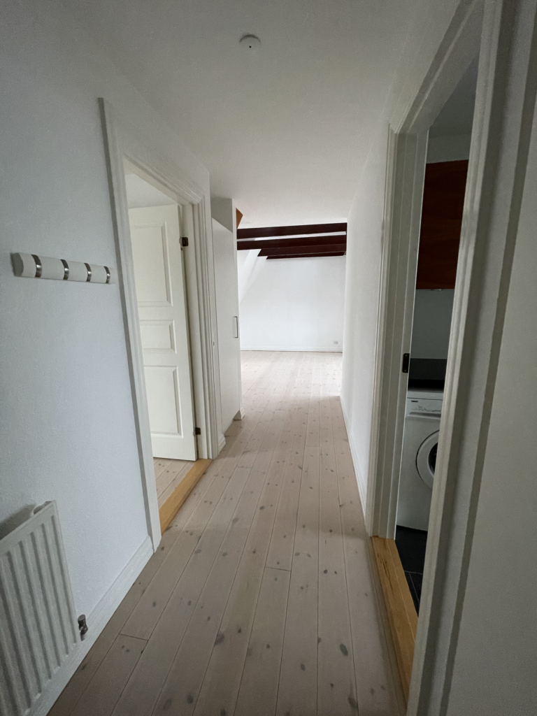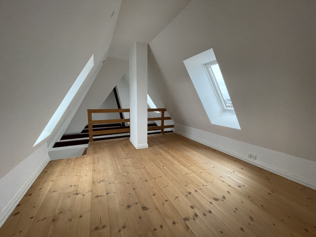 Lejligheden er ejendommens tagetage, hvor der er en dejlig afskærmet og indbygget tagterrasse med stikkontakt og udsigt over Aalborg. Lejligheden er med loft til kip samt med frithængende bjælker. Derudover har lejligheden er dejlig stor hems.