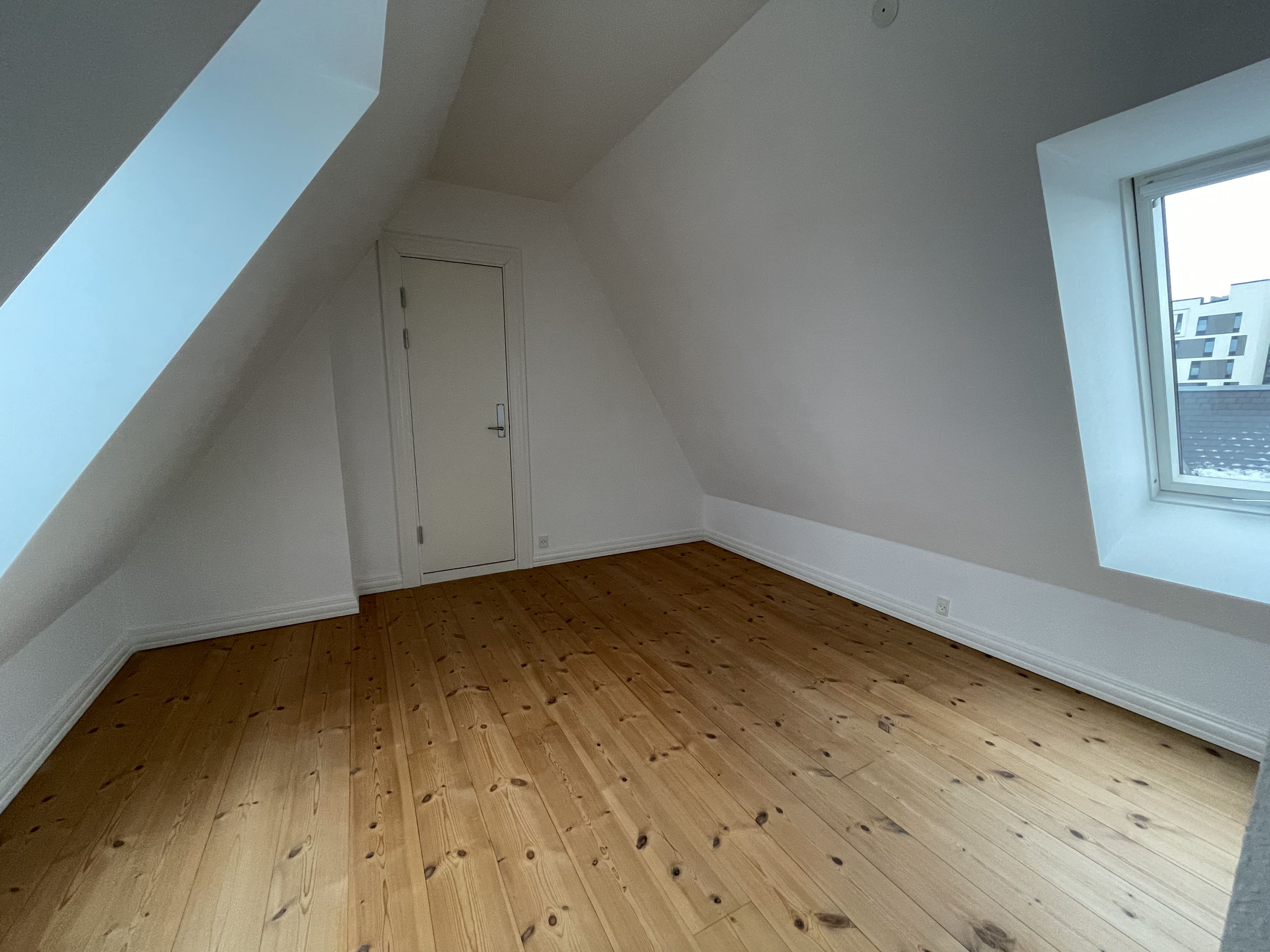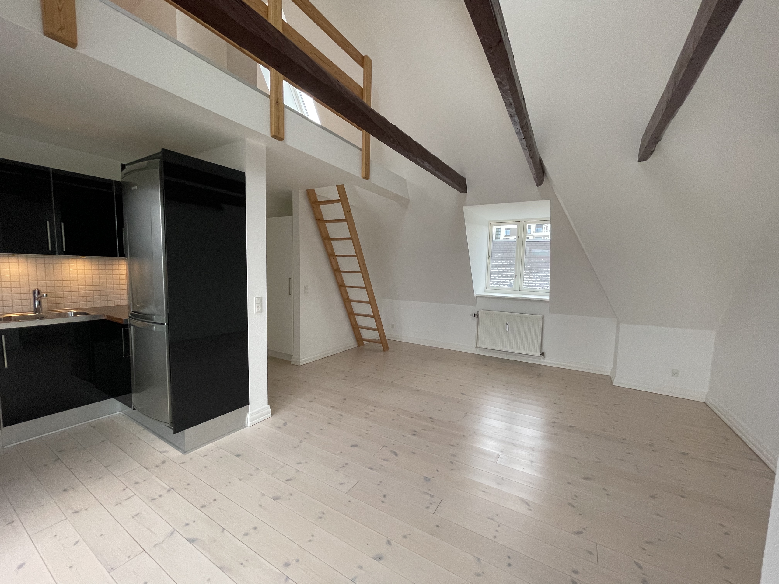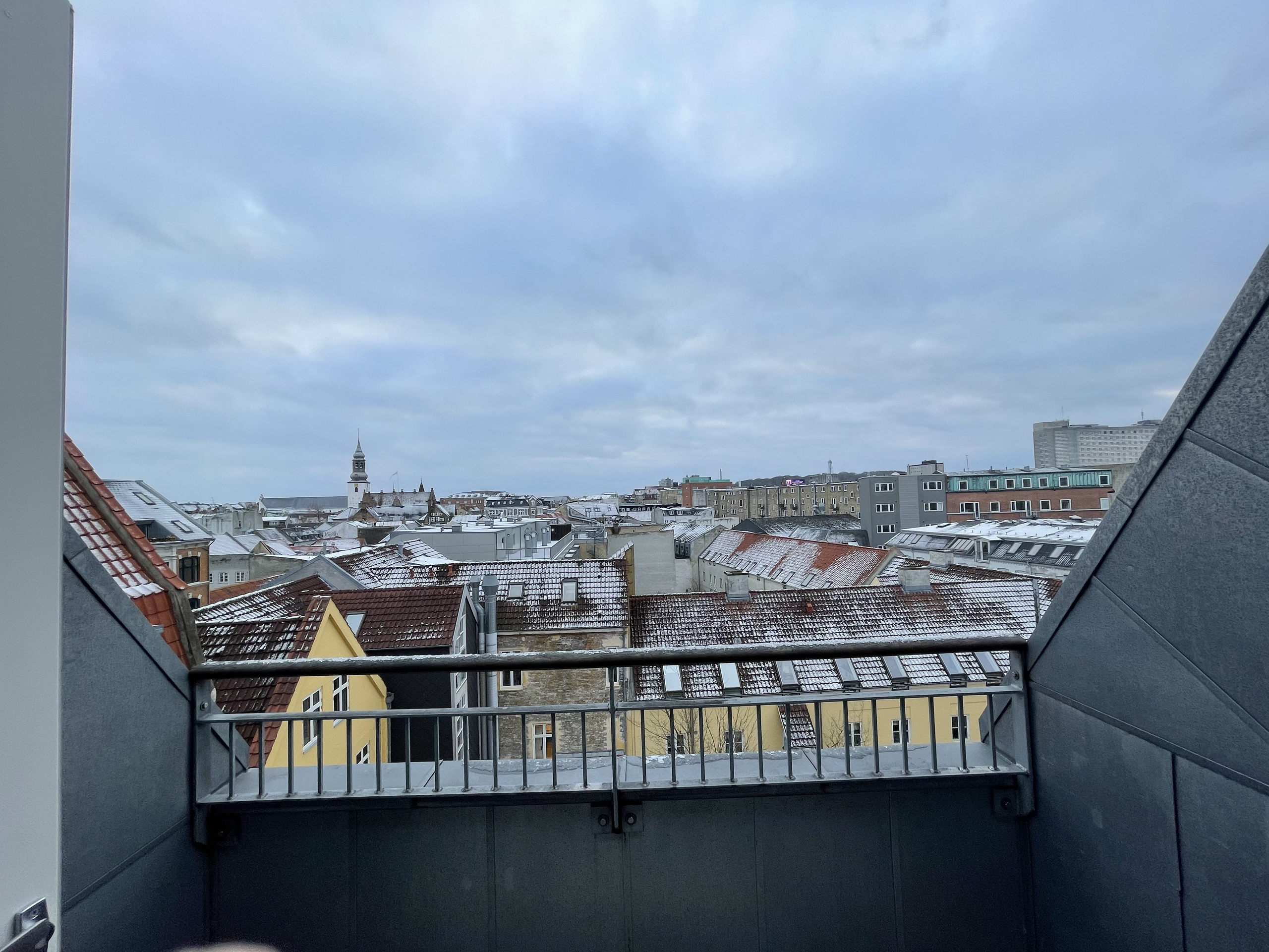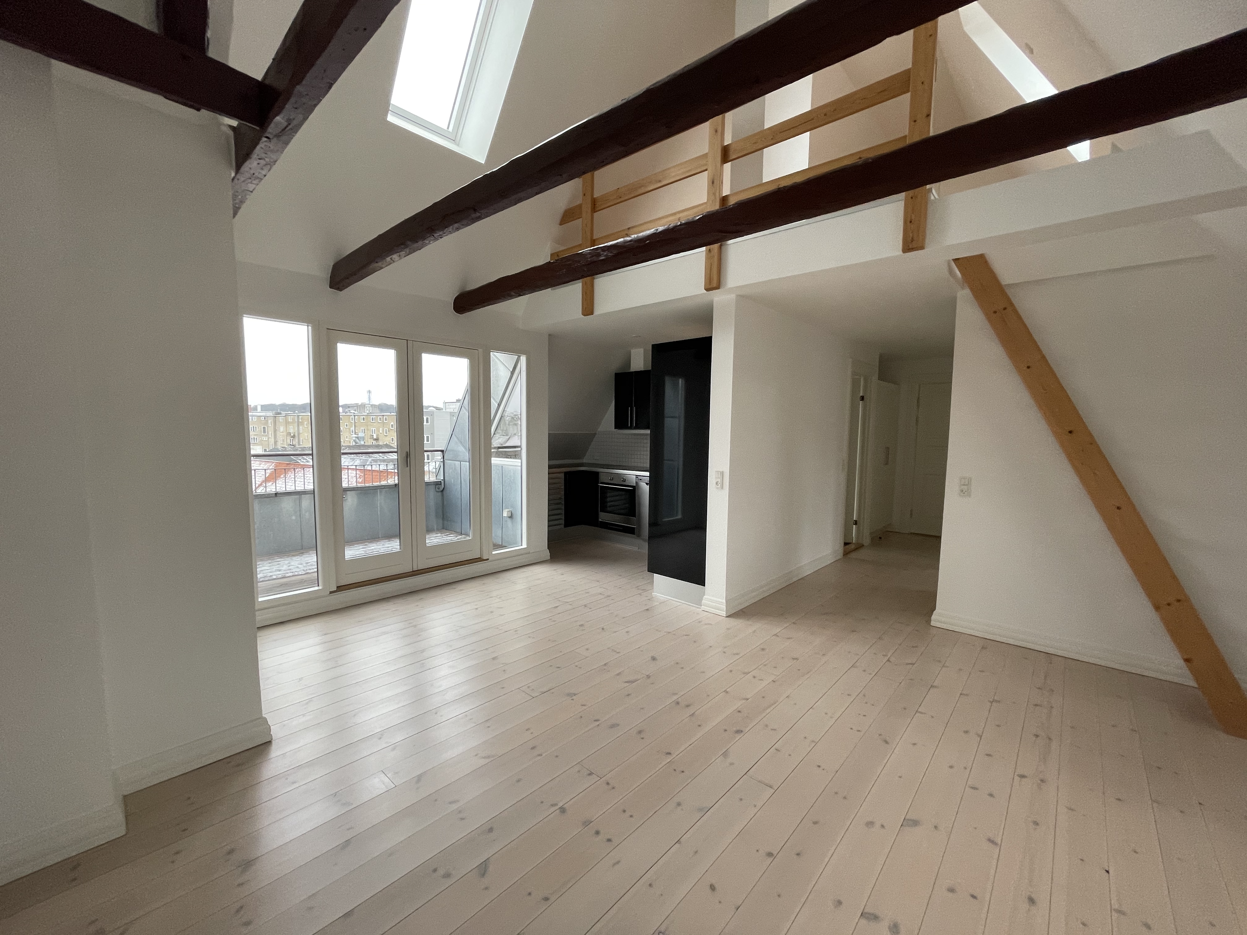 Lejligheden er ejendommens tagetage, hvor der er en dejlig afskærmet og indbygget tagterrasse med stikkontakt og udsigt over Aalborg. Lejligheden er med loft til kip samt med frithængende bjælker. Derudover har lejligheden er dejlig stor hems.
