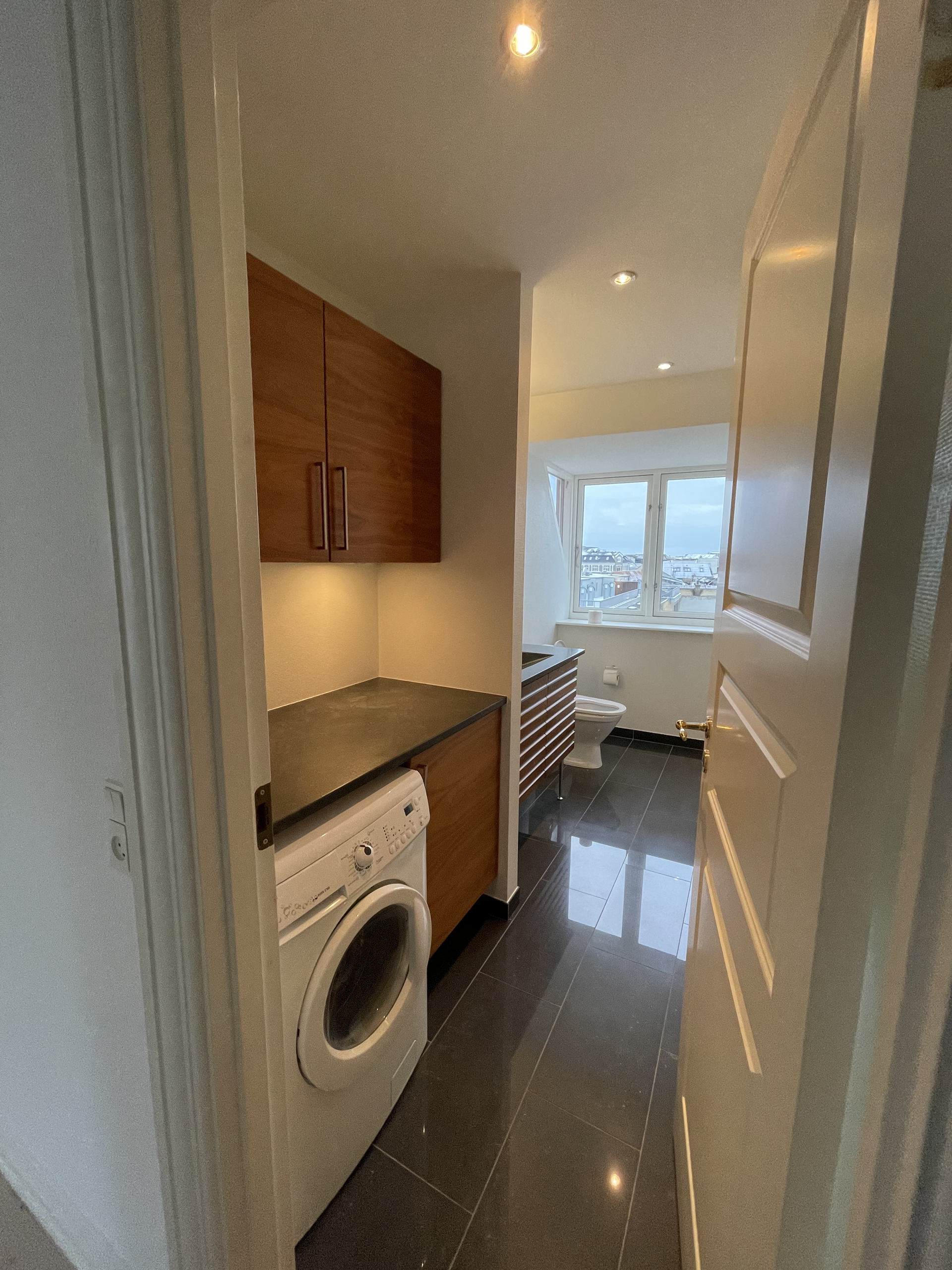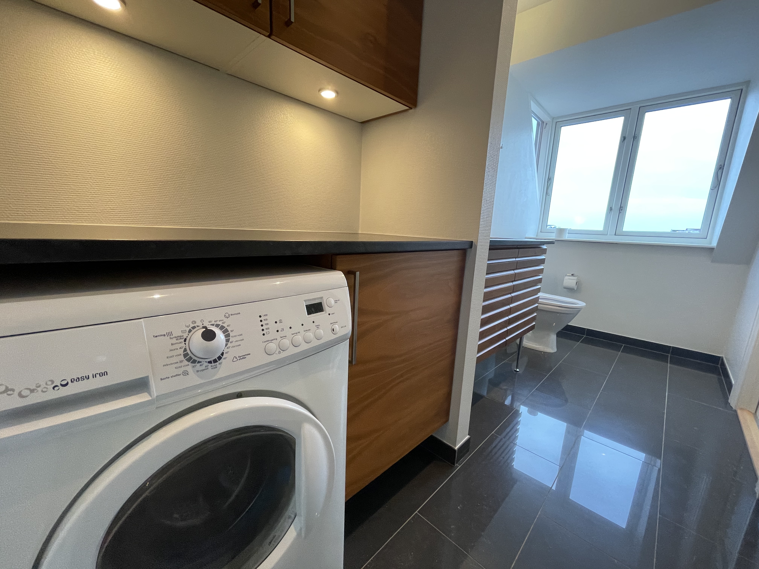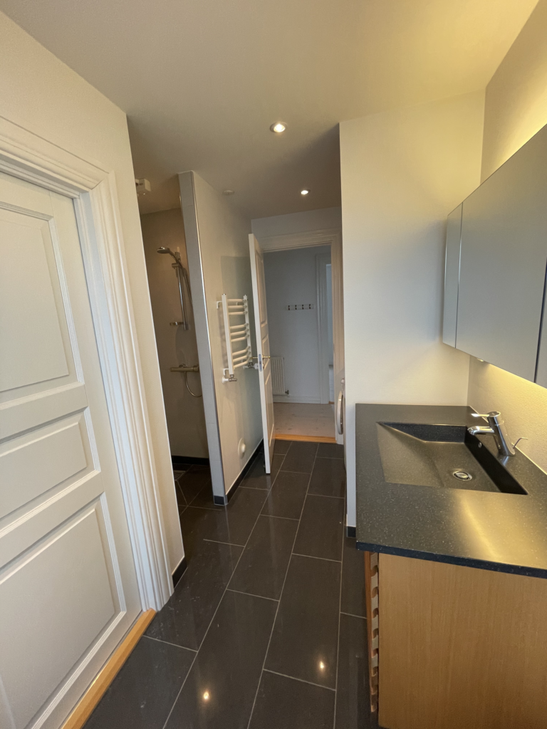 Badeværelset er med bordarrangement i valnød med integreret vask. Der er marmorfliser på gulv. Herudover er der installeret følgende:
