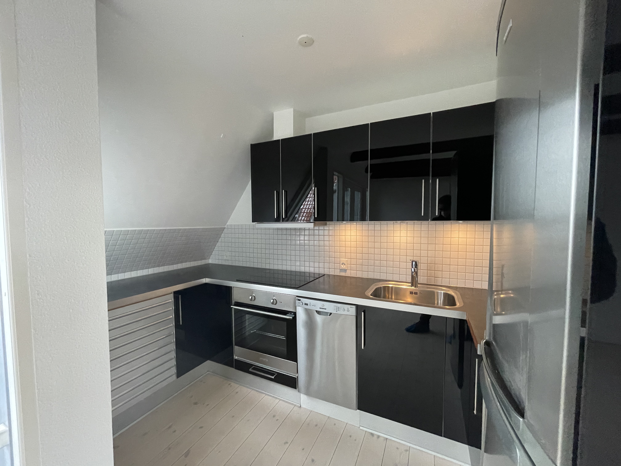 Lejligheden er indrettet med et sort højglans køkken med alukanter. Der er installeret følgende hårde hvidevarer: