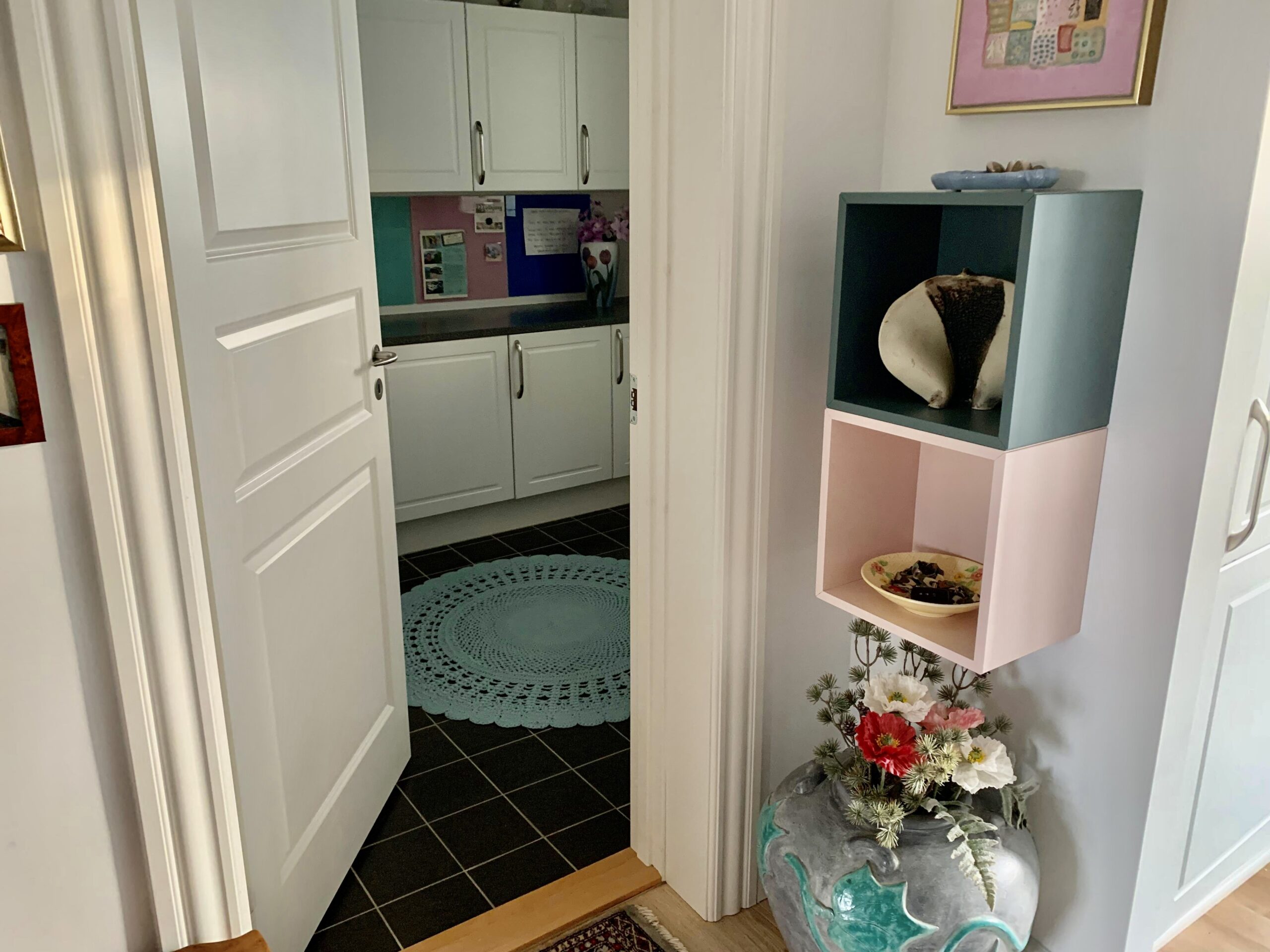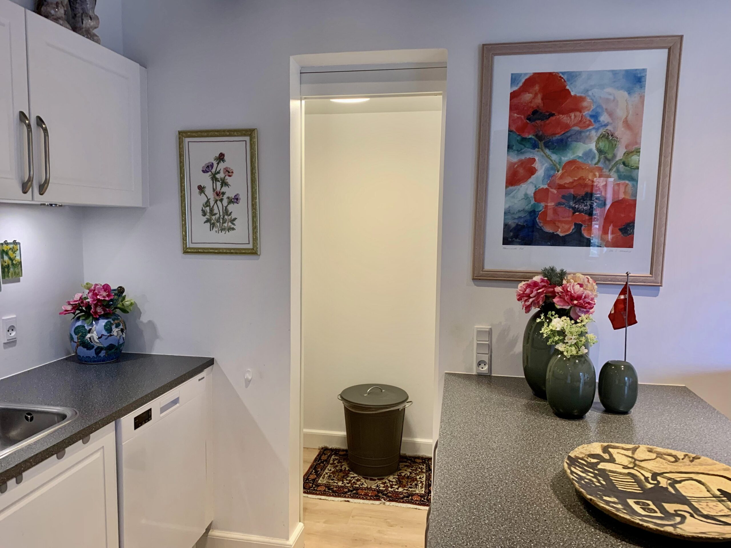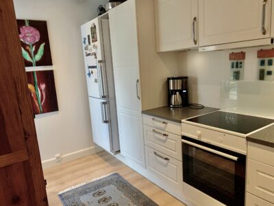 Når man træder lige ind i lejligheden har vi det store køkken-alrum, hvor der er to udgange til terrasse og græsareal. Til højre har vi køkkenet, som er rigtig stort med masser af bordplads samt skabsplads. Der er endda et viktoalierum til madvare. Super lækkert køkken. Der er selvfølgelig også installeret en opvaskemaskine.
