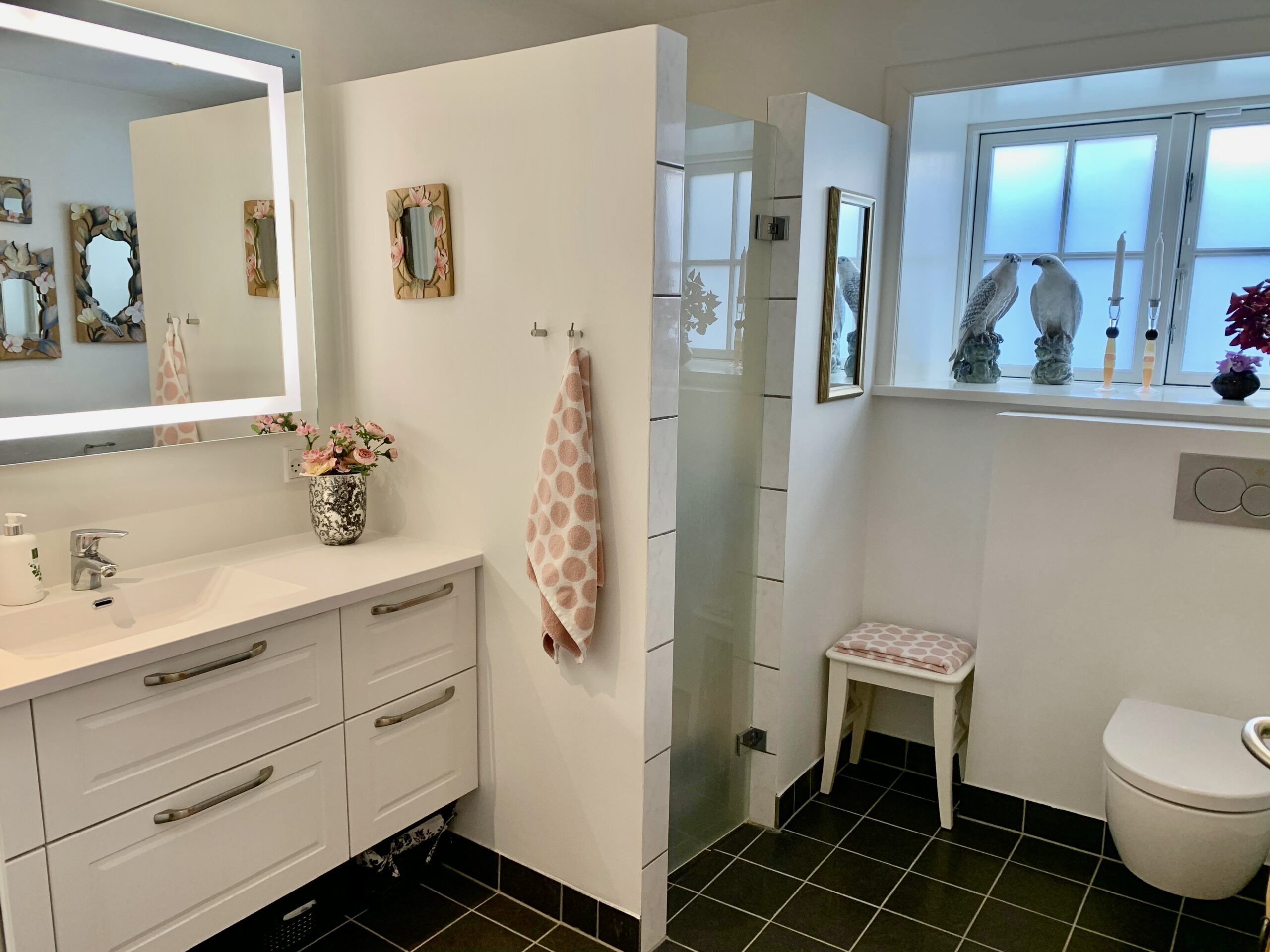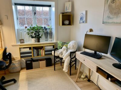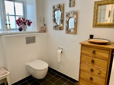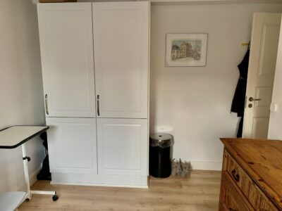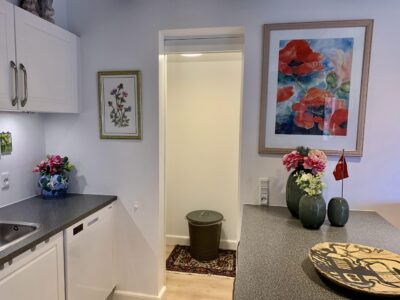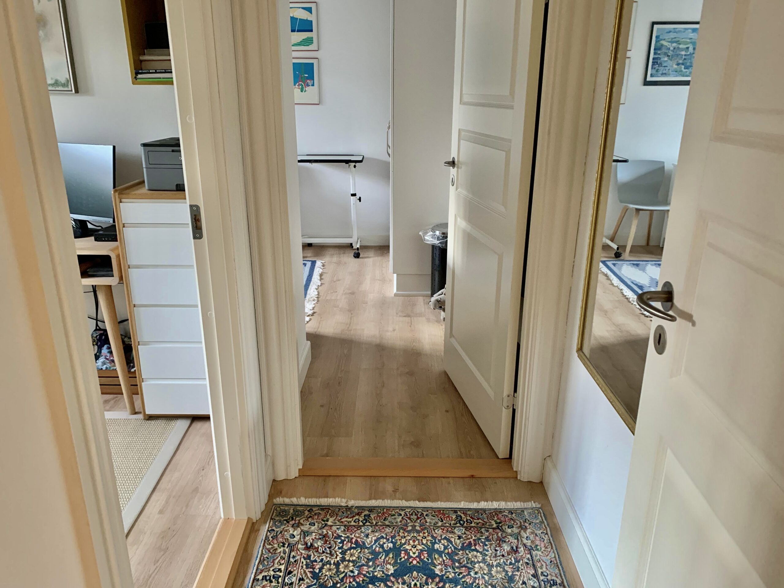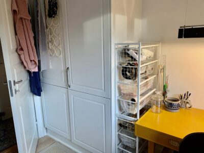 Til venstre for indgangen har vi en fordelingsgang, hvor vi har badeværelset, der ligeledes er rummeligt og har en god indbygget brusekabine. Dernæst kommer to værelser, hvorpå man på billederne kan se et sy-værelse og i bunden et gæsteværelse. Der er klædeskabe i begge rum, og er naturligvis også egnet til soveværelser.