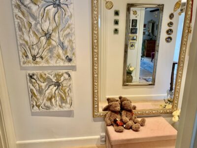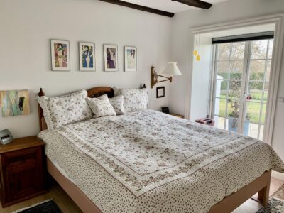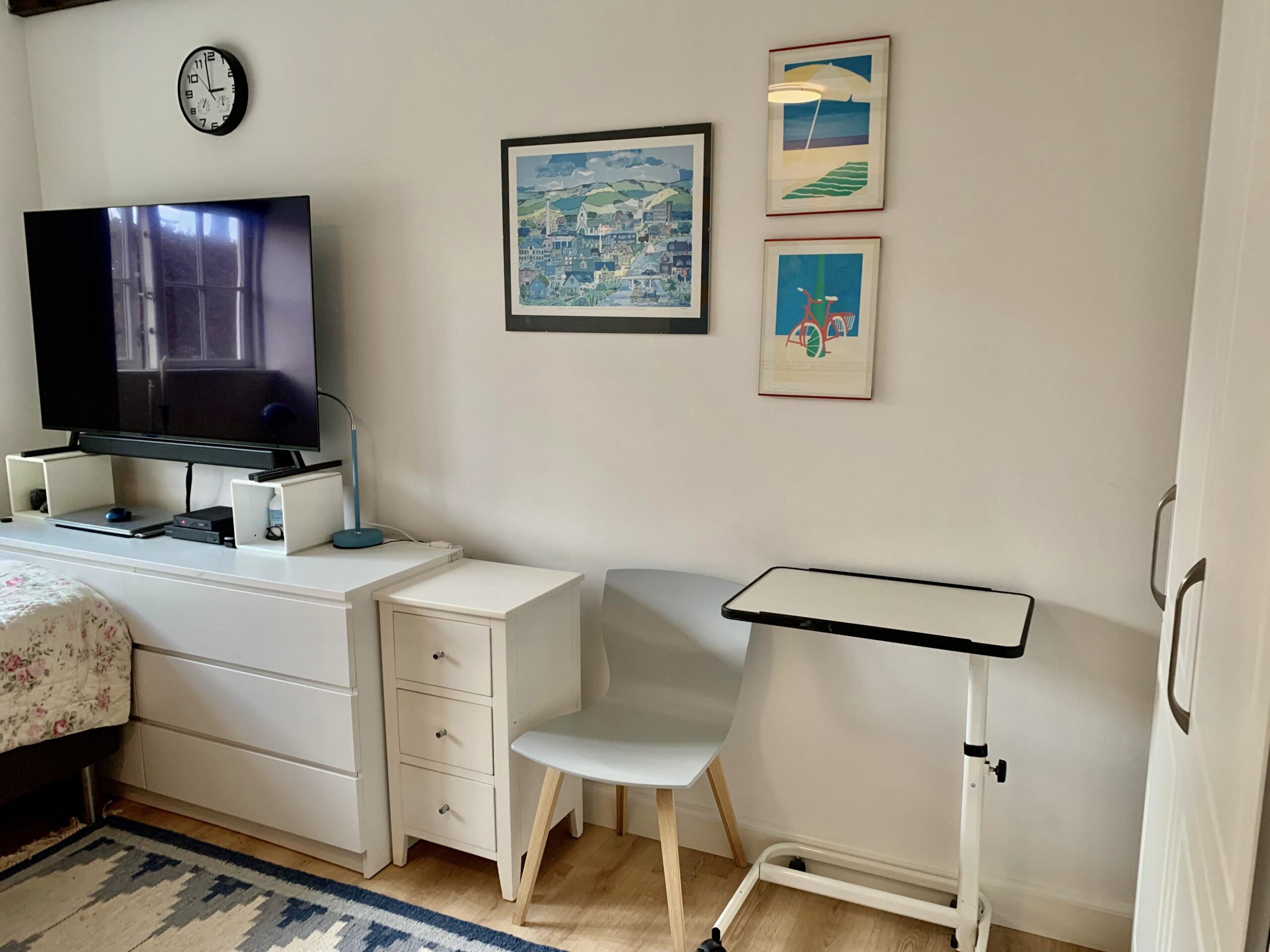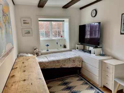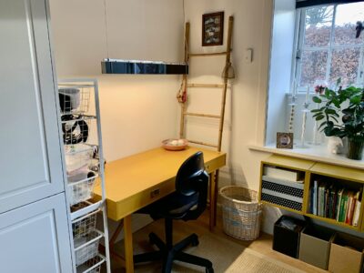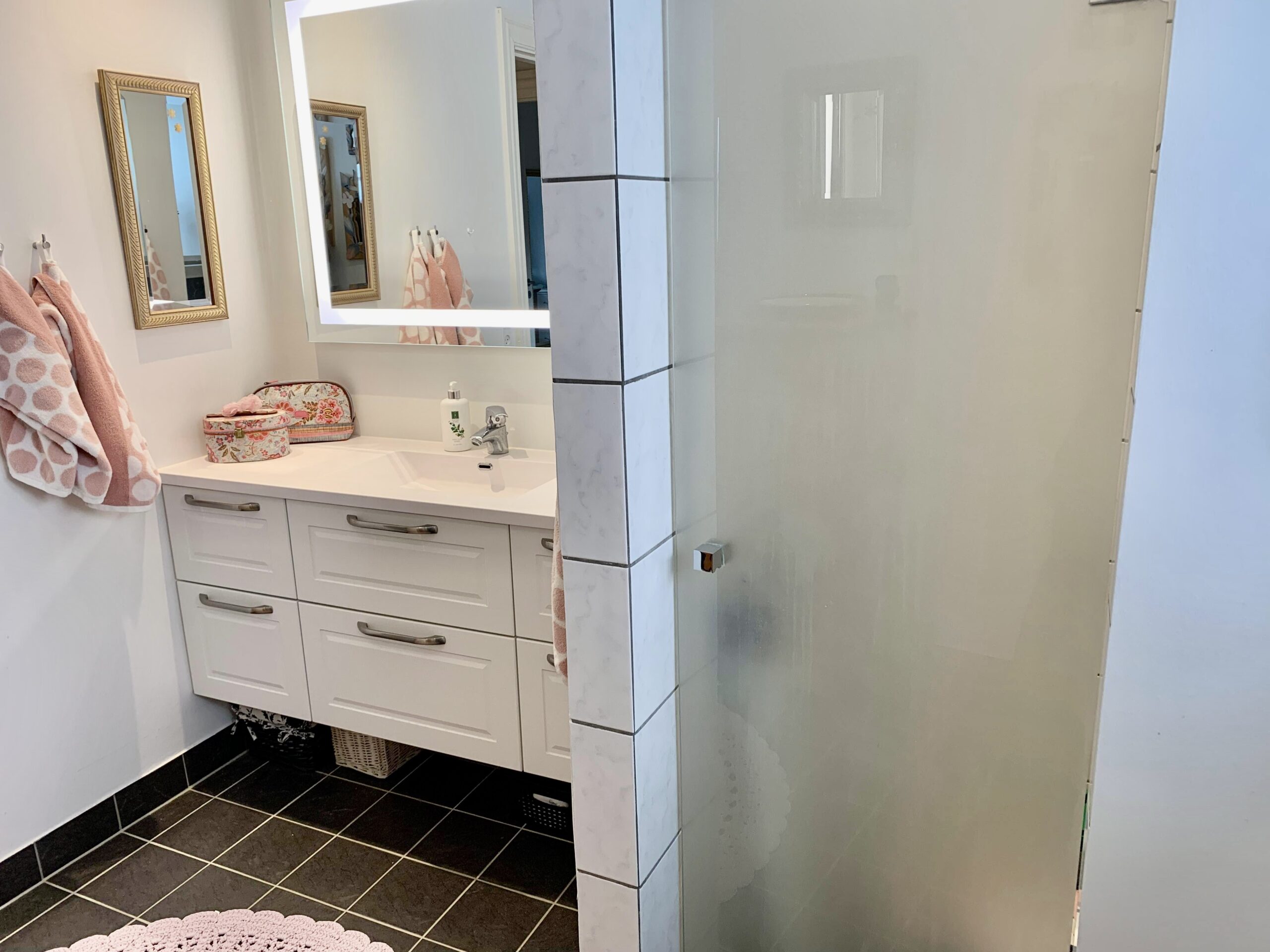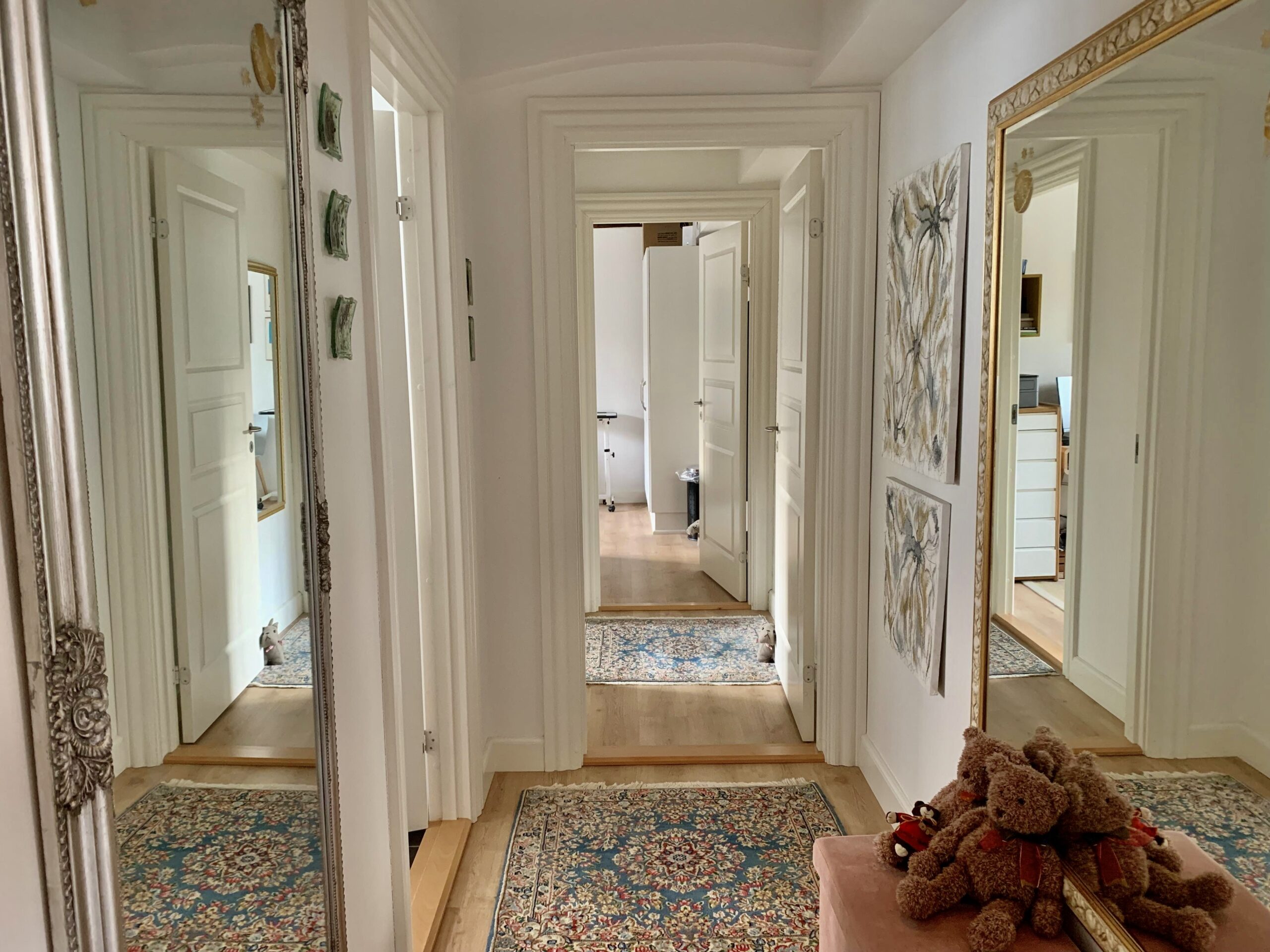 Til venstre for indgangen har vi en fordelingsgang, hvor vi har badeværelset, der ligeledes er rummeligt og har en god indbygget brusekabine. Dernæst kommer to værelser, hvorpå man på billederne kan se et sy-værelse og i bunden et gæsteværelse. Der er klædeskabe i begge rum, og er naturligvis også egnet til soveværelser.