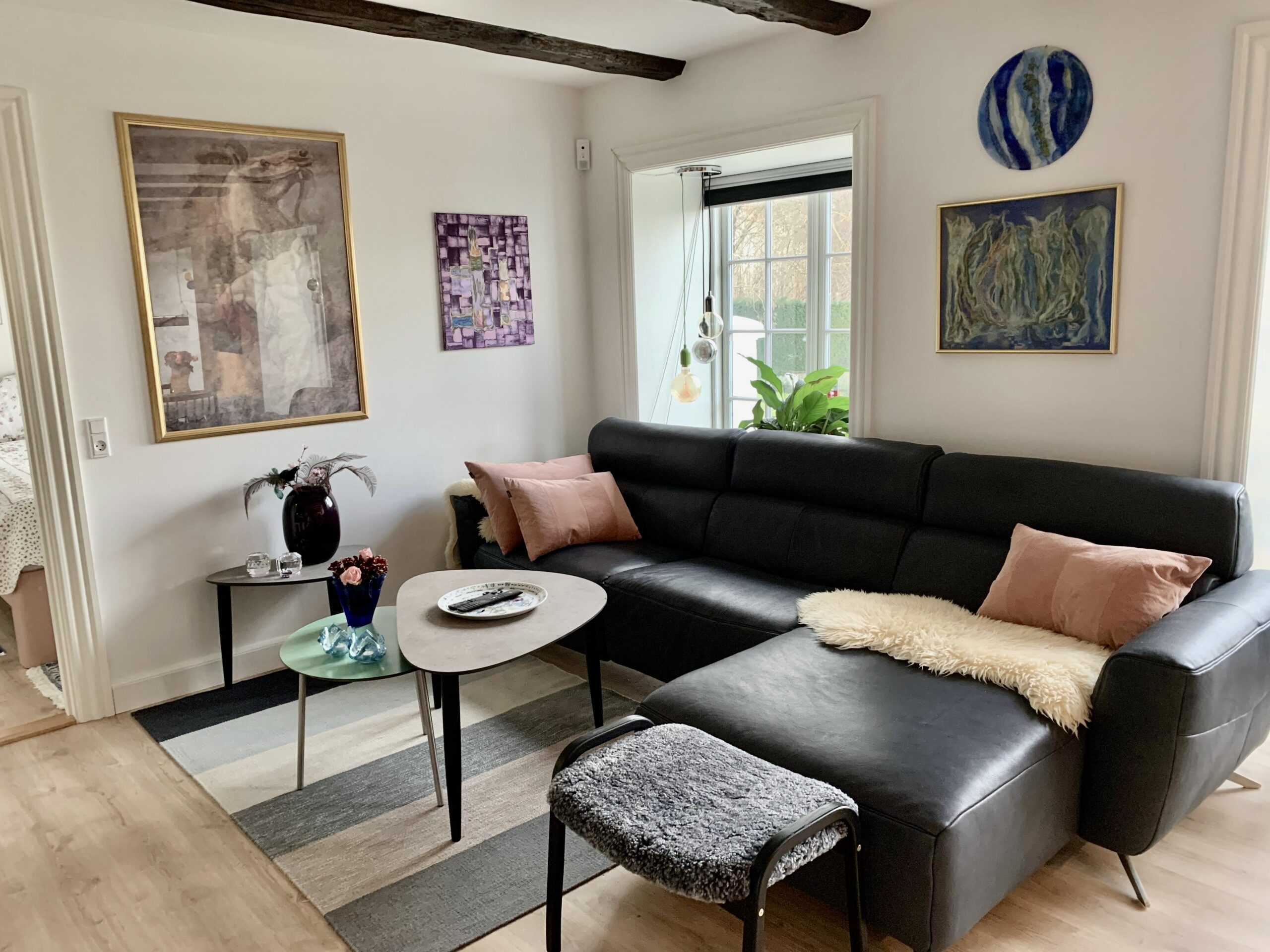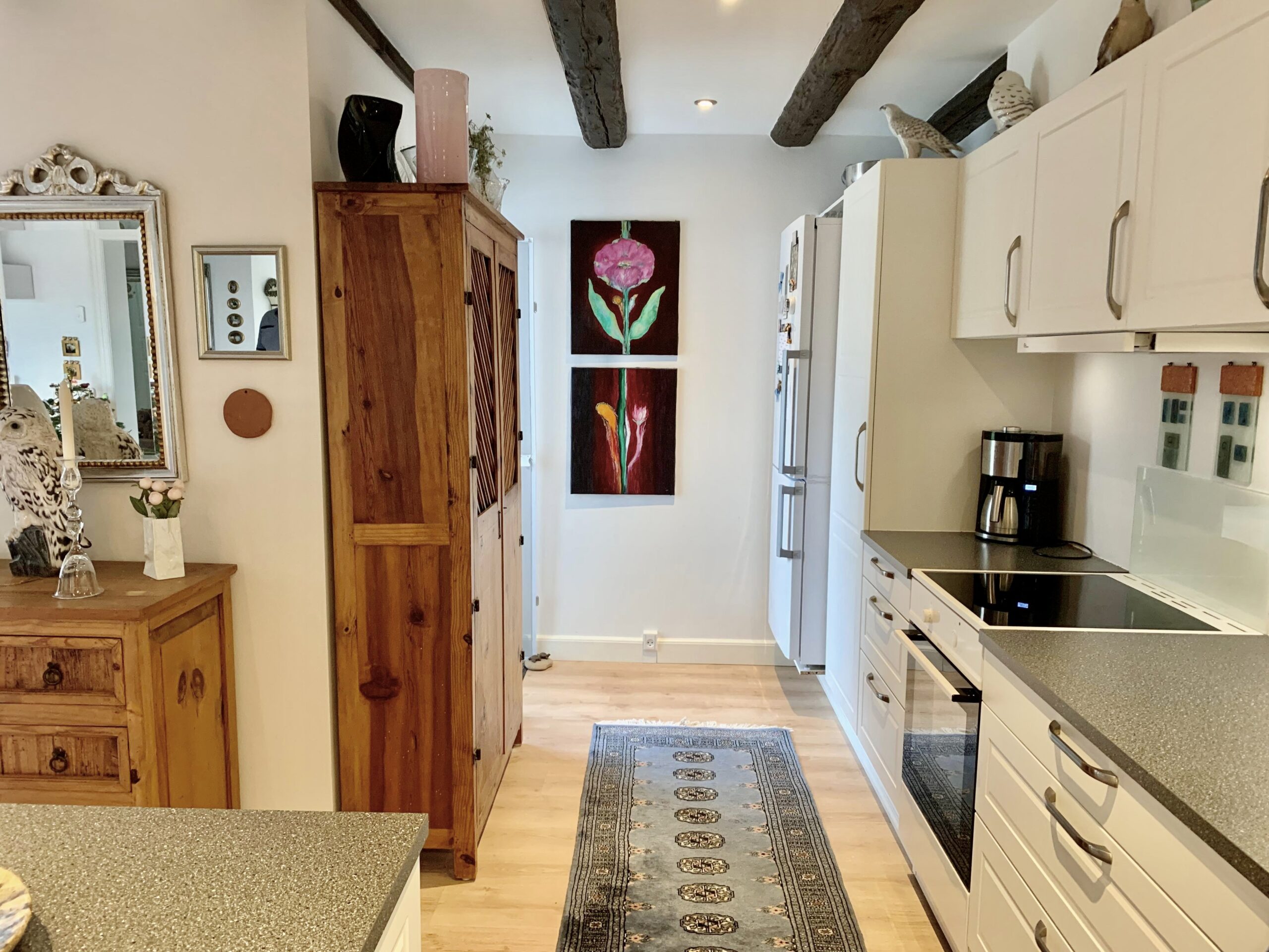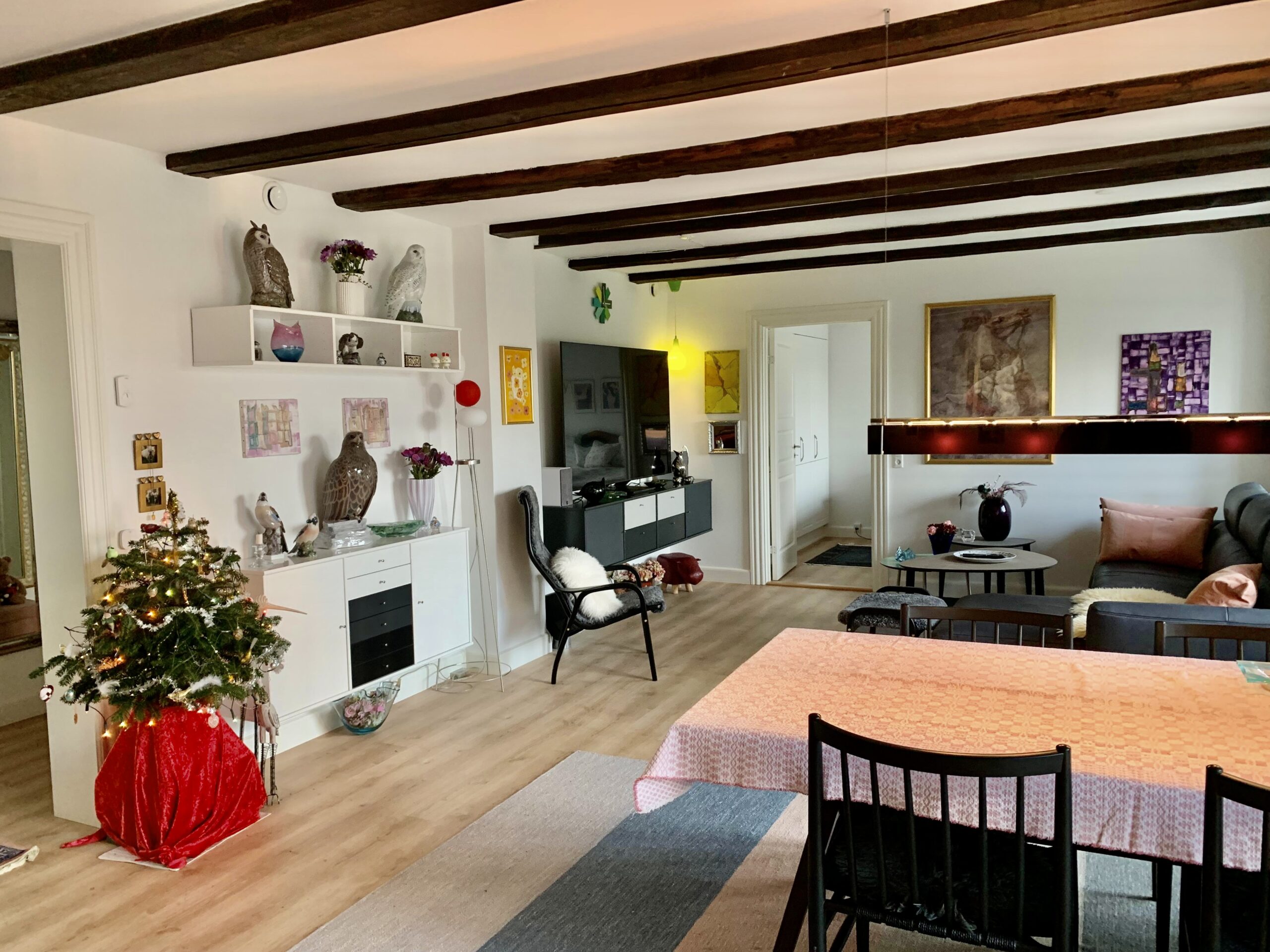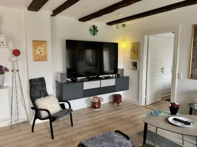 Denne store lejlighed er virkelig hyggelig med bjælker i loftet og flotte vinduer, og stadig med et moderne touch med nye materialer, gulvvarme og lækre klædeskabe.