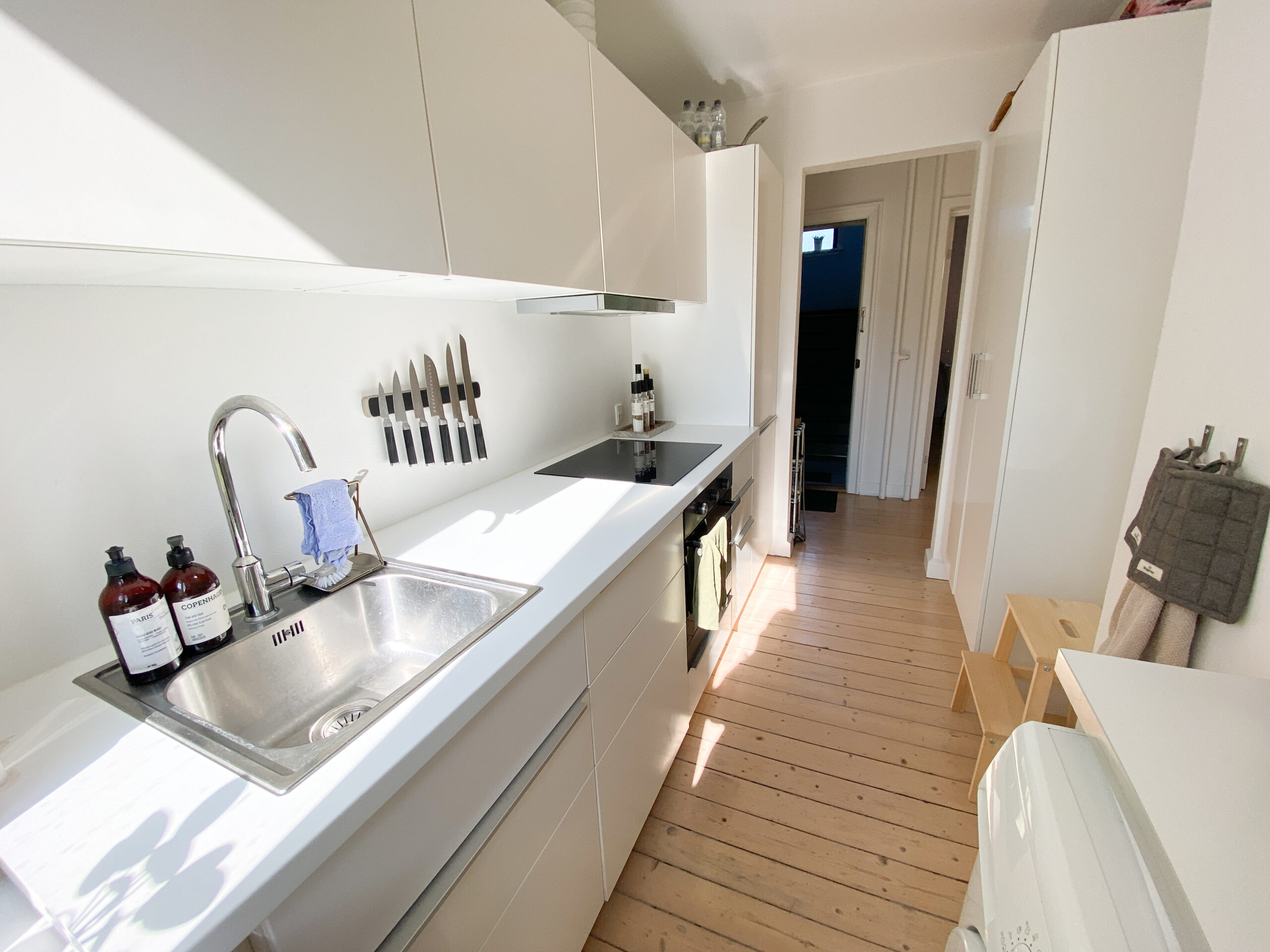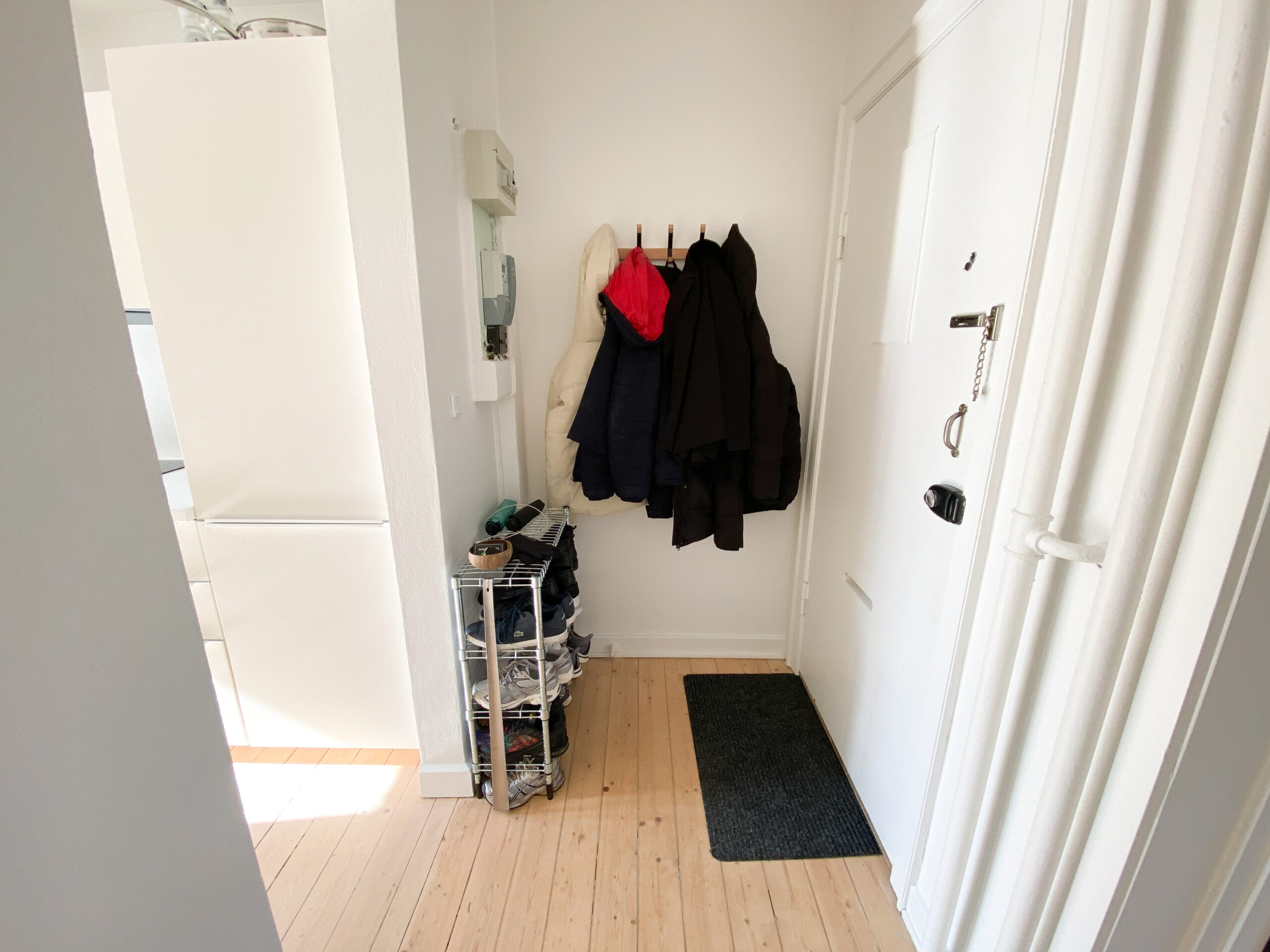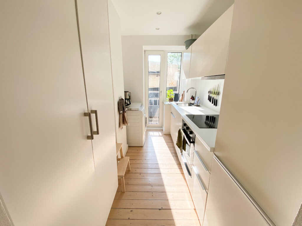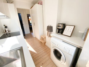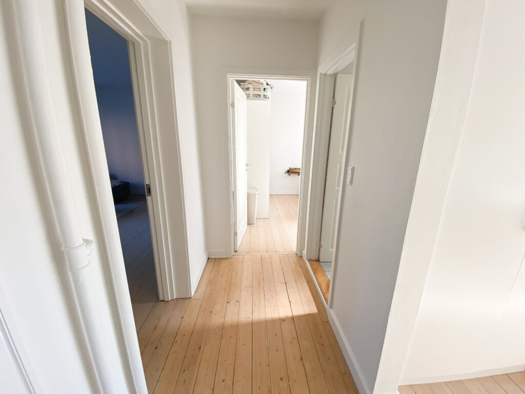 Boligen er indrettet med en fordelingsgang, der giver adgang til alle rum. Allerede ved indgangen mødes man af det flotte, renoverede køkken, der fremstår moderne med hvide elementer, god skabsplads og en praktisk vaskemaskine. Herfra er der direkte udgang til en lille altan – perfekt til en kop kaffe i morgensolen.