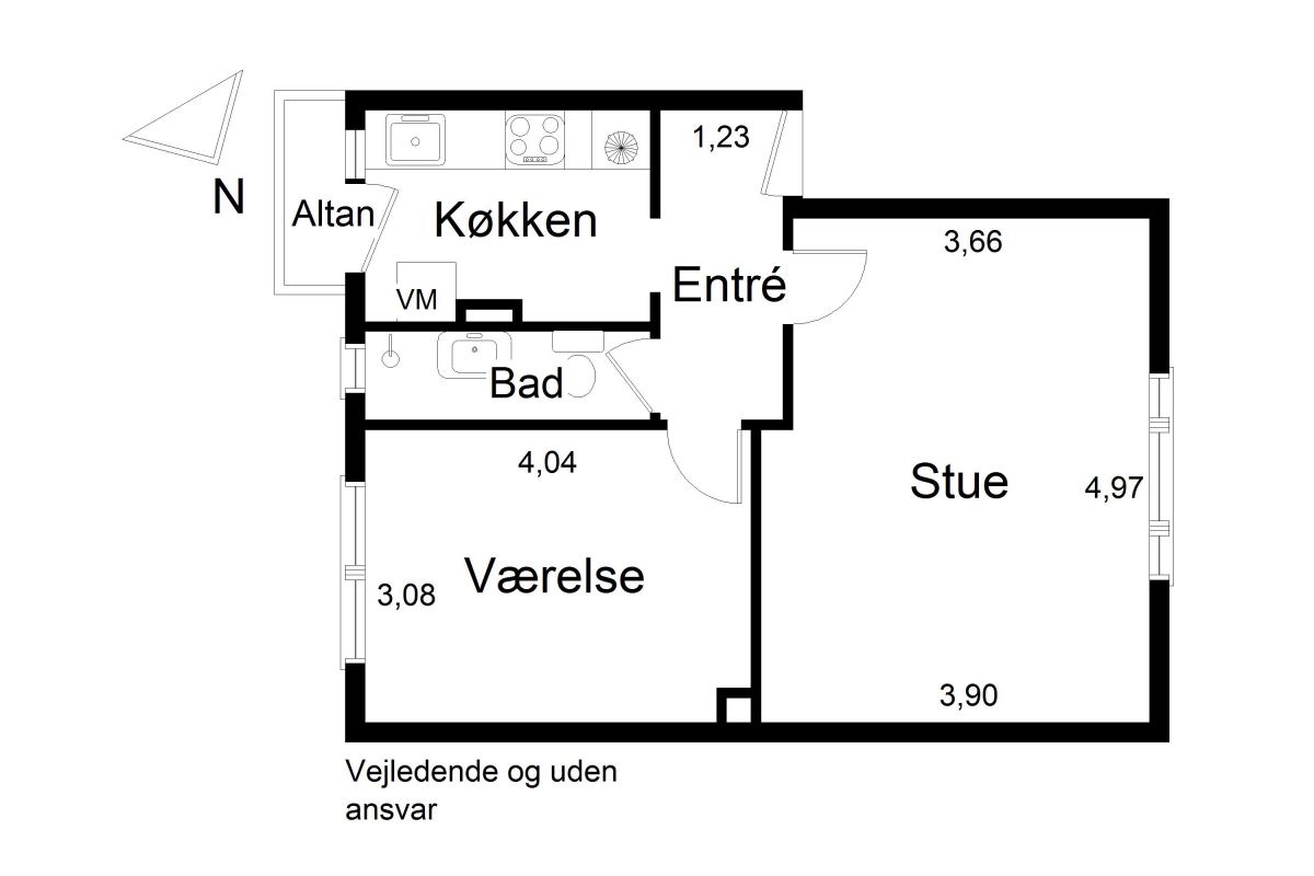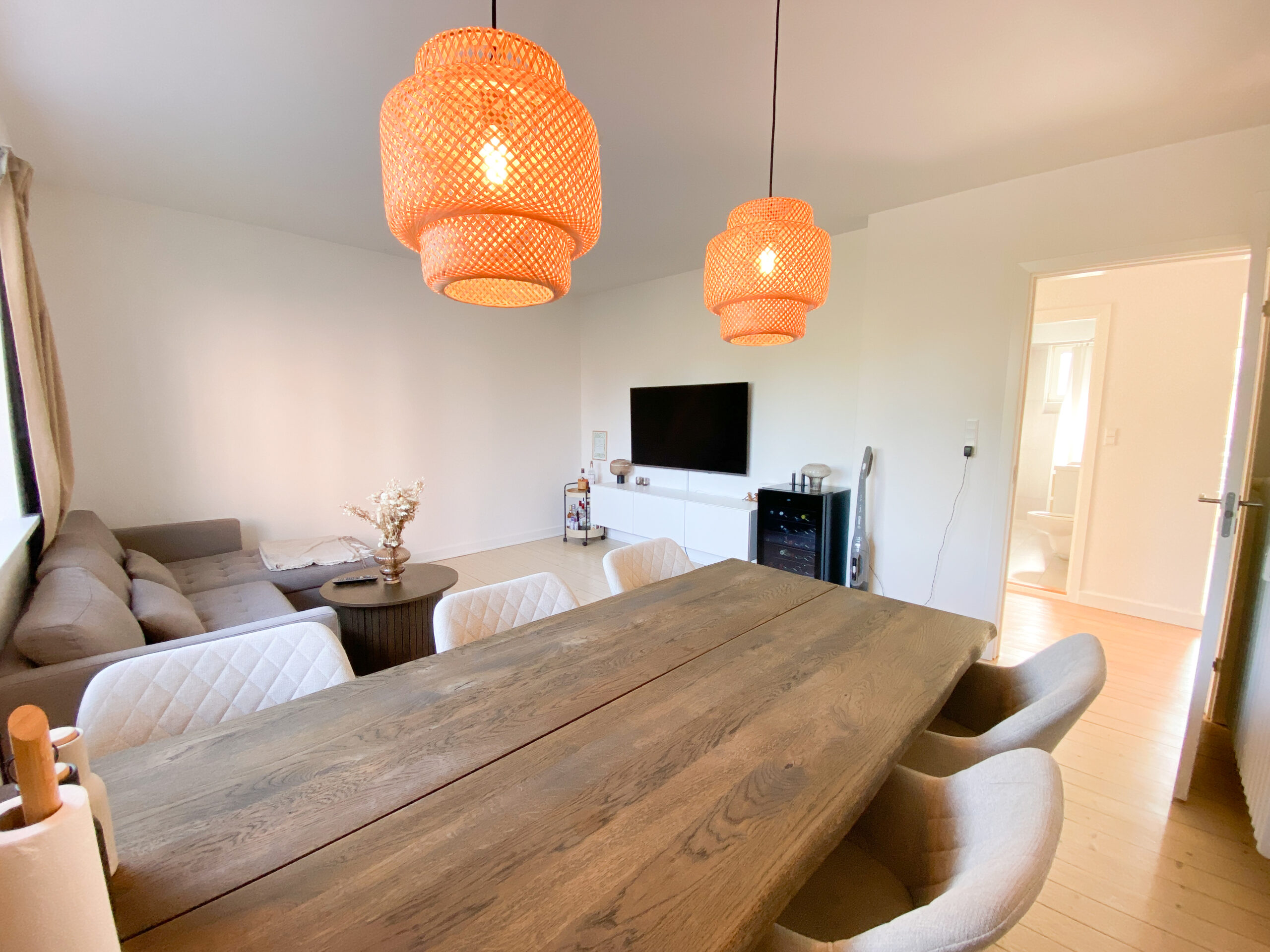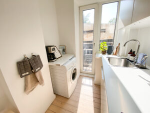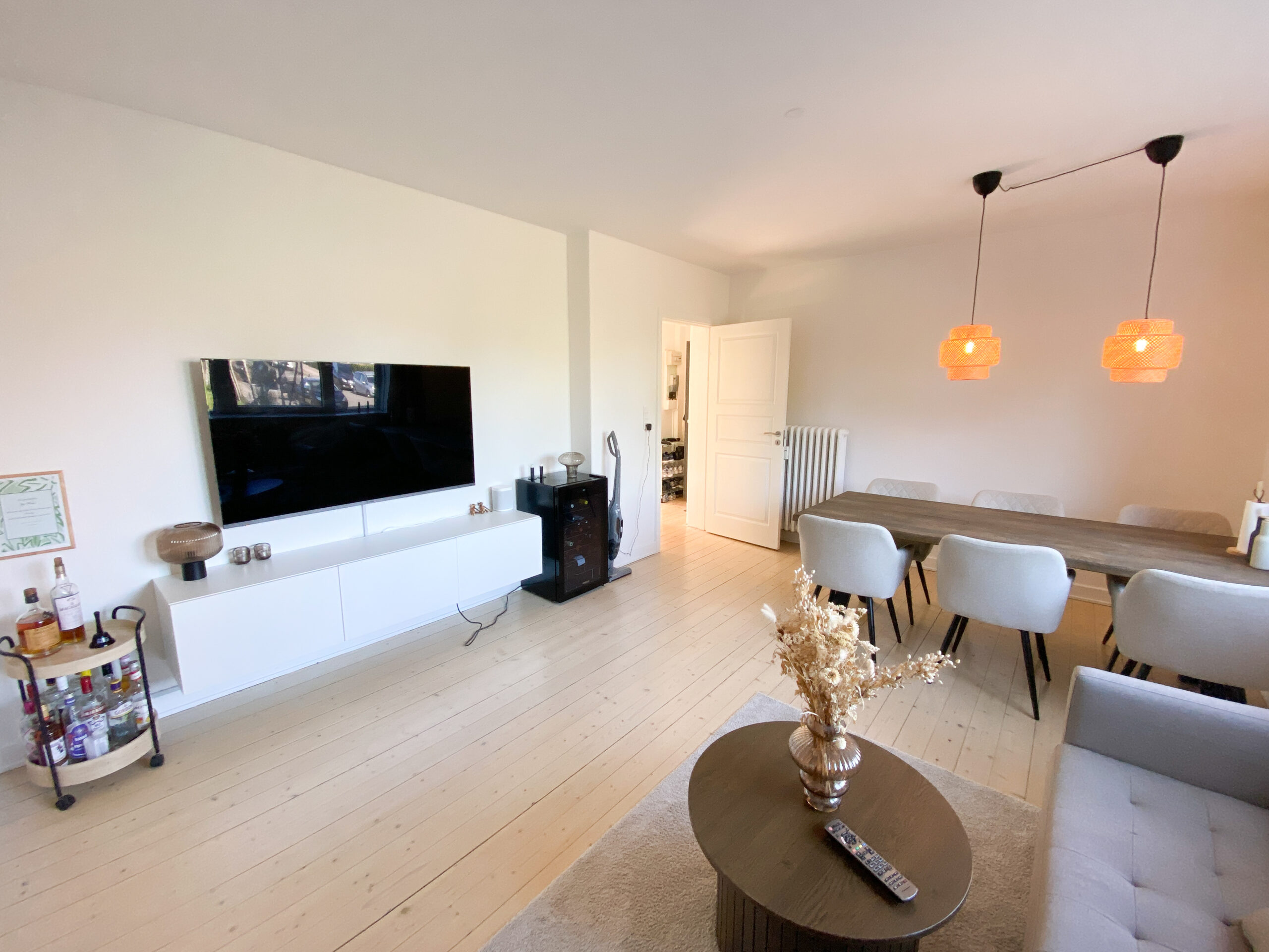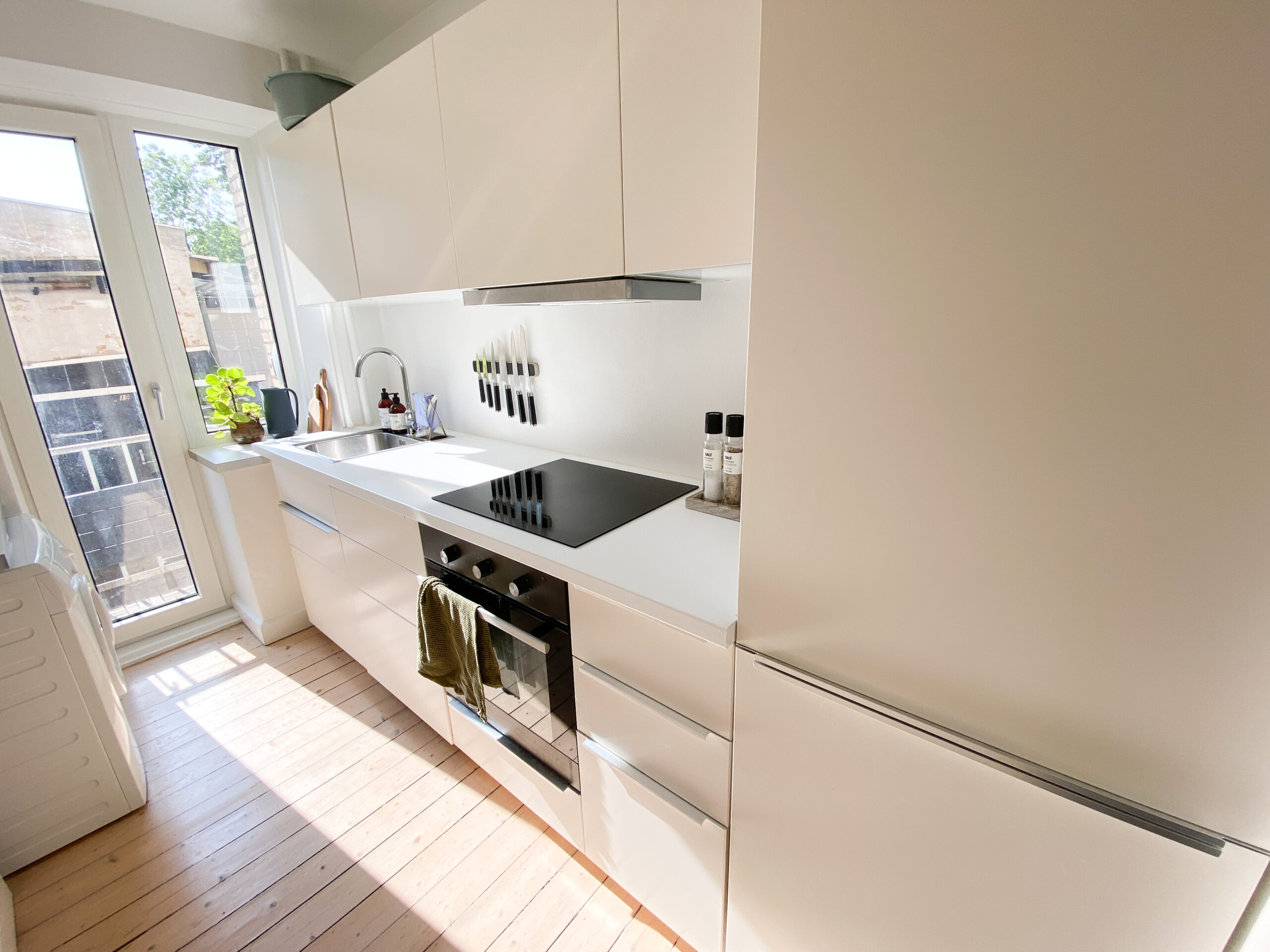 Boligen er indrettet med en fordelingsgang, der giver adgang til alle rum. Allerede ved indgangen mødes man af det flotte, renoverede køkken, der fremstår moderne med hvide elementer, god skabsplads og en praktisk vaskemaskine. Herfra er der direkte udgang til en lille altan – perfekt til en kop kaffe i morgensolen.