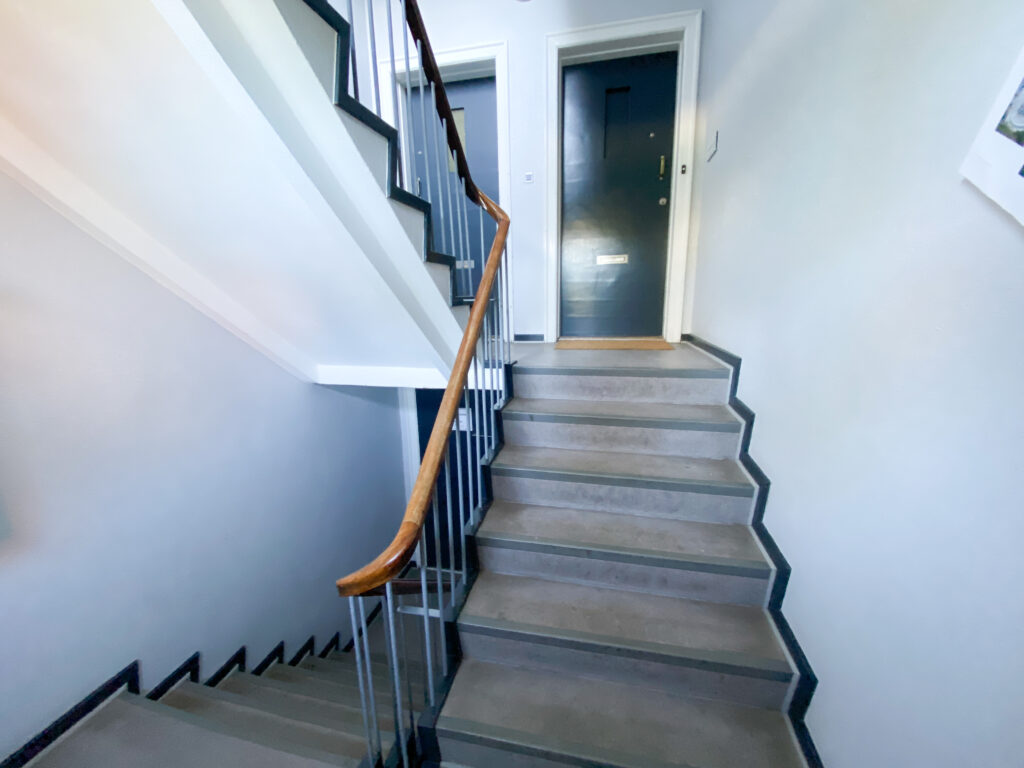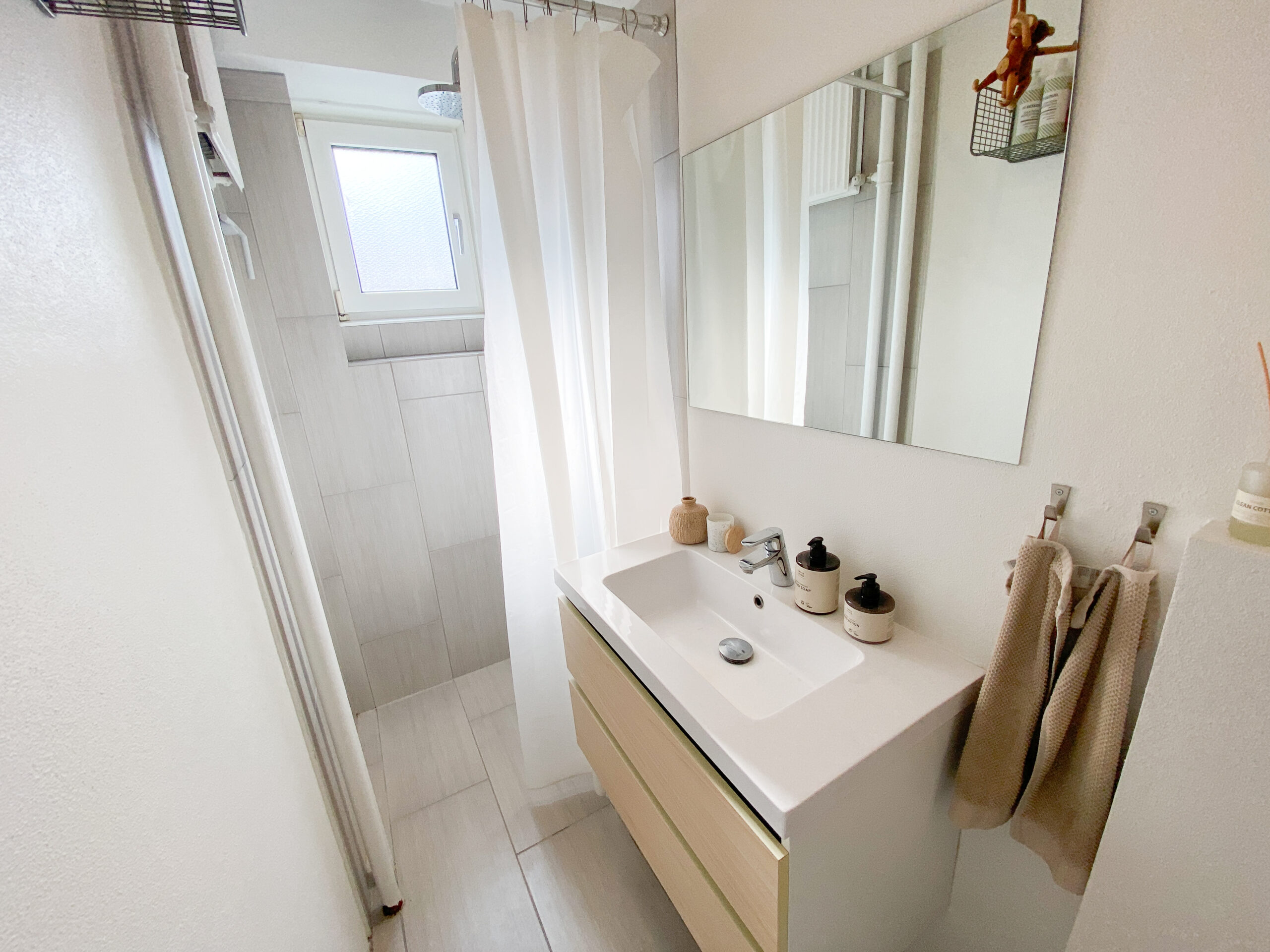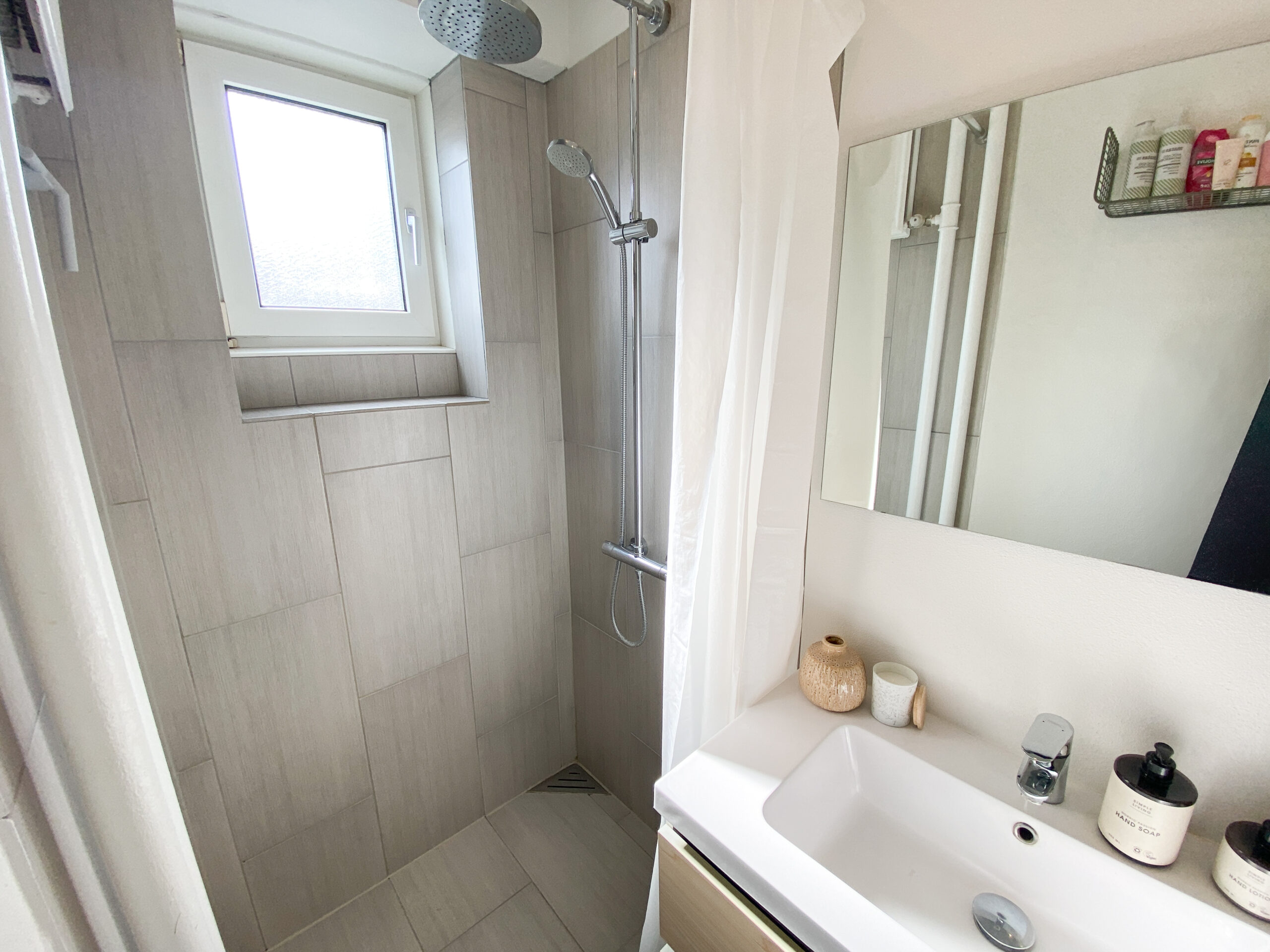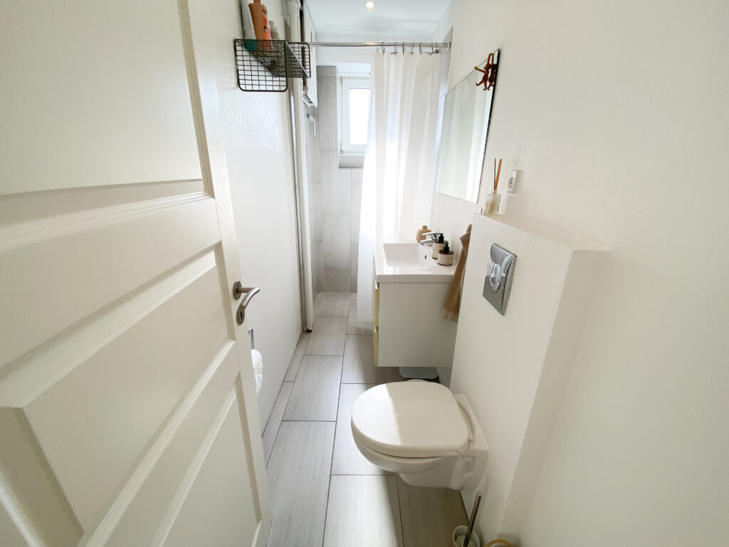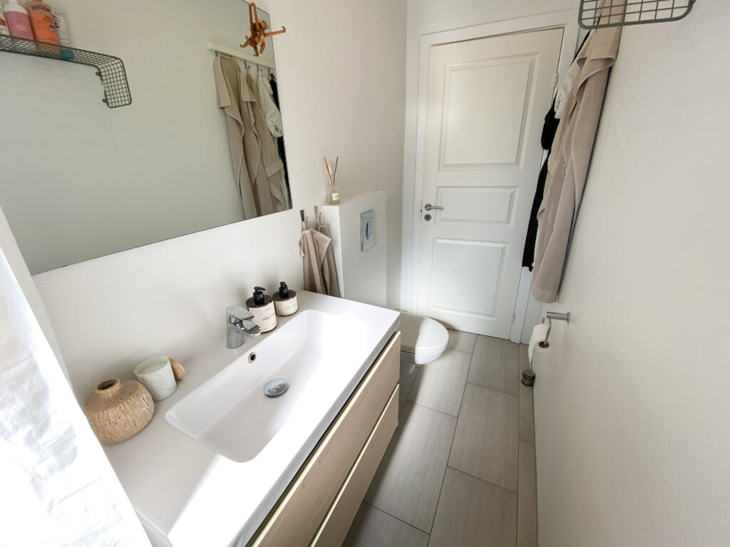 Badeværelset er ligeledes blevet moderniseret og fremstår stilrent med grå klinker, en rummelig bruseniche samt en funktionel håndvask med bordplads omkring – både æstetisk og brugervenligt.