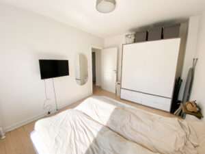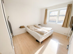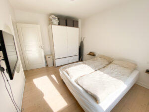 Soveværelset er placeret for enden af gangen og rummer plads til en dobbeltseng, et stort garderobeskab og eventuelt et skrivebord, hvis behovet er der – oplagt til hjemmearbejde eller studier.