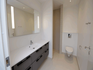 Der er gennemgående flotte plankegulve i matlakeret egetræ i stuer, køkken, entré og værelser, mens badeværelserne og bryggerset har lyse, stilrene klinker. Alt interiør er fra Invita og bidrager til den moderne og harmoniske helhed.
