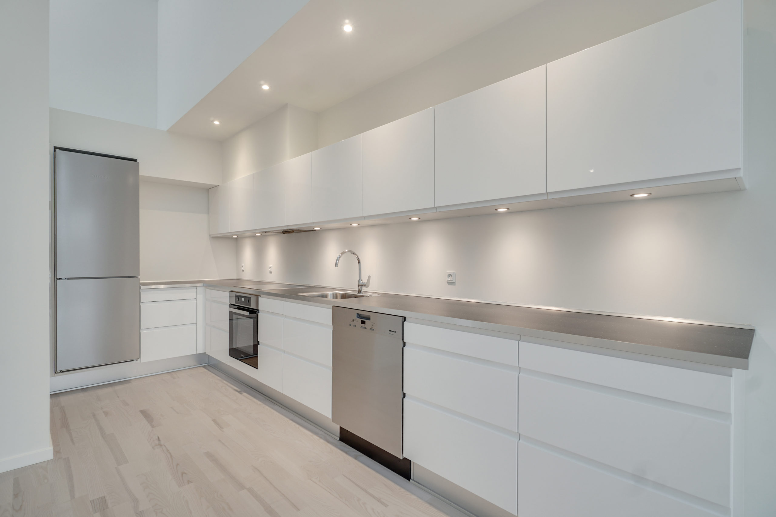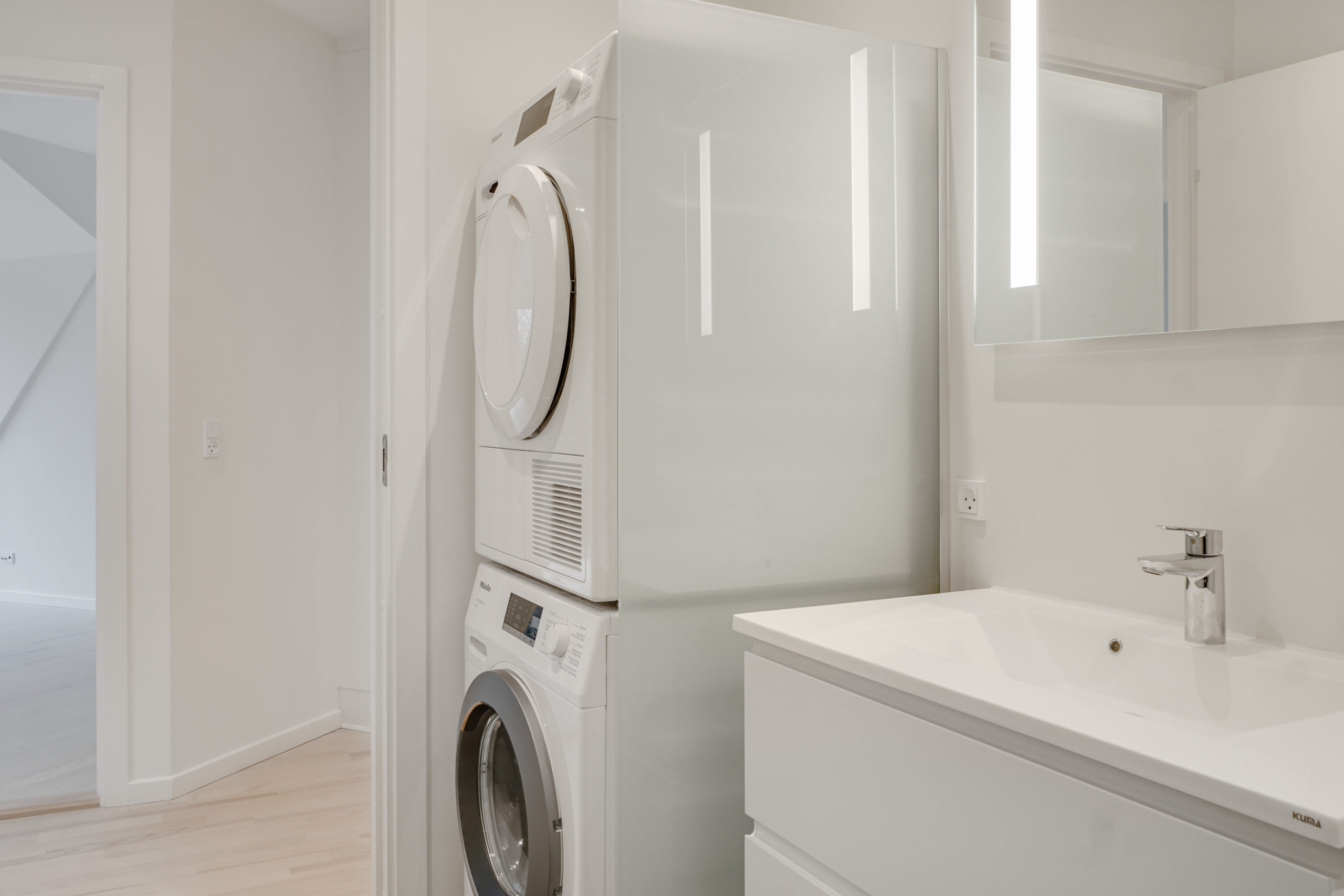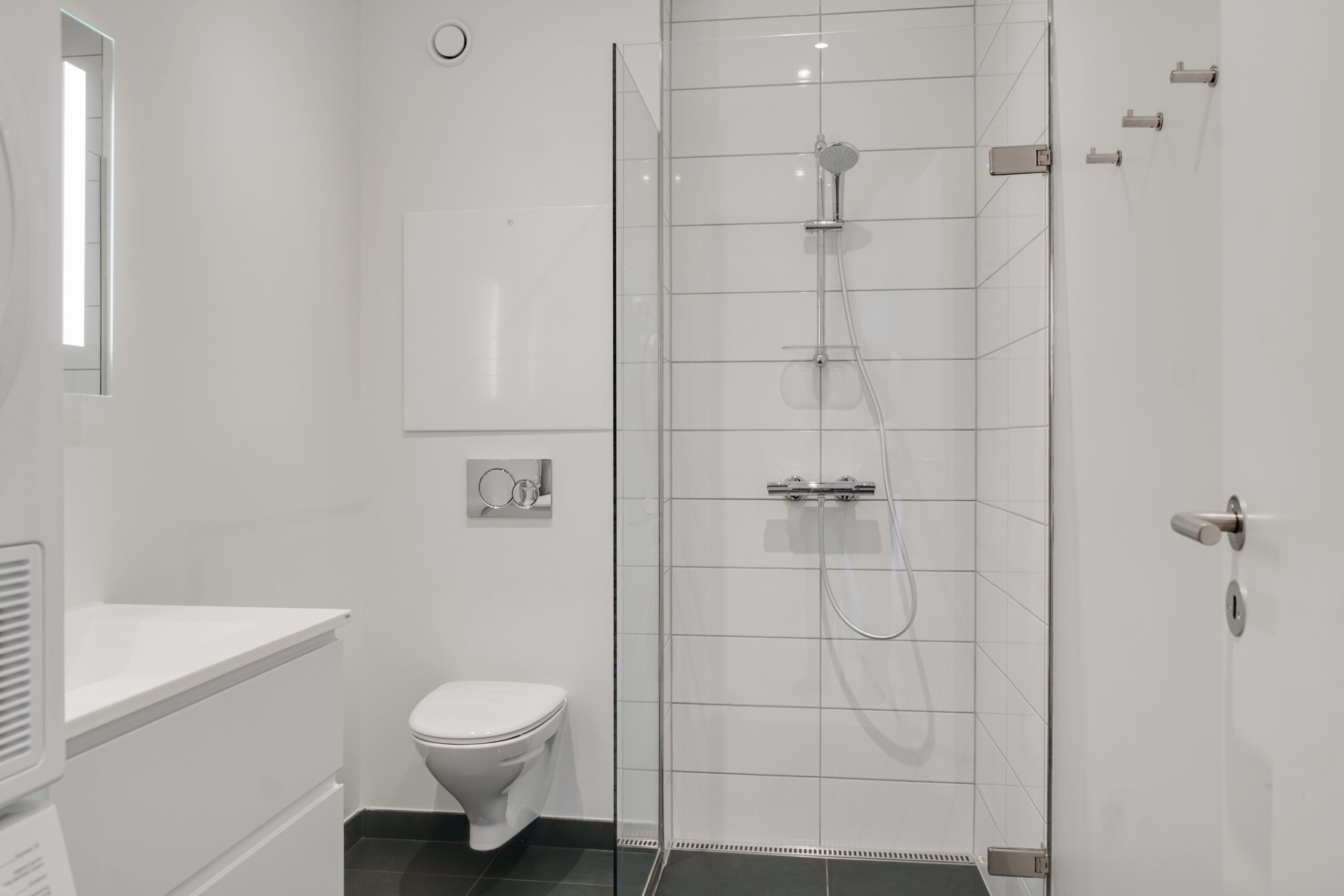 Lejligheden byder på en rummelig entré med faste skabe, der fører ind til et lækkert badeværelse udstyret med bruseniche og væghængt toilet, samt egen vaskemaskine og tørretumbler. De to store værelser giver masser af plads og har også faste skabe. I det stilfulde højglans køkken finder du alle hårde hvidevarer fra Miele, herunder opvaskemaskine, og køkkenet er i åben forbindelse med den lyse stue, der prydes af en stor glaskanap og elegante søjler. Overalt i boligen er der flotte parketgulve og behagelig gulvvarme, der skaber en varm og indbydende stemning.