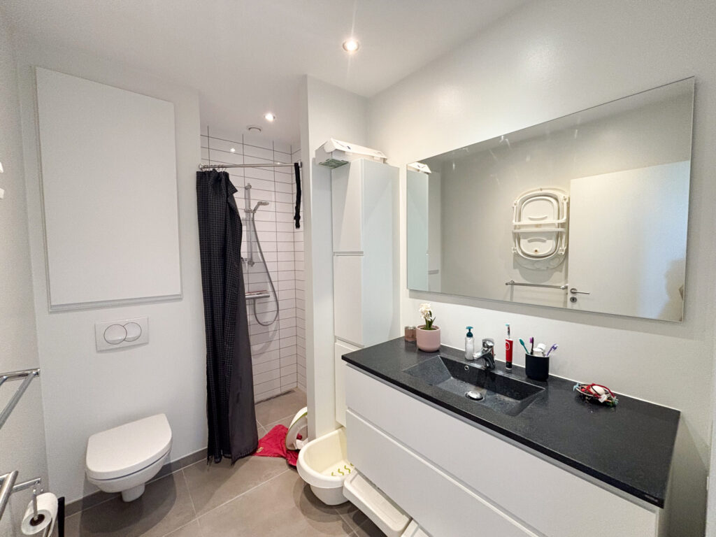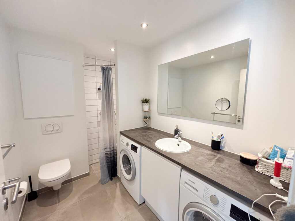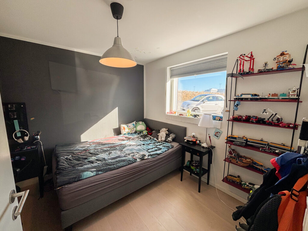 I stueetagen træder du ind i en rummelig entré, der giver adgang til to lyse værelser, begge med indbyggede skabe. Det store badeværelse er stilfuldt indrettet med god opbevaringsplads, en praktisk bruseniche samt både vaskemaskine og tørretumbler. Hjertet i hjemmet er det åbne køkken-alrum, hvor det elegante hvide køkken med en funktionel køkkenø skaber et perfekt samlingspunkt. De flotte grå klinker på gulvet understreger den moderne stil, og fra alrummet er der direkte udgang til en hyggelig have og terrasse.