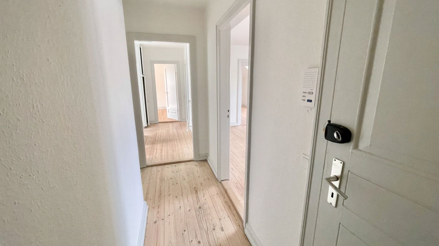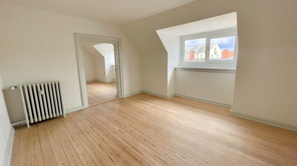 Der er flotte afhøvlede plankegulve, dørtelefon og mulighed for natparkering i aflåst gård.