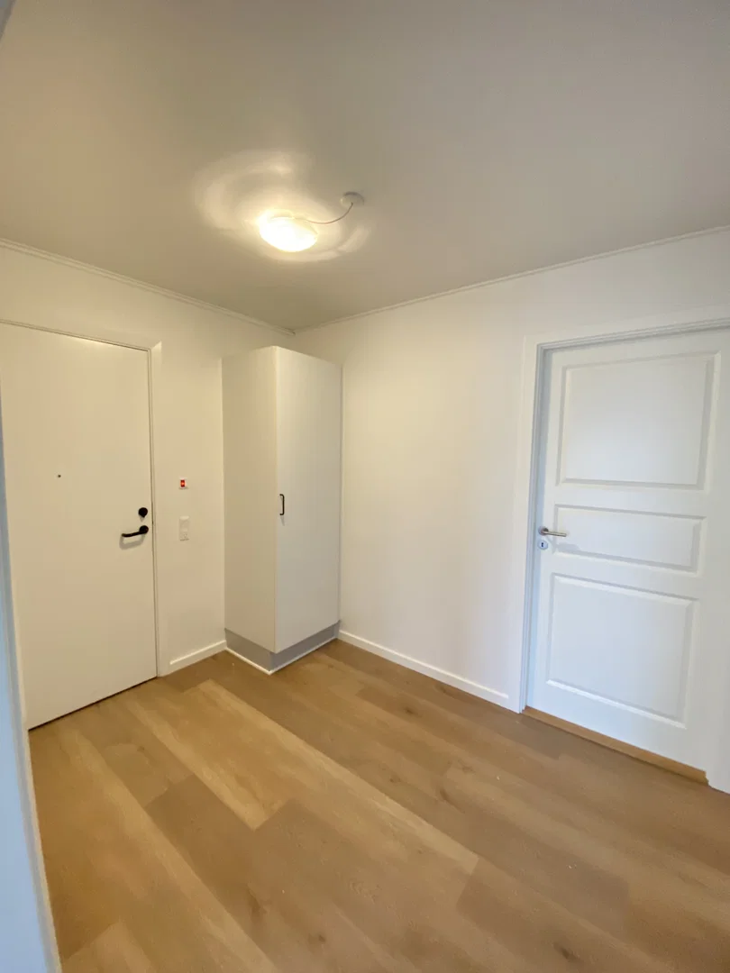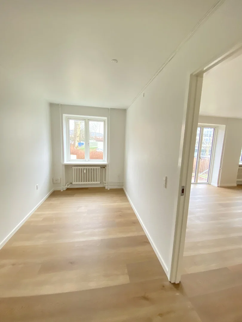 Du træder ind i en rummelig entré, der leder dig ind i lejlighedens hjerte – et stort og åbent køkkenalrum og stue. Dette område indbyder til både madlavning og afslapning, hvor det stilfulde køkken er udstyret med moderne faciliteter og rigeligt med skabs- og bordplads. Stuen, med sine store vinduer, er badet i naturligt lys og har direkte adgang til en skøn altan, hvor du kan nyde udsigten til den dejlige have. Lejligheden rummer også et stort soveværelse samt et ekstra værelse, som kan bruges til kontor eller gæster. Det store badeværelse er funktionelt og udstyret med vaskemaskine og tørretumbler.