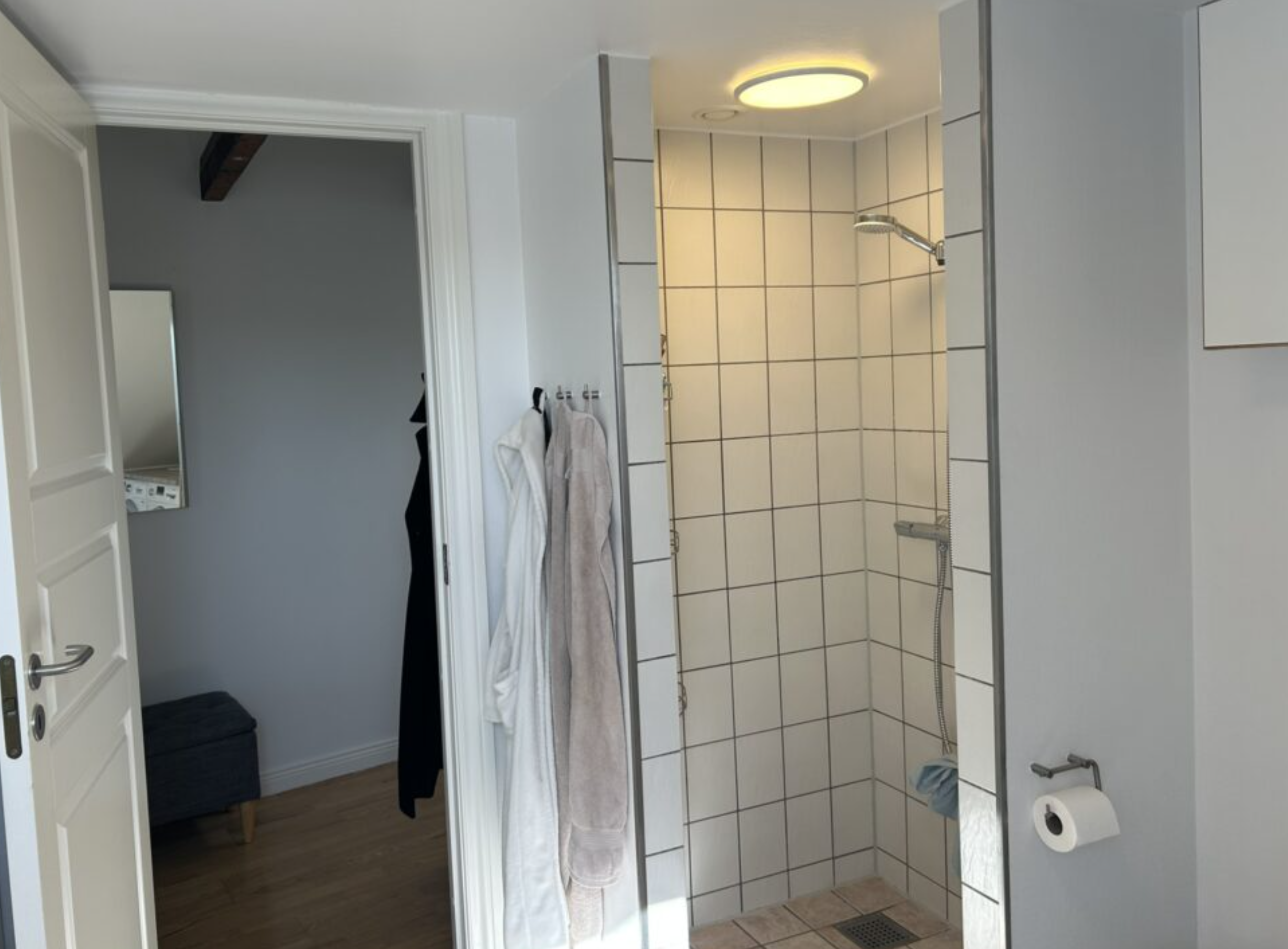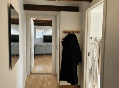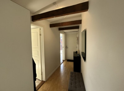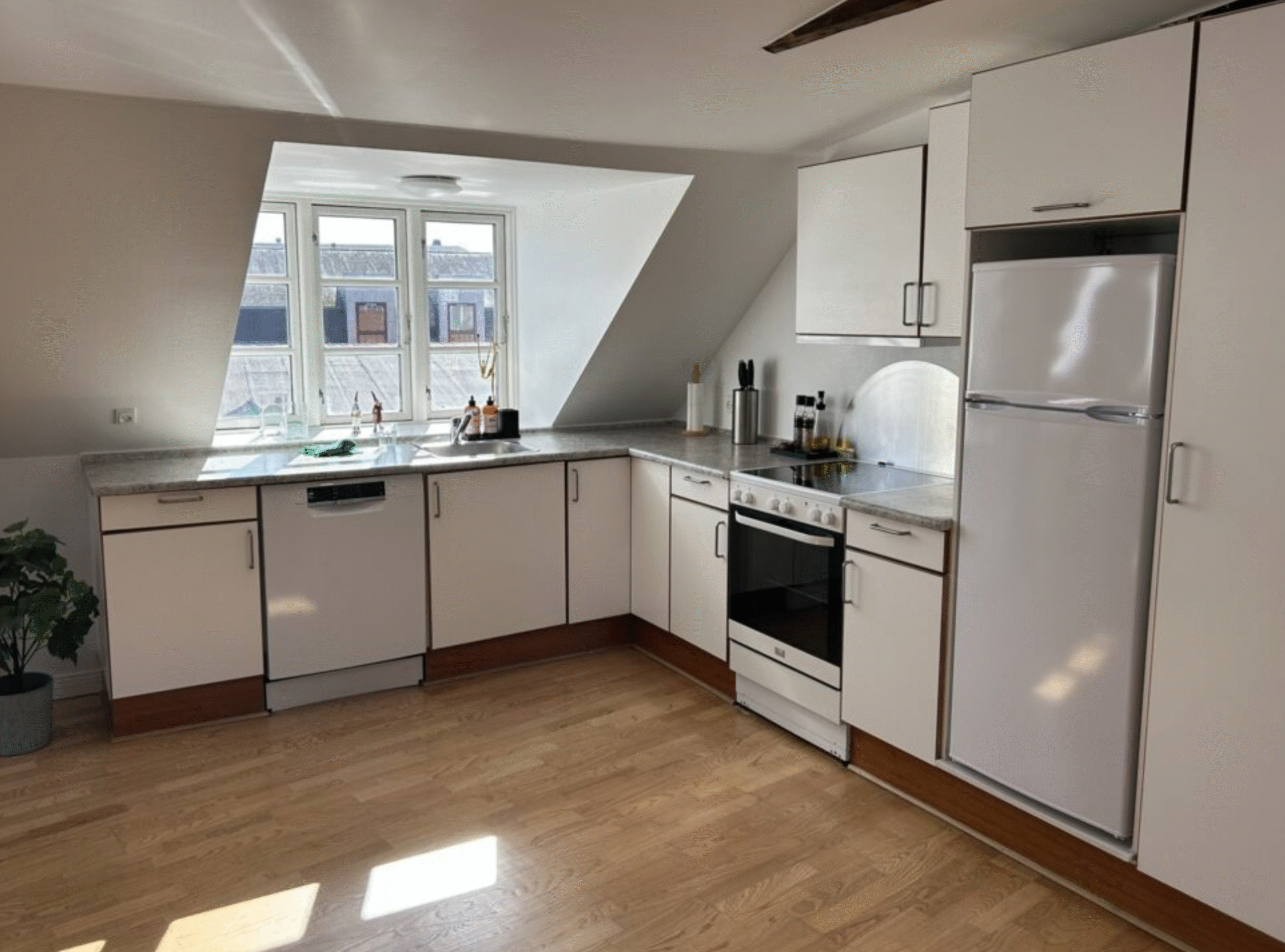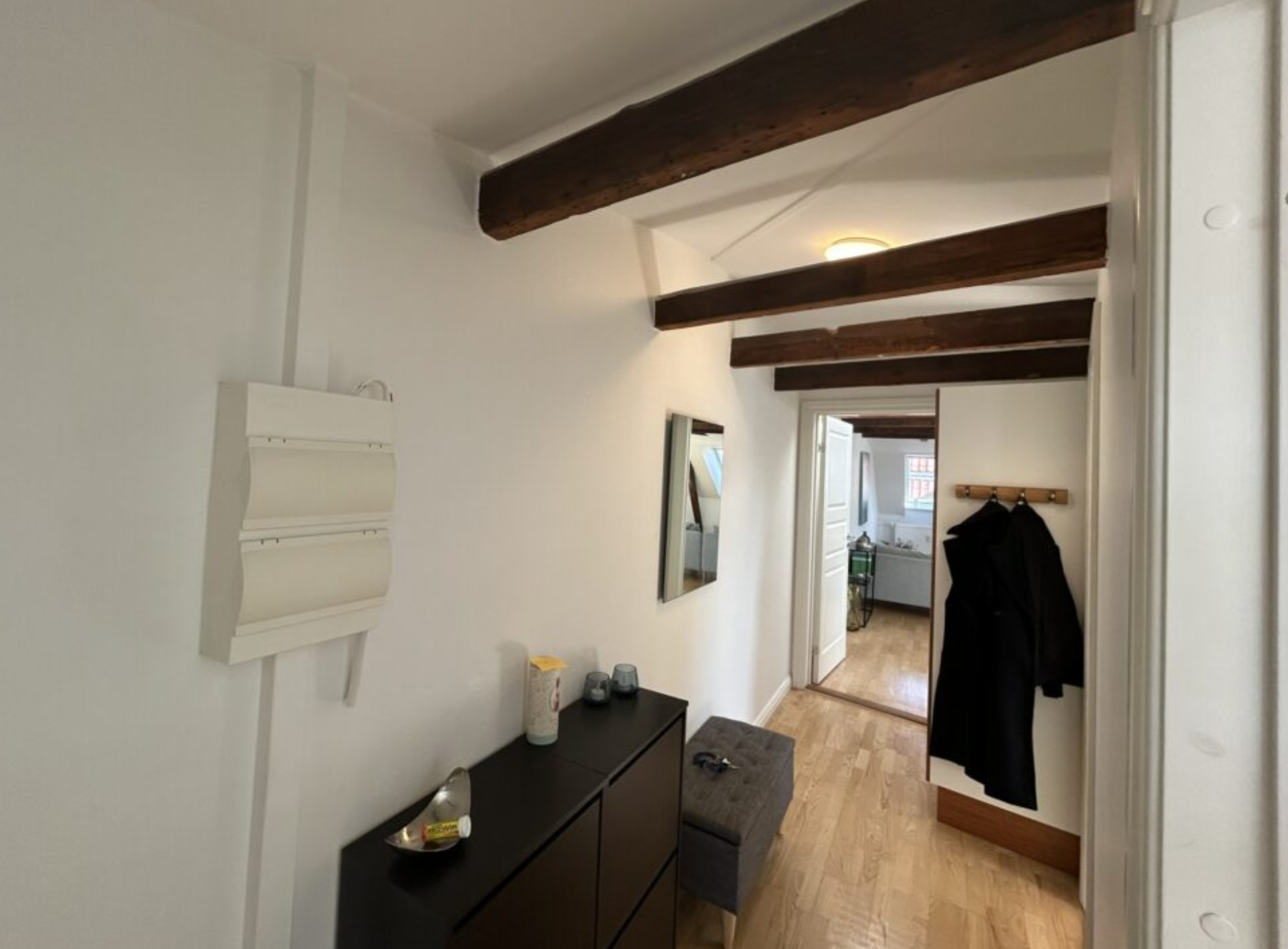 Lejligheden har en rummelig entré/fordelingsgang med praktisk opbevaring i indbyggede skabe. Det store og åbne køkken-alrum er lejlighedens naturlige samlingspunkt – her får du alt i hårde hvidevarer, god skabsplads, synlige bjælker og ovenlysvinduer, som tilfører rummet masser af lys og karakter.