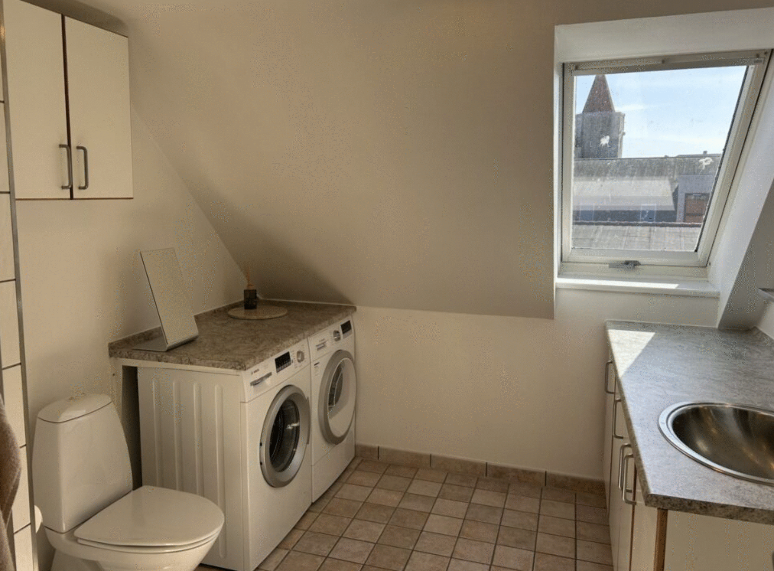 Soveværelset er lyst og funktionelt med skabe og direkte udgang til en skøn altan, hvor du kan nyde udsigten over C.W. Obels Plads – en sjælden kvalitet midt i byen. Badeværelset er stort og veludnyttet med vinduer og god opbevaringsplads.