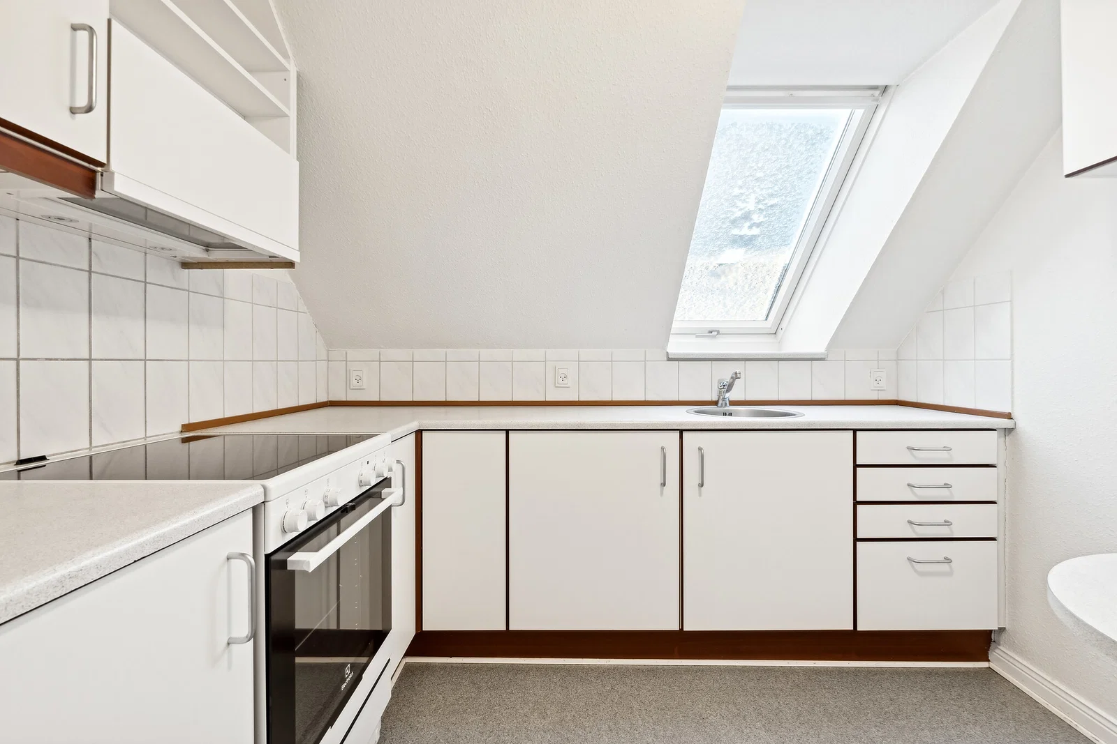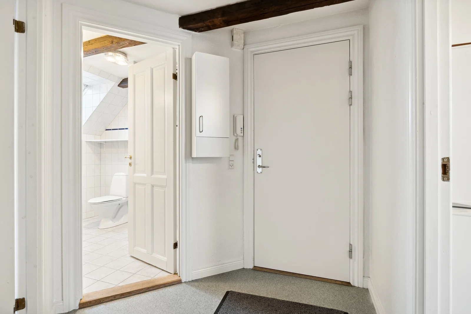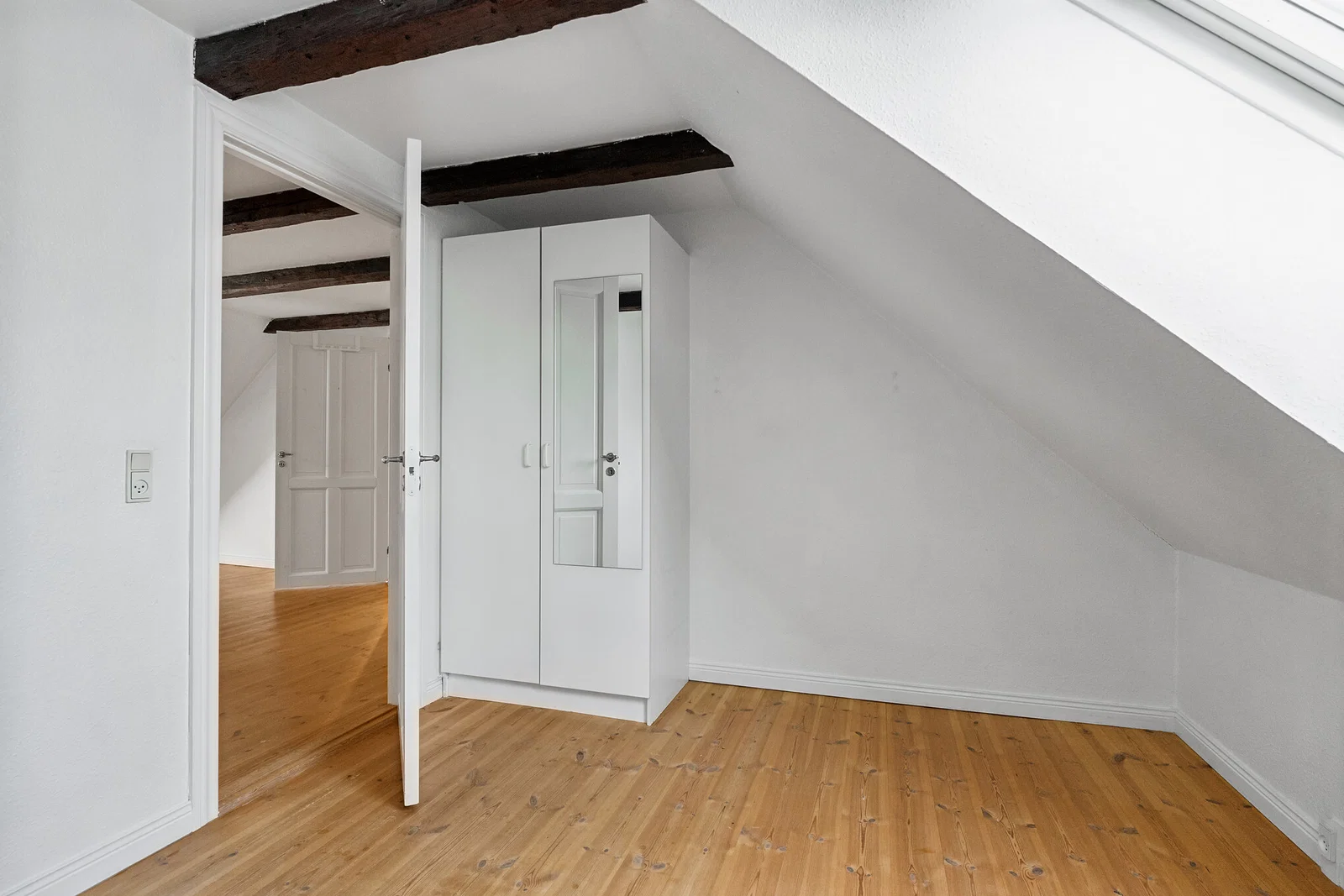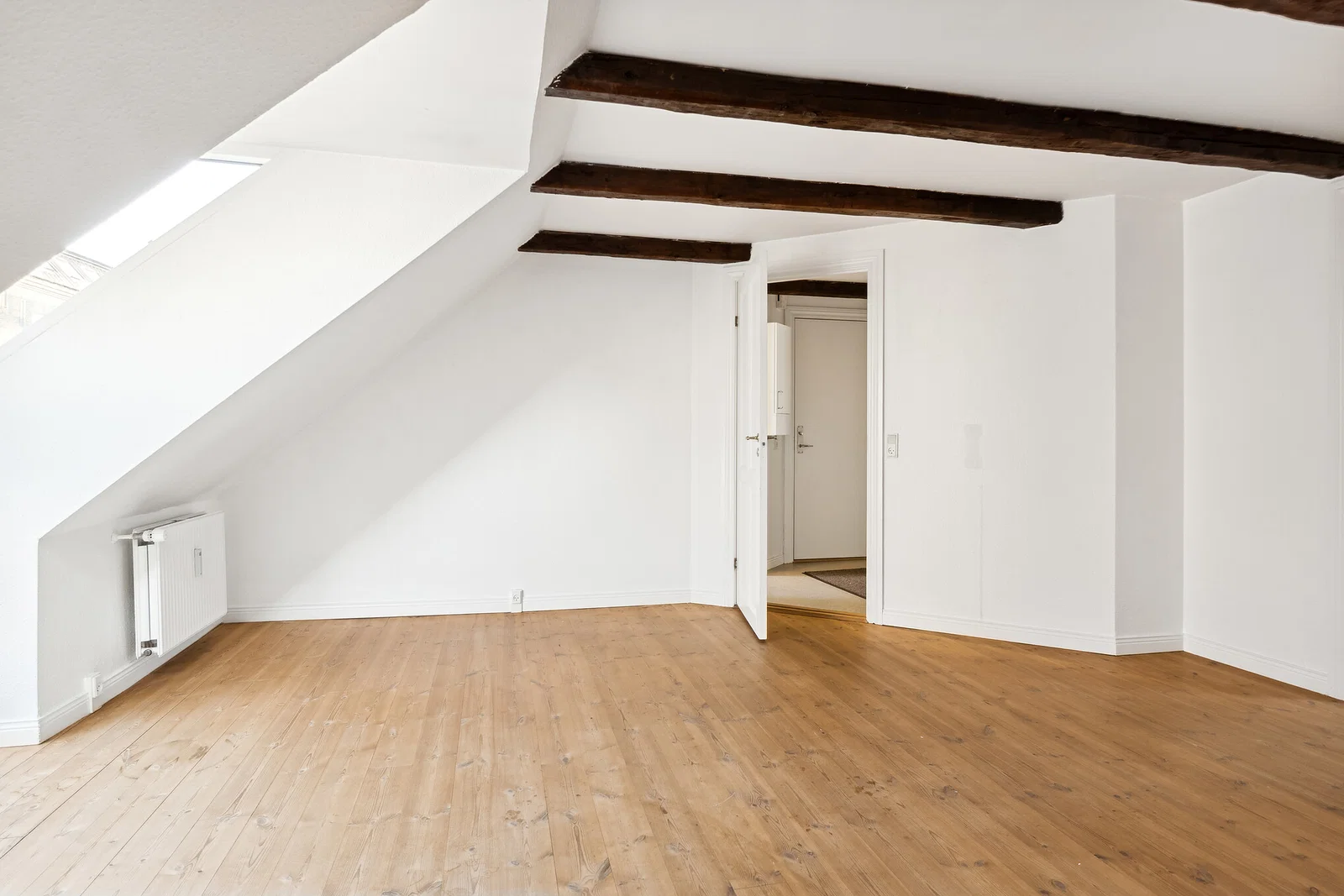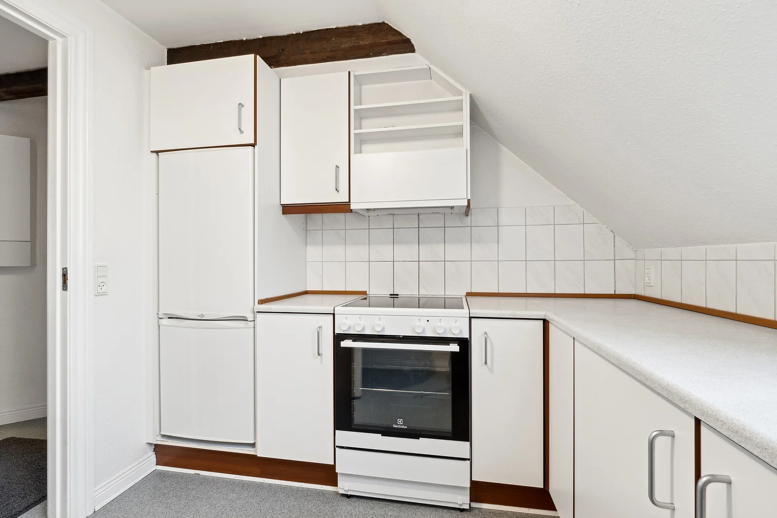 Lejligheden byder på en praktisk entré med linoleumsgulv og porttelefon. Det separate køkken er både klassisk og funktionelt med hvide elementer og trækanter, flisebeklædt væg samt god skabs- og bordplads. Her er installeret køle/fryseskab, komfur/ovn og emhætte, og et smart vægmonteret spiseklap giver en hyggelig spiseplads til 2-3 personer. Stuen er rummelig med afhøvlede trægulve, synlige bjælker og flot lys fra dobbelte terrassedøre til en fransk altan. Soveværelset ligger ugenert med ovenlysvindue og indbygget garderobeskab, hvilket skaber en rolig atmosfære.