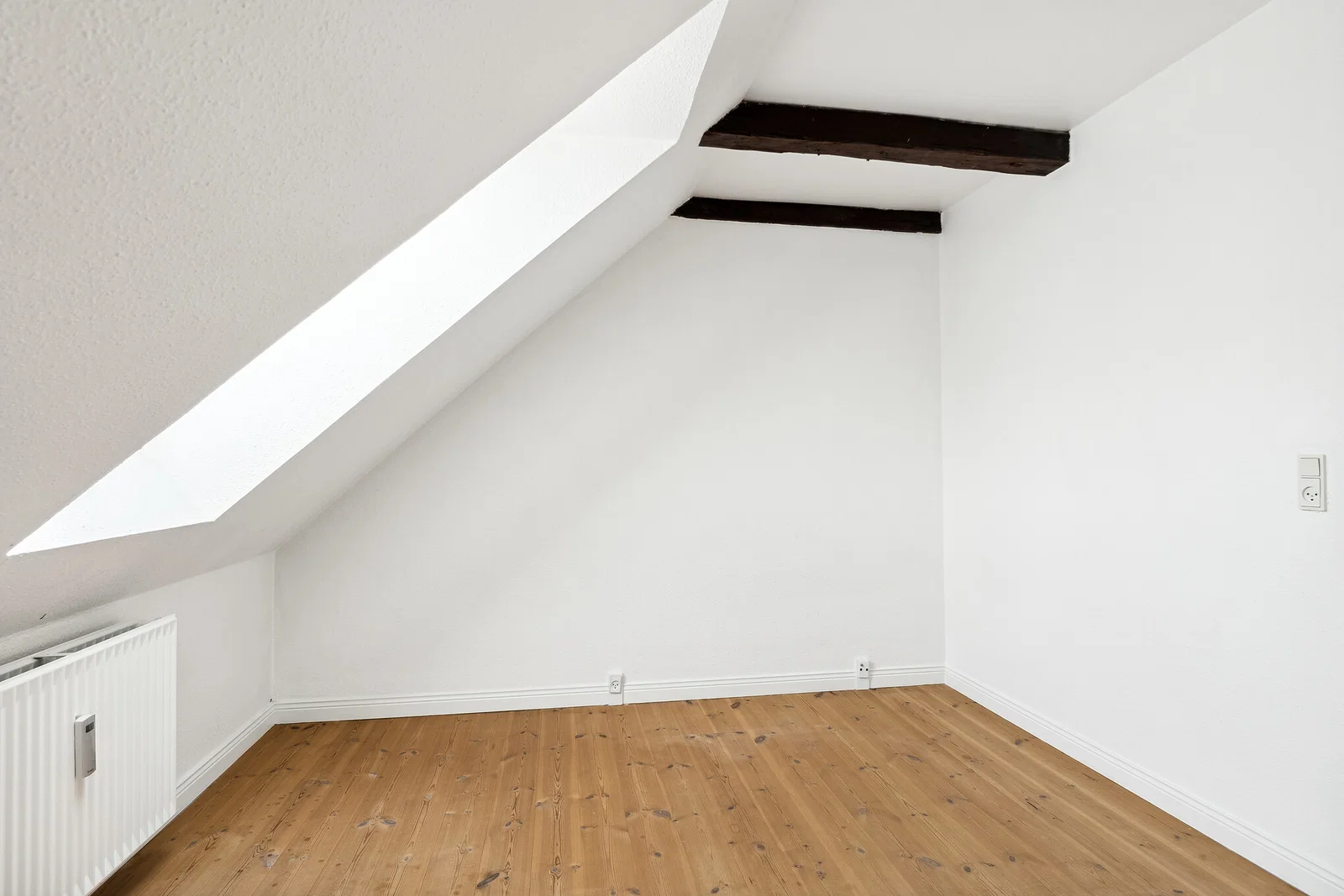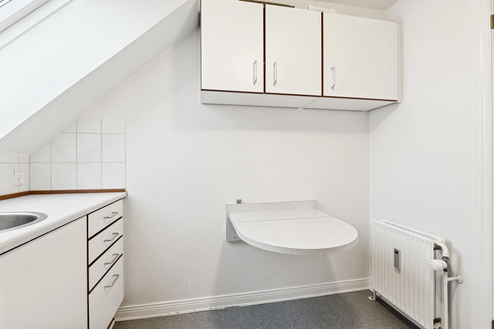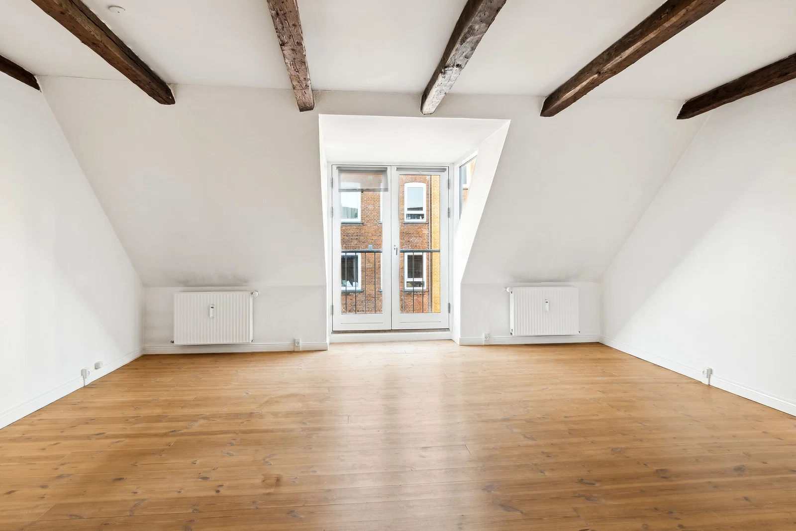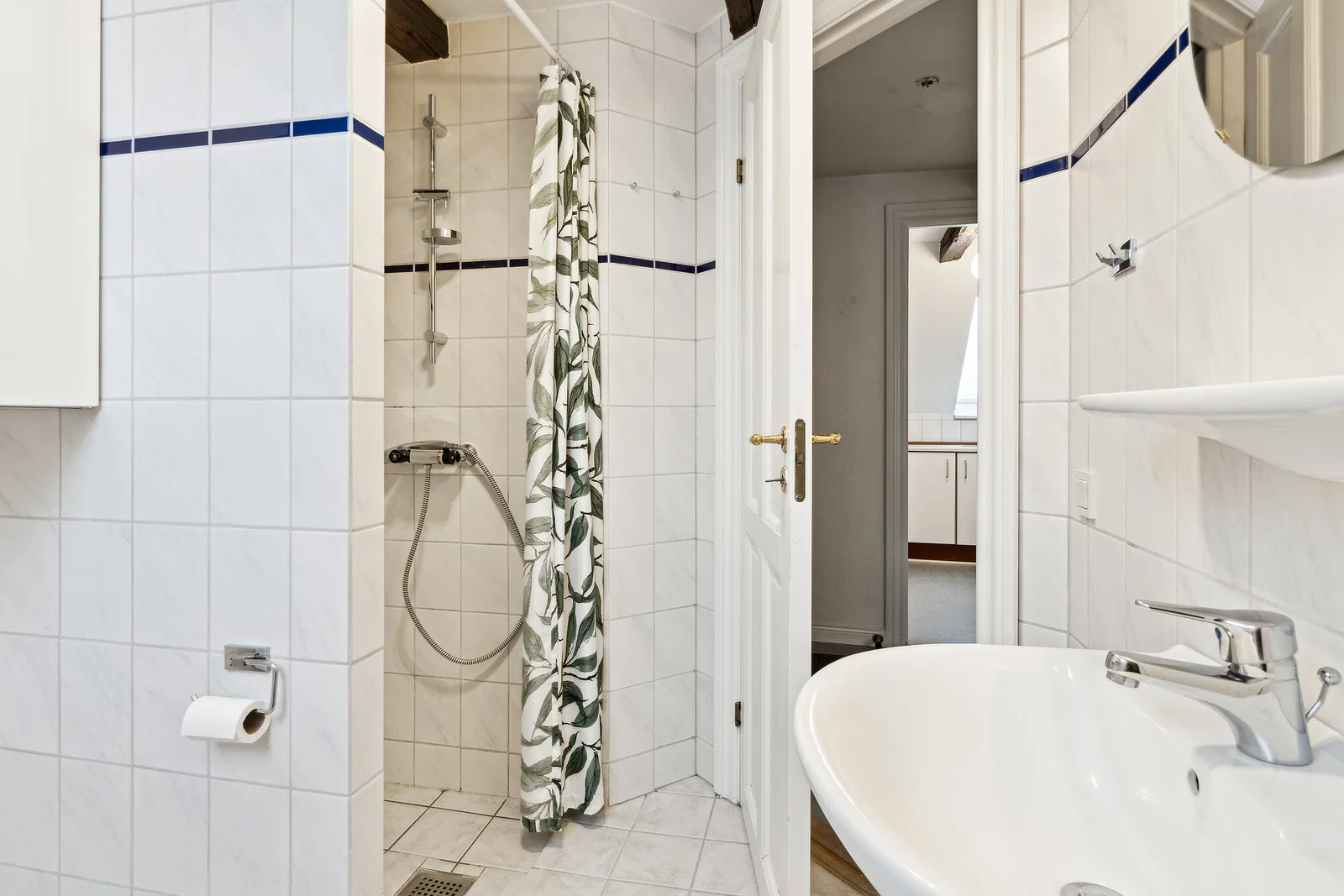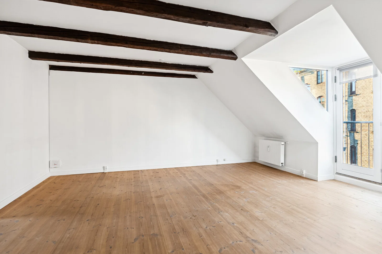 Lejligheden byder på en praktisk entré med linoleumsgulv og porttelefon. Det separate køkken er både klassisk og funktionelt med hvide elementer og trækanter, flisebeklædt væg samt god skabs- og bordplads. Her er installeret køle/fryseskab, komfur/ovn og emhætte, og et smart vægmonteret spiseklap giver en hyggelig spiseplads til 2-3 personer. Stuen er rummelig med afhøvlede trægulve, synlige bjælker og flot lys fra dobbelte terrassedøre til en fransk altan. Soveværelset ligger ugenert med ovenlysvindue og indbygget garderobeskab, hvilket skaber en rolig atmosfære.