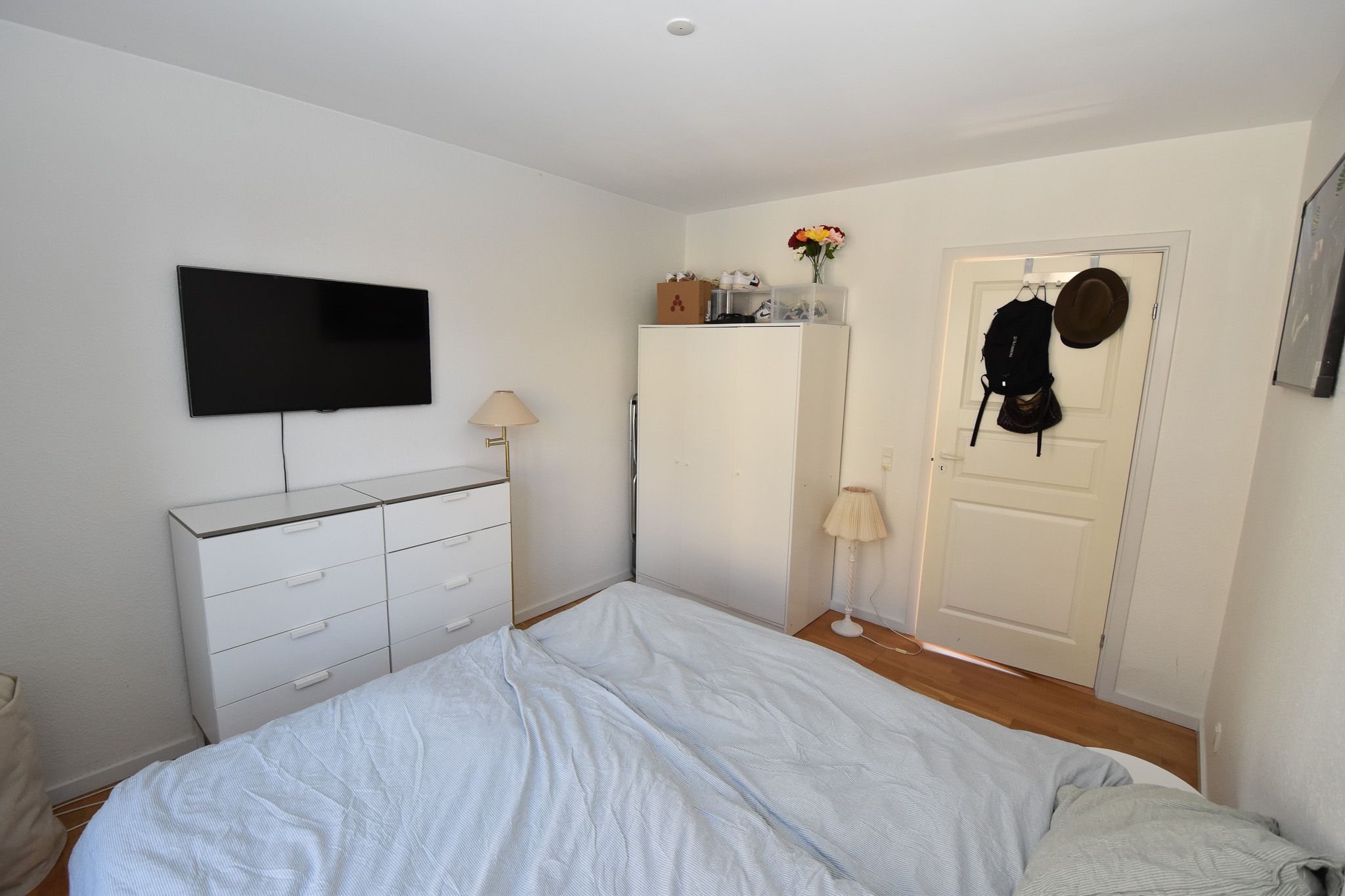 Lejligheden byder på en åben entré med moderne spots og dørtelefon, som skaber en imødekommende stemning. Det lyse køkken er udstyret med flotte skabselementer, opvaskemaskine, køle-/fryseskab, keramisk kogeplade, indbygningsovn og udtræksemhætte, alt sammen med indbygningsspot for optimal belysning. Den dejlige, store stue lader dagslyset strømme ind, mens det rummelige soveværelse giver god plads til klædeskabe og et skrivebord. Badeværelset præsenterer sig med antracitgrå fliser på gulvet, hvide fliser på væggene, gulvvarme og en afskærmet bruseniche, hvilket skaber en luksuriøs følelse.
