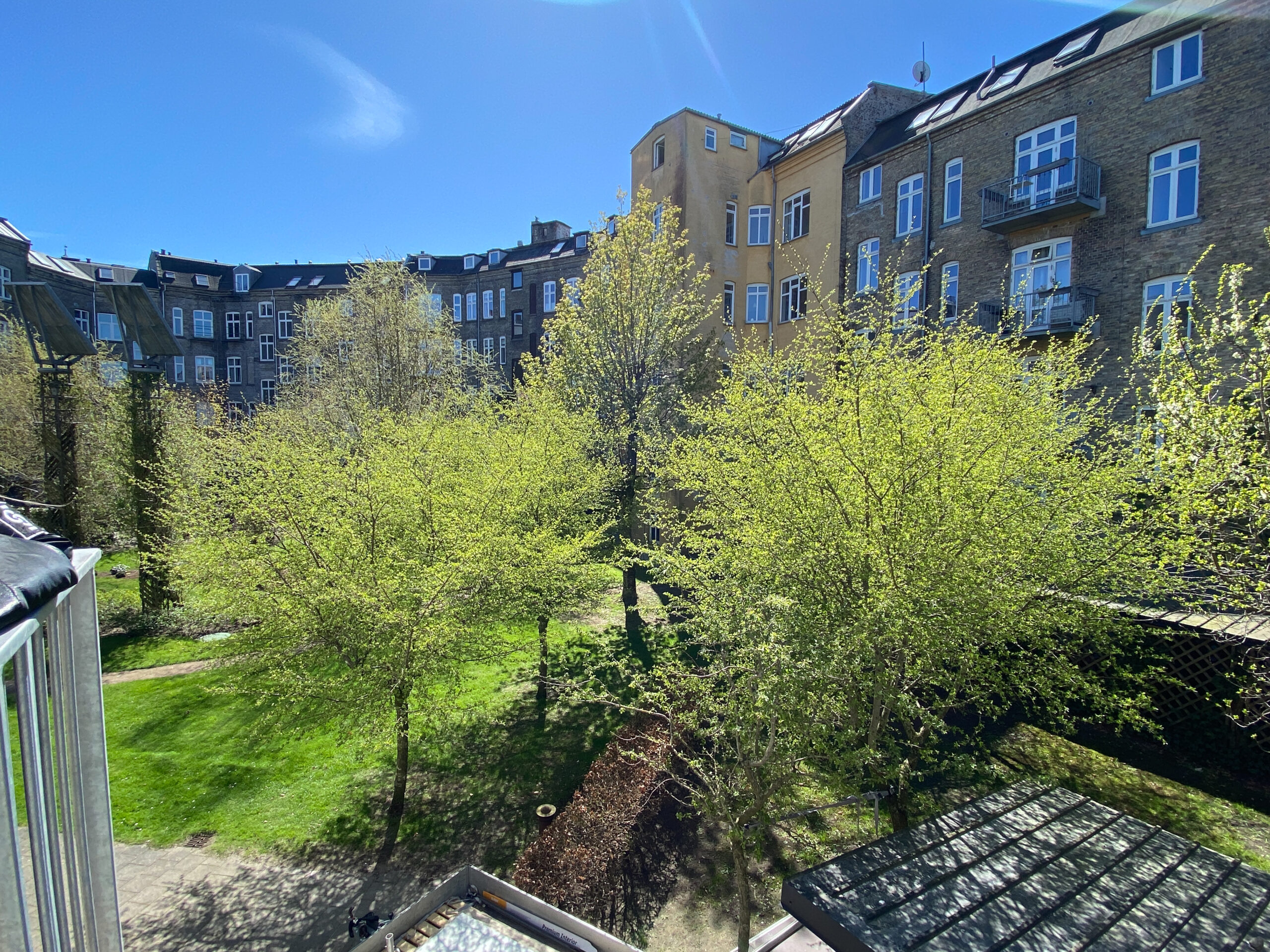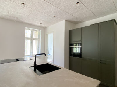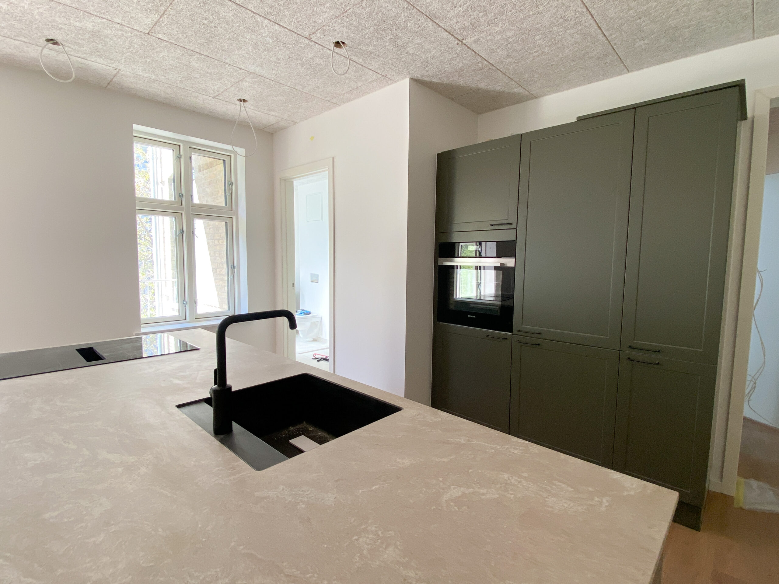 Til højre fra entréen åbner det lyse og indbydende køkkenalrum sig. Køkkenet fremstår stilrent i smukke grønne og grå nuancer med god skabsplads og funktionelle løsninger. De store vinduespartier giver et fantastisk lysindfald og skaber en naturlig ramme om spisepladsen. Herfra er der direkte udgang til en solrig altan med udsigt over en hyggelig og grøn gårdhave – et oplagt sted at nyde de varme måneder.