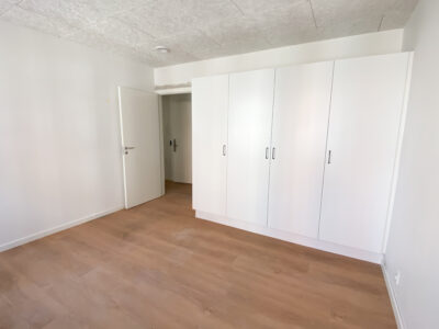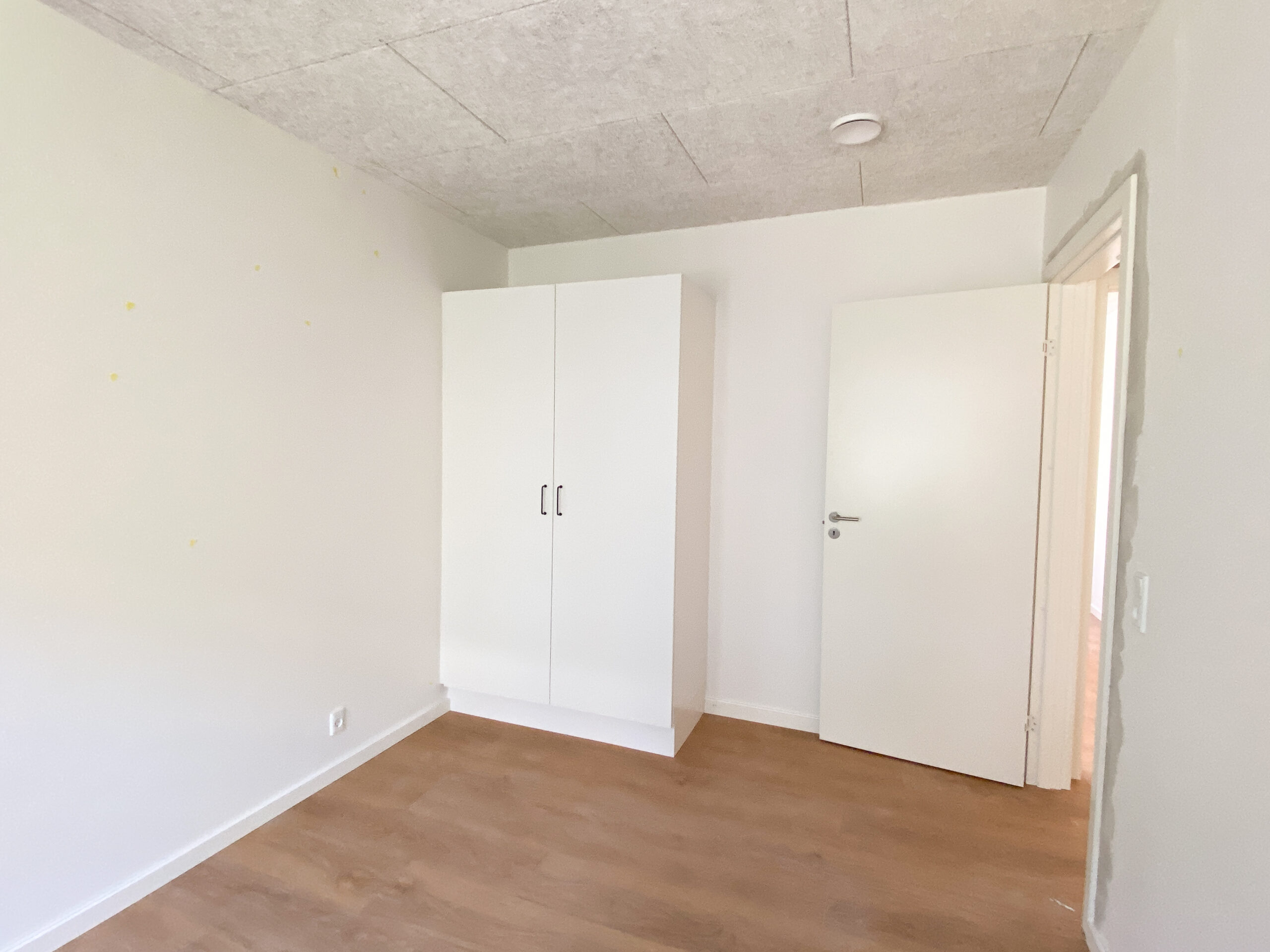 Lejligheden byder dig velkommen i en mindre entré, hvorfra boligen fordeler sig på fineste vis. Til venstre finder du to lyse værelser. Det første værelse er aflangt og yderst funktionelt med dobbeltklædeskab og god plads til både seng og skrivebord – ideelt som soveværelse eller hjemmekontor. Det andet værelse er større og rummer flere skabe, hvilket giver gode opbevaringsmuligheder. Begge værelser har et skønt lysindfald fra vinduerne, som skaber en behagelig atmosfære.