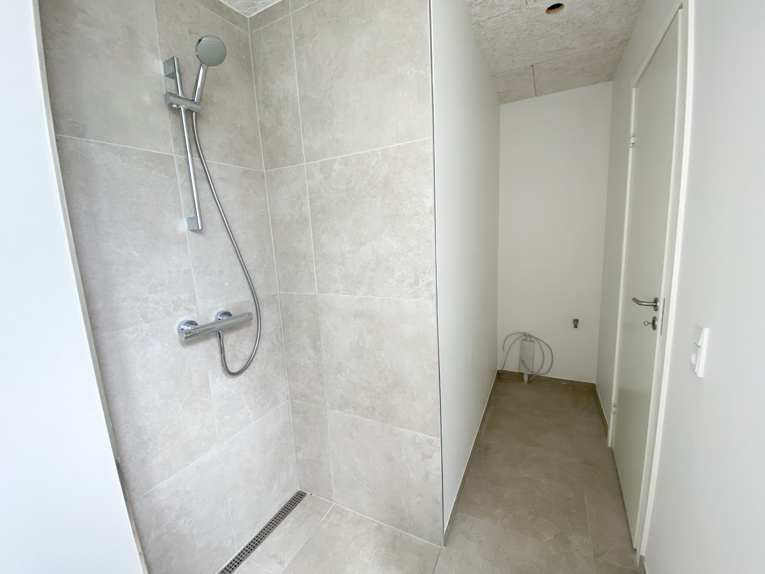 Fra køkkenalrummet er der adgang til et rummeligt badeværelse, som er udført i flotte grå klinker og med inventar i samme stilrene farver som køkkenet. Badeværelset har en god størrelse og rummer desuden en praktisk vaskesøjle diskret placeret bag døren.