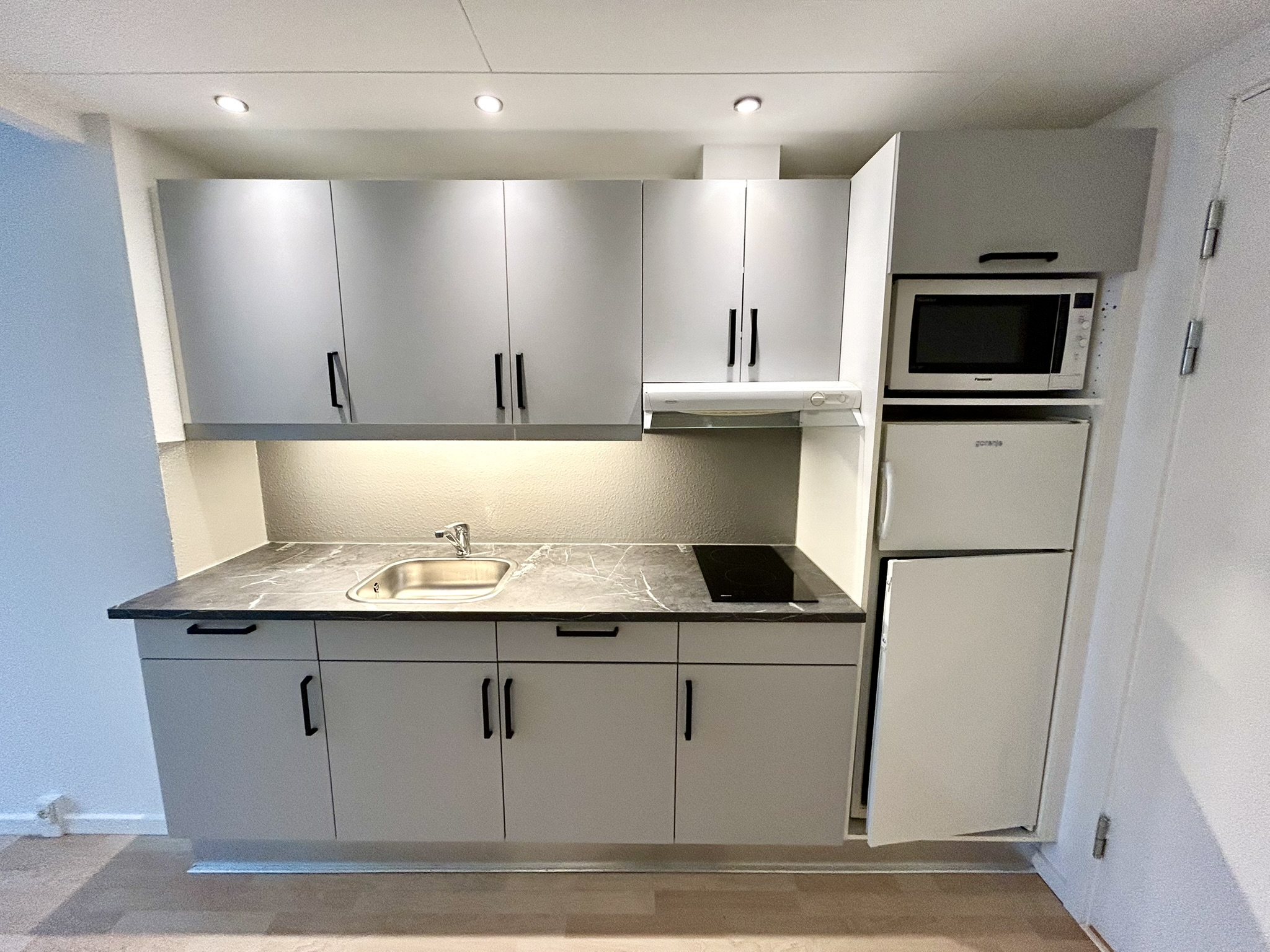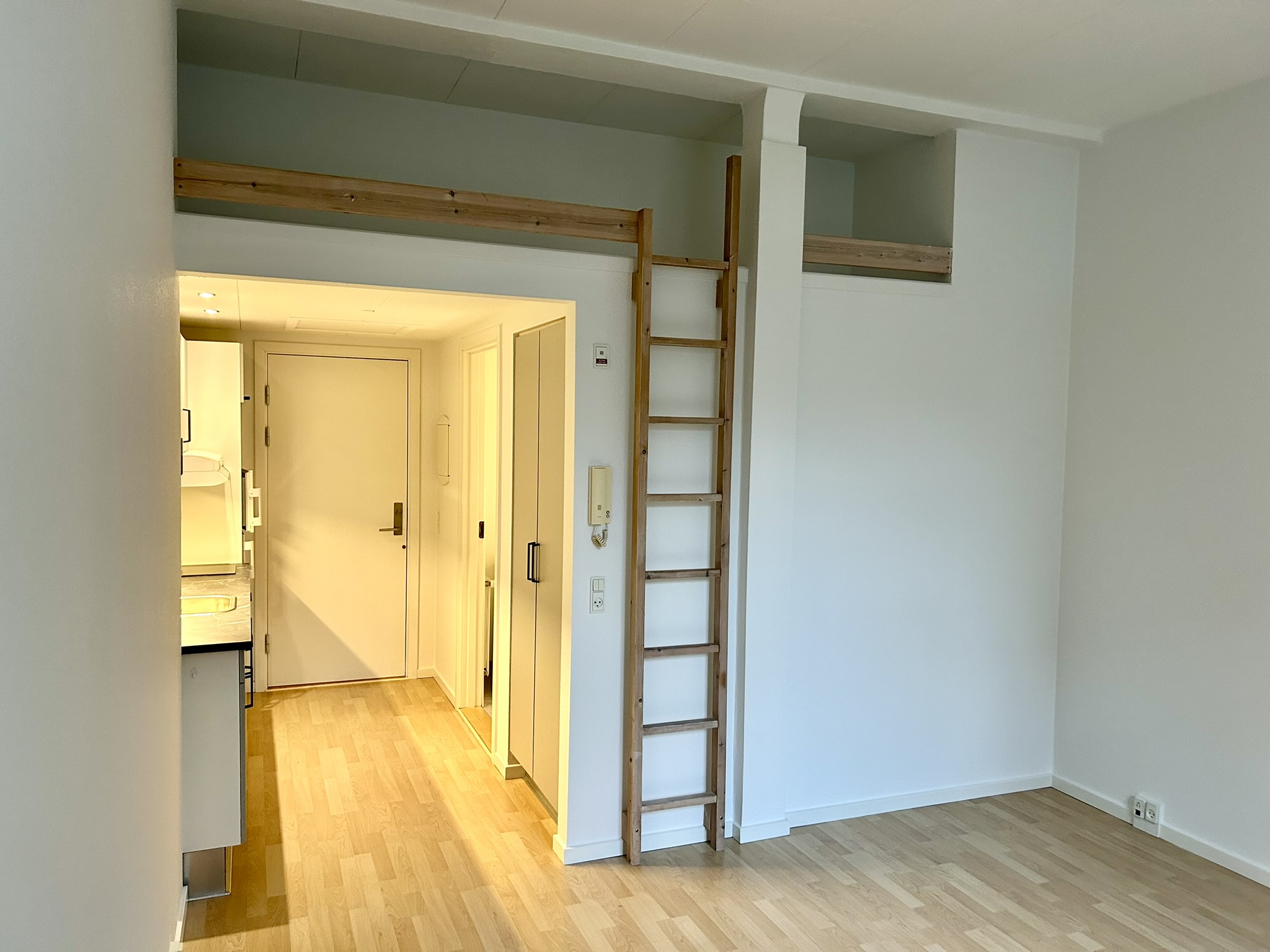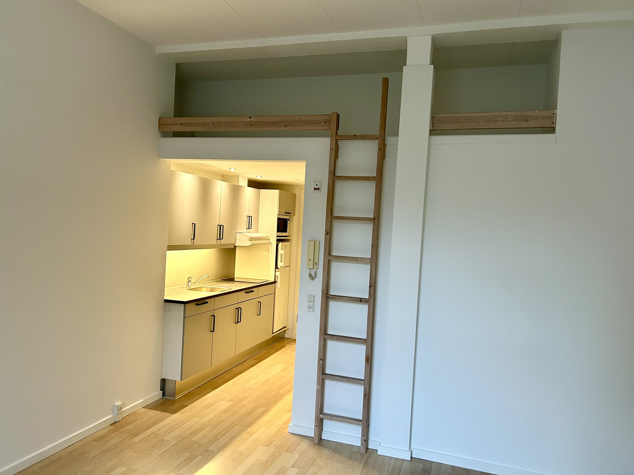 Denne fine 1-værelses lejlighed er centralt beliggende i Aalborg og byder på et lyst og åbent rumforløb. Den lyse stue er i åben forbindelse med et funktionelt køkken, der er udstyret med god skabsplads, to kogeplader og en kombiovn. En lille hems giver mulighed for ekstra opbevaring eller en hyggelig soveplads. Den gennemgående stemning er indbydende og hjemlig.