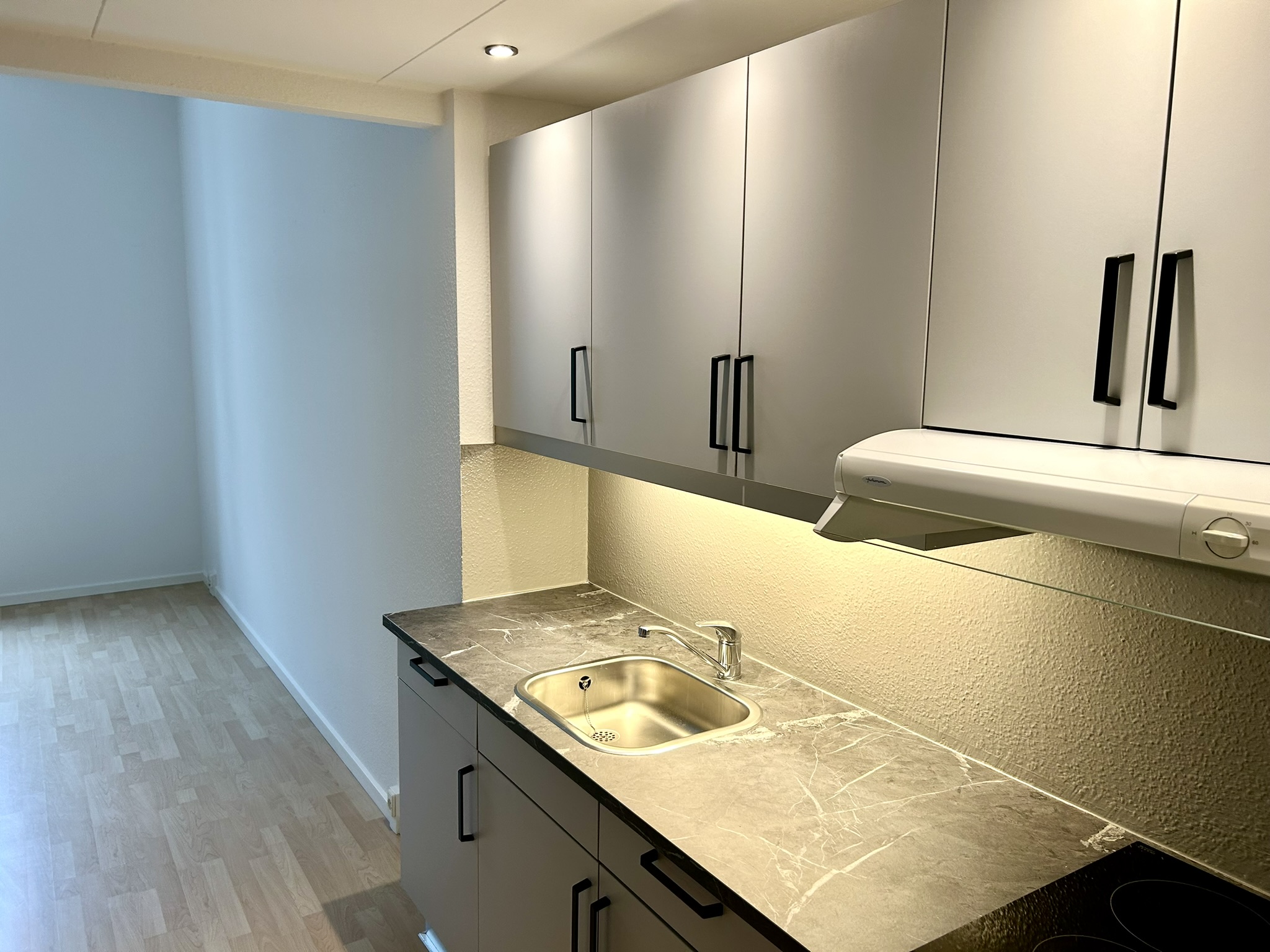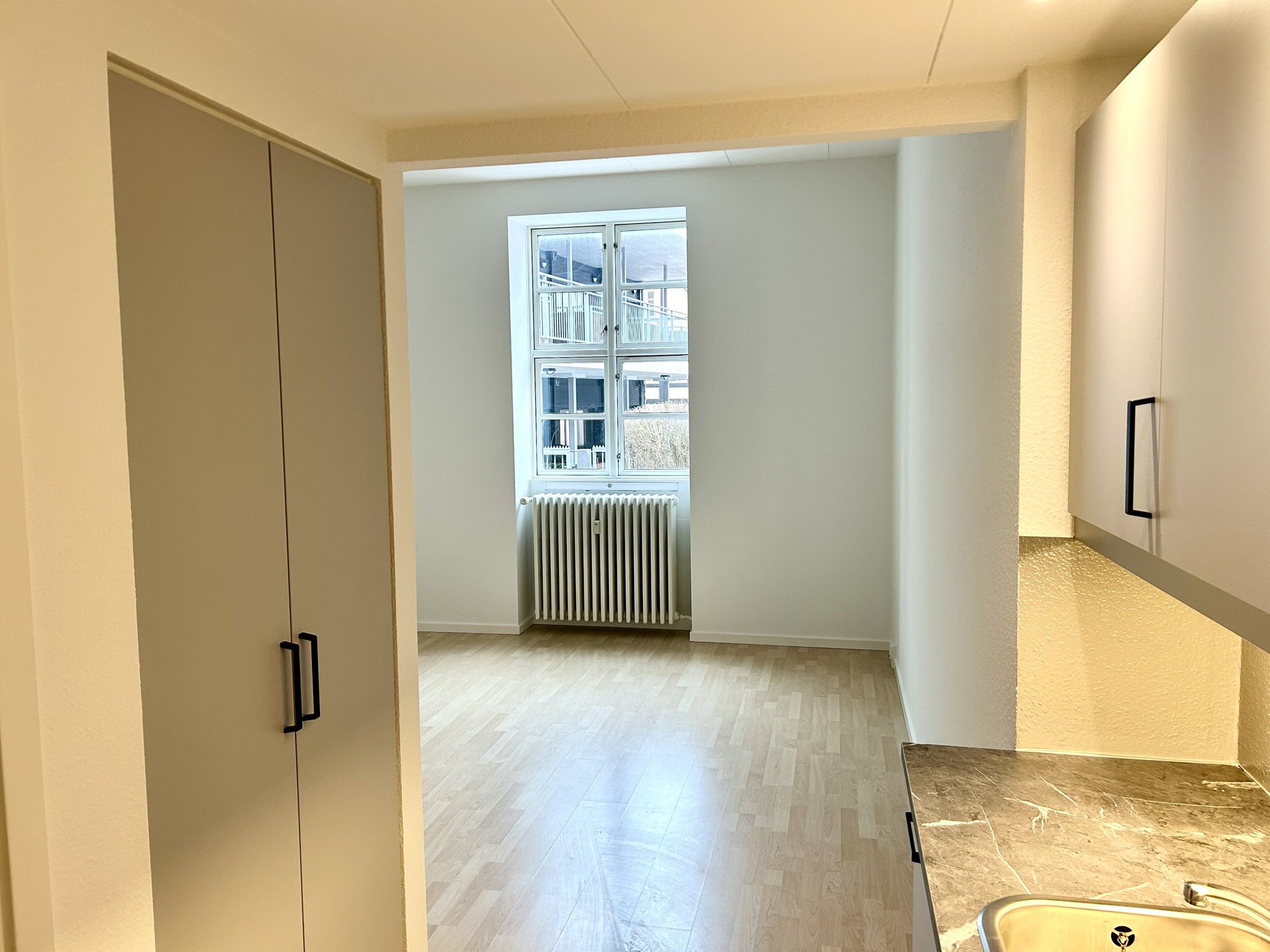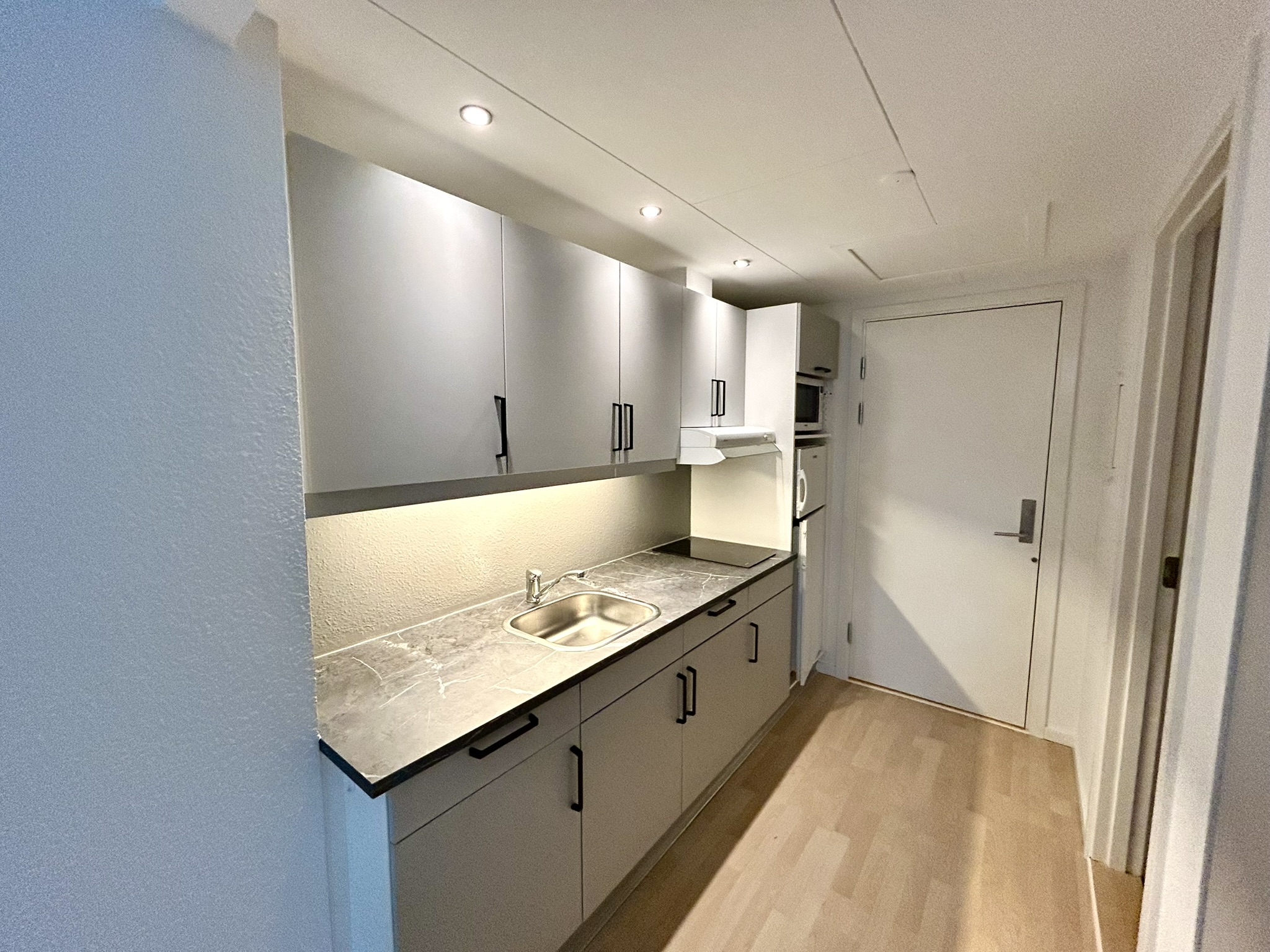 Denne fine 1-værelses lejlighed er centralt beliggende i Aalborg og byder på et lyst og åbent rumforløb. Den lyse stue er i åben forbindelse med et funktionelt køkken, der er udstyret med god skabsplads, to kogeplader og en kombiovn. En lille hems giver mulighed for ekstra opbevaring eller en hyggelig soveplads. Den gennemgående stemning er indbydende og hjemlig.