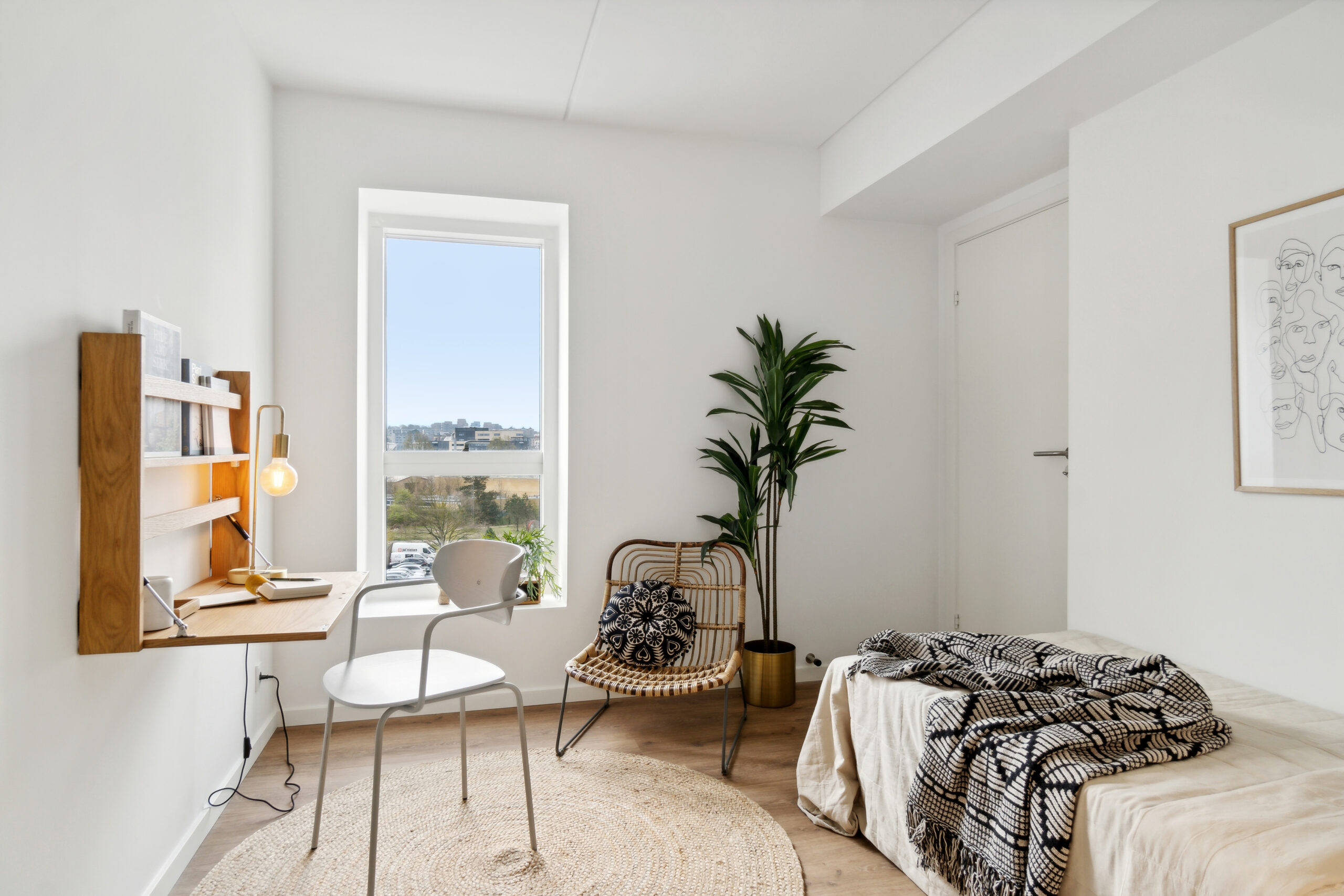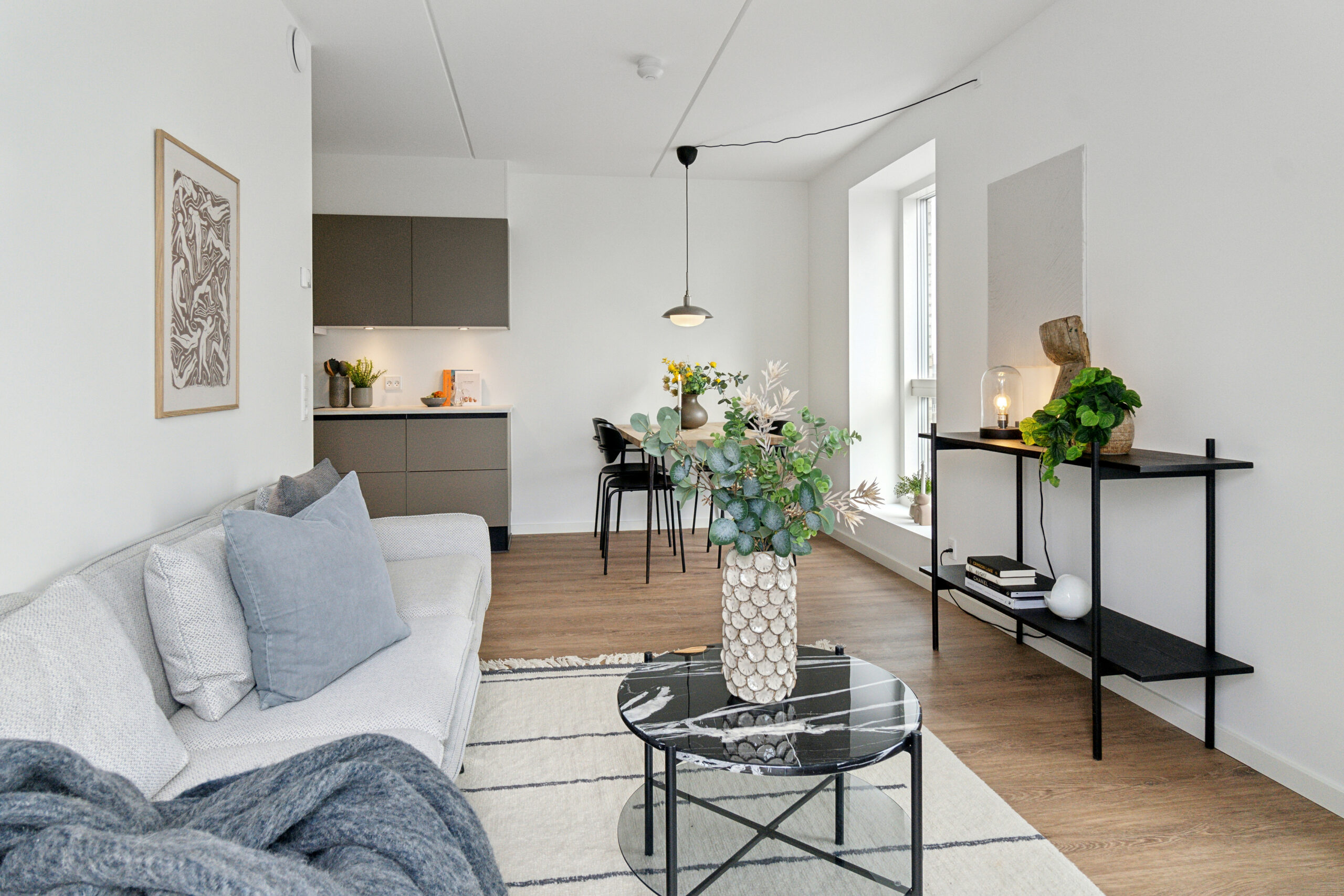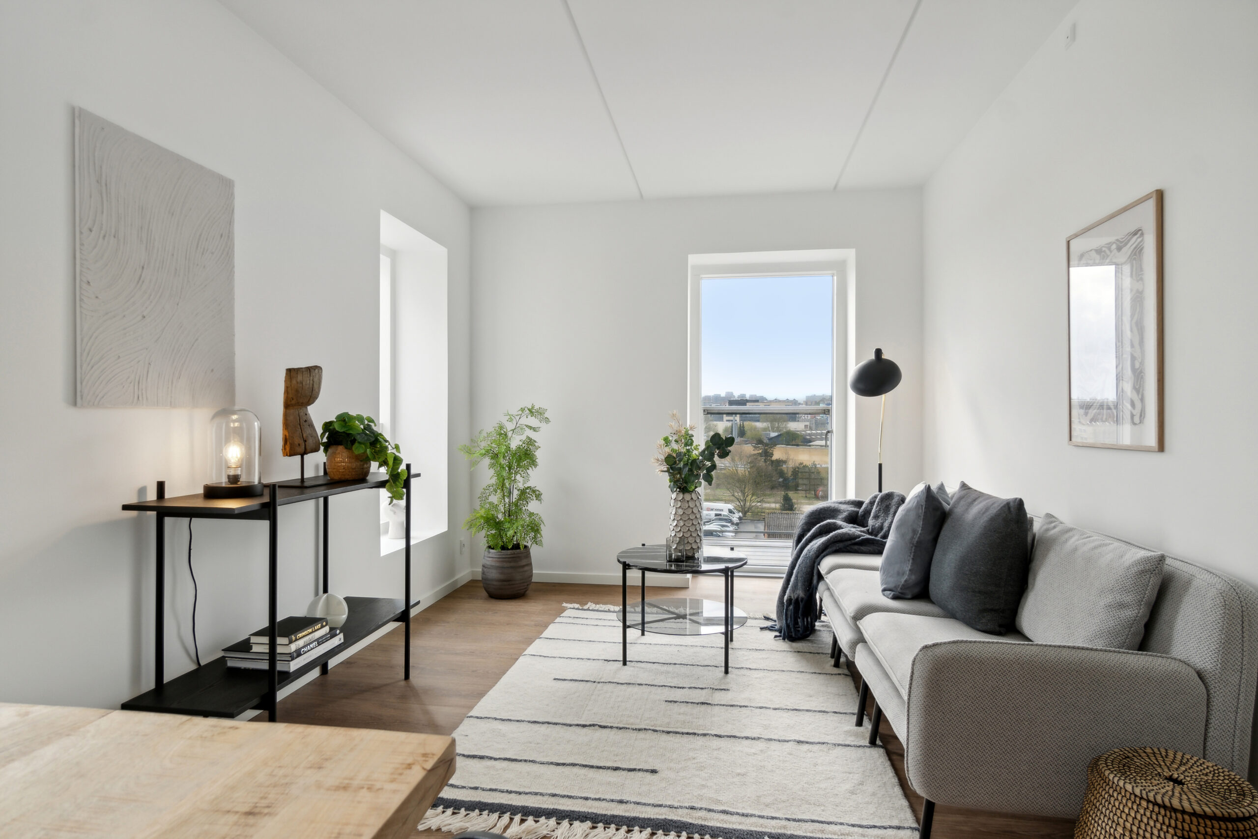 Denne lejlighed er kendetegnet ved flotte, lyse trægulve, der tilføjer en varm atmosfære og skaber en fornemmelse af sammenhæng mellem rummene.