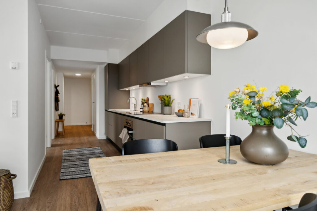 I enden af gangen åbner sig et imponerende stort og lyst køkkenalrum, der fungerer som lejlighedens hjerte. Her er der plads til både et stort spisebord og en komfortabel sofagruppe, hvor du kan samle familie og venner til hyggelige stunder. Fra køkkenalrummet har du direkte adgang til lejlighedens altan, hvor du kan nyde frisk luft og udsigten over området.