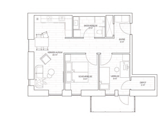Altanen er fra stuen. Plantegningen er fra en bolig, hvor altanen er et andet sted.