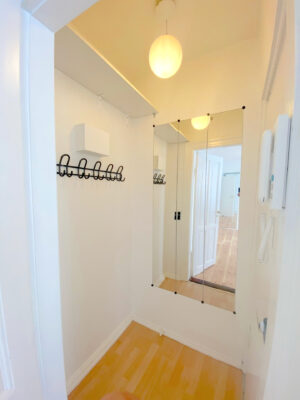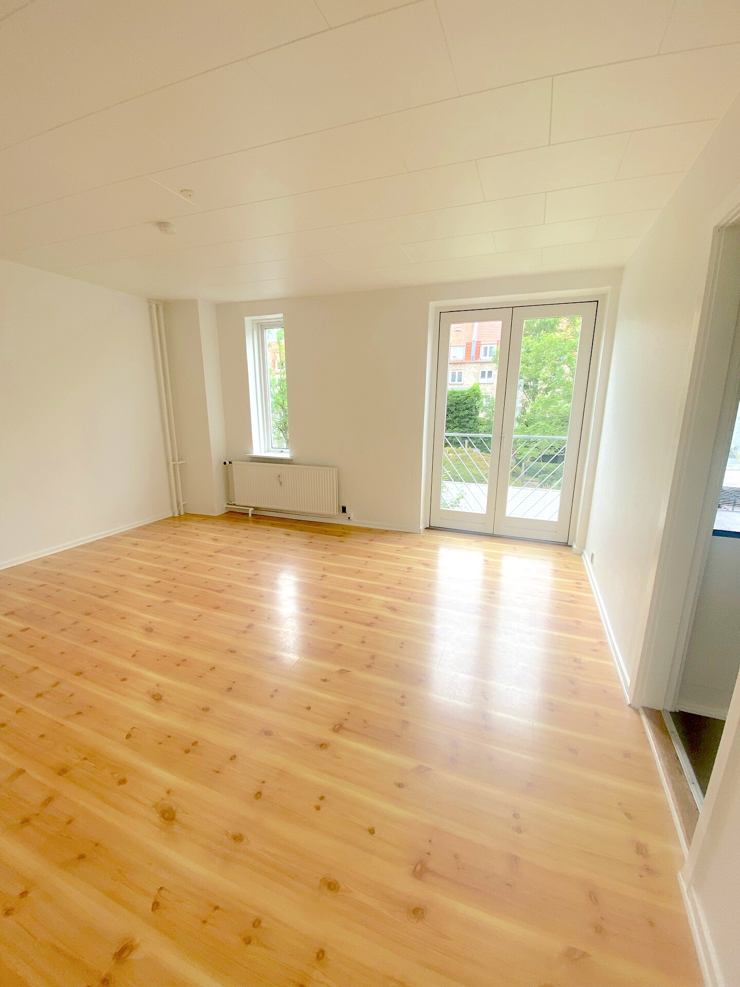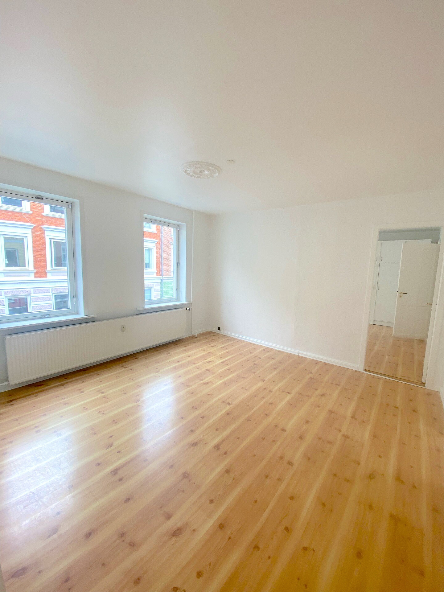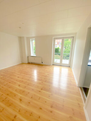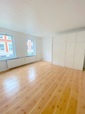 Lejligheden er på 81 kvm og vi begynder i den lyse entré. Den giver jer adgang til den første stue. Derfra er der adgang til både soveværelse og spisestue, eller ekstra værelse. I den første stue er der store vinduer og højt til loftet. Her er der plads til at indrette et hyggeligt sofaområde foran vinduerne, hvor det naturlige lys strømmer ind.