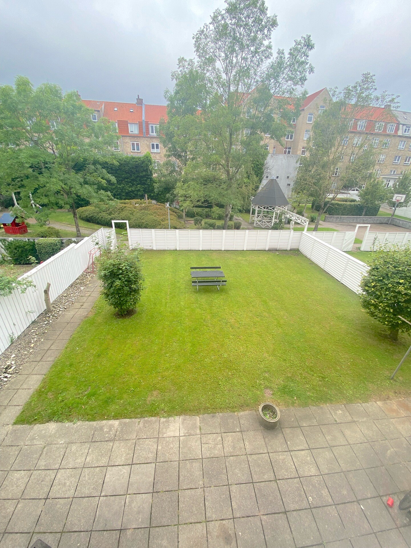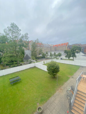 Fra lejligheden bevæger vi os ned i en rigtig hyggelig gård. Den byder på lækre terrasser og grønne områder. En rigtig lækker gård, som fungerer som jeres lille grønne oase her i byen.