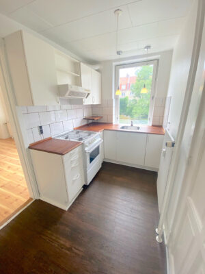 Vi bevæger os videre ind i et fint soveværelse, hvor I både finder plads til en stor seng og godt med opbevaringsplads. Fra soveværelse er der adgang til et stort og praktisk badeværelse, hvor du kan slappe af i badekarret. Køkkenet tilbyder god bord- og skabsplads og ligger i forbindelse med stuen.