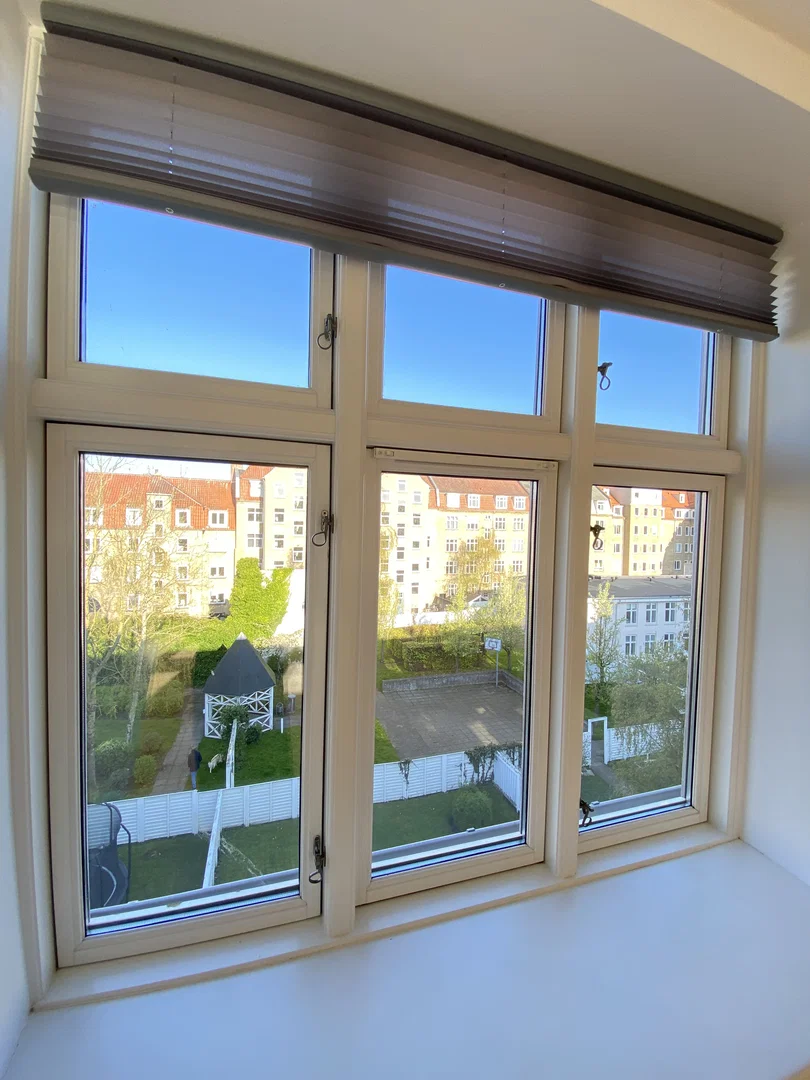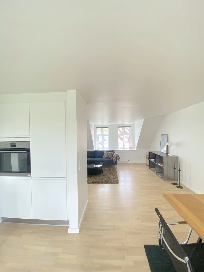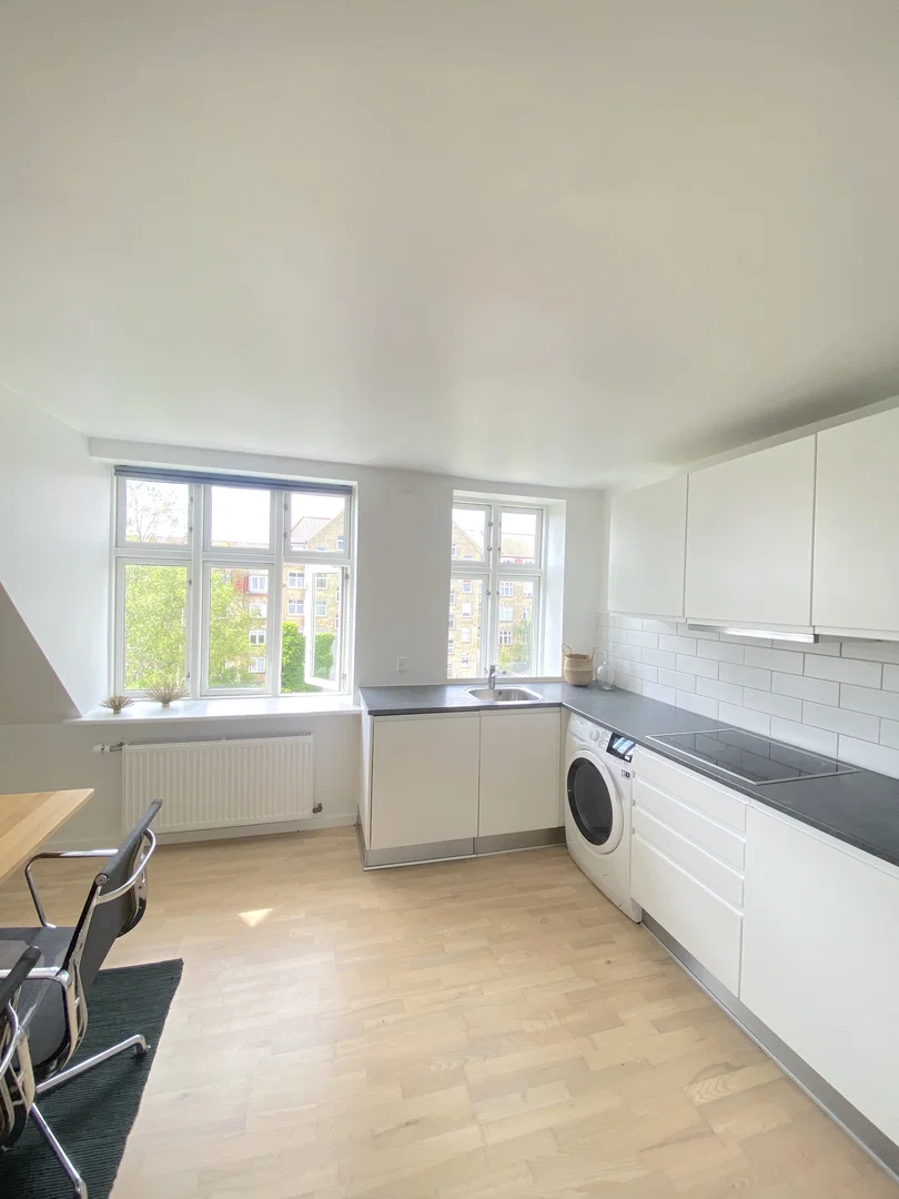 Lejligheden byder på fire rummelige værelser med flotte trægulve, der skaber en varm og indbydende stemning. Den lyse stue er perfekt til afslapning og underholdning, hvor naturligt lys strømmer ind gennem de store vinduer. Det moderne køkken er udstyret med opvaskemaskine samt vaskemaskine og tørretumbler, hvilket gør hverdagen lettere. Herfra kan du nyde en dejlig udsigt over de omkringliggende gader. Badeværelset er stilrent og funktionelt, hvilket sikrer din daglige komfort.