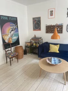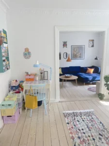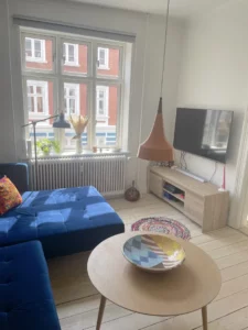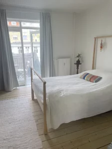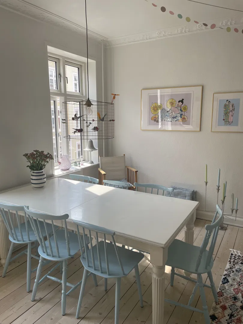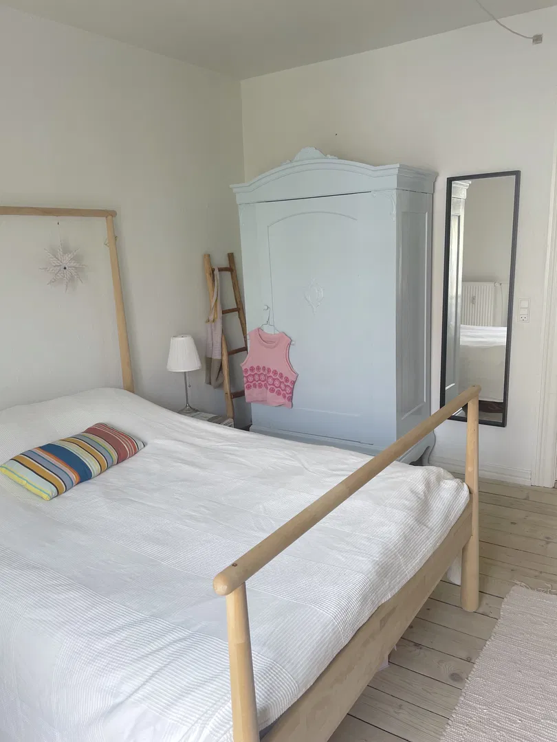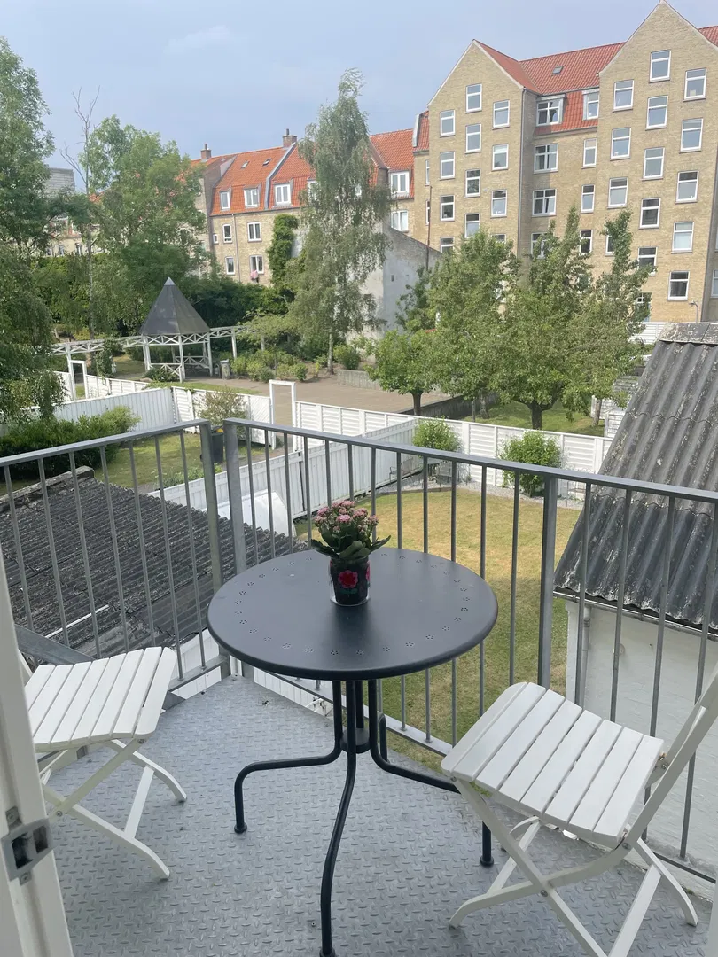 De to stuer en suite er badet i naturligt lys. Her kan du nemt indrette en hyggelig spisestue og sofastue. Herfra har du har adgang til soveværelset, hvor du ligeledes får masser af plads, samt udgang til lejlighedens altan, med skøn udsigt over haverne.