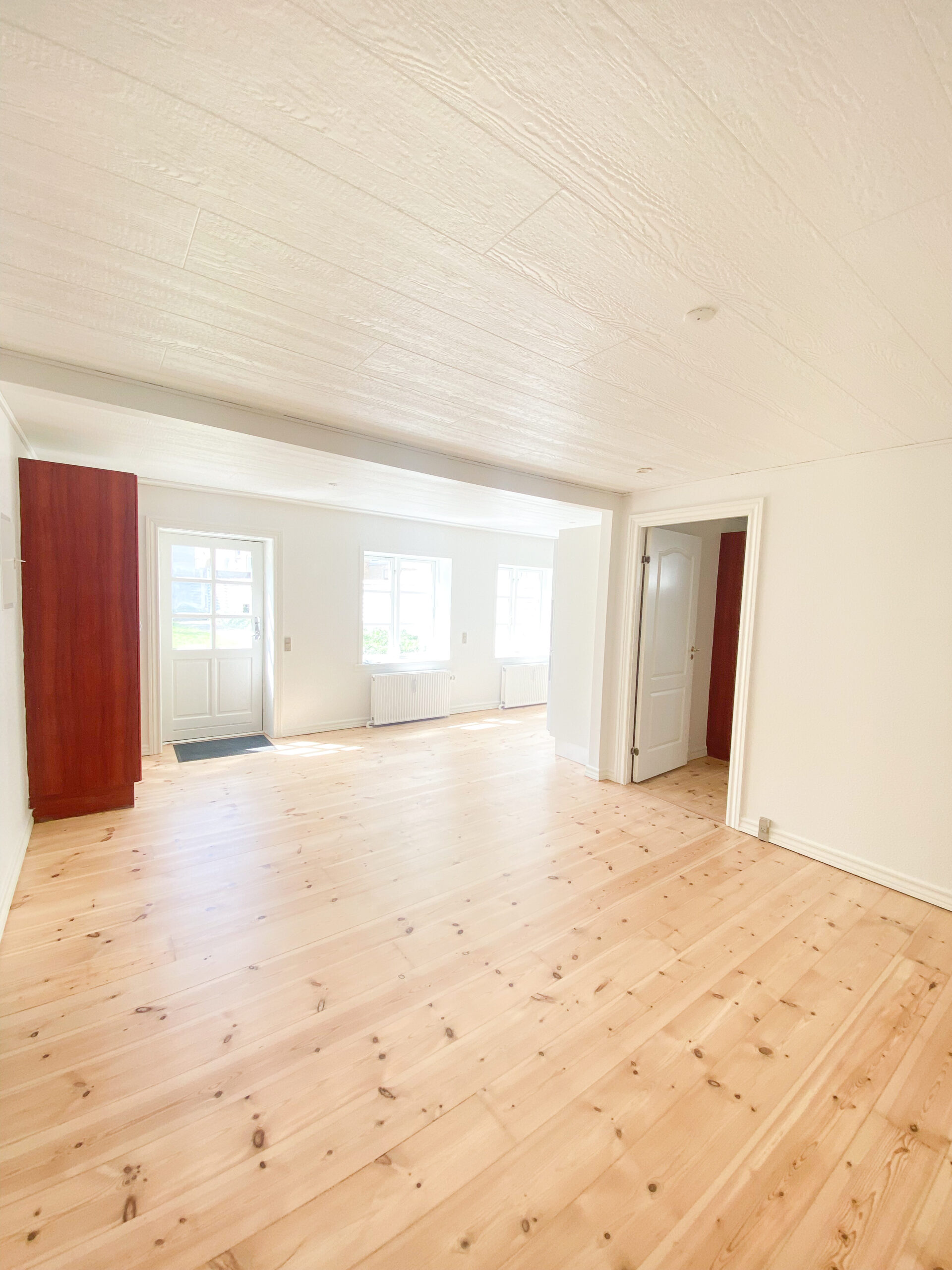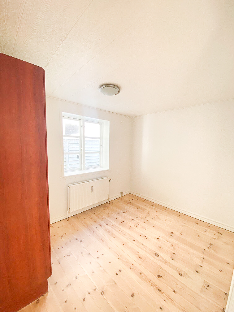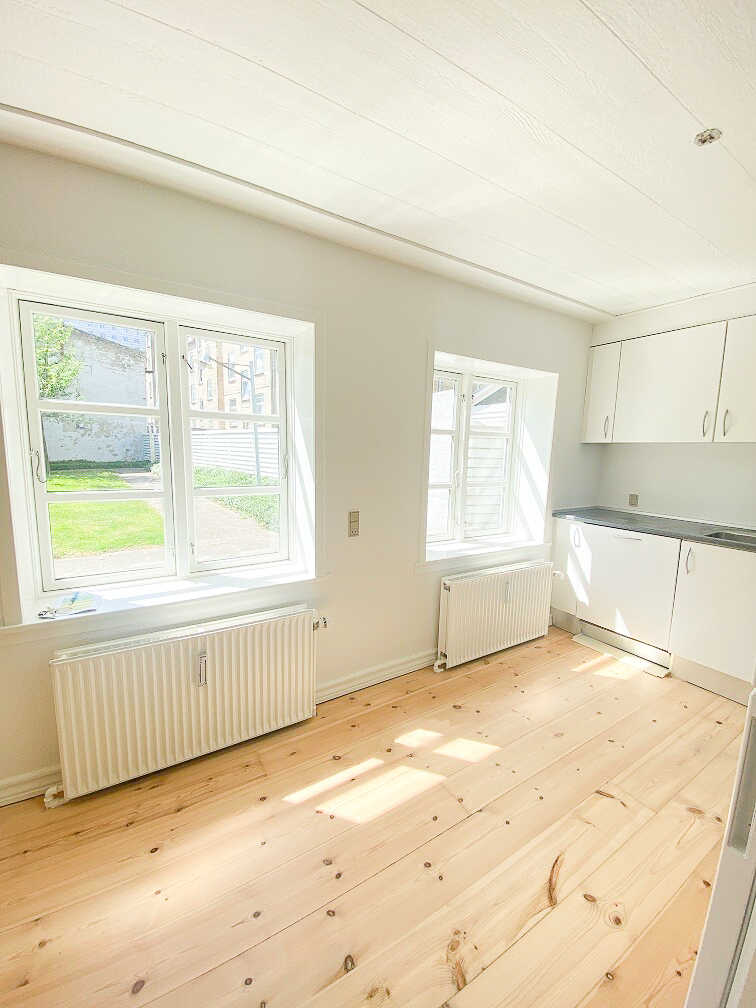Stuen der er badet i naturligt lys, udgør et rummeligt og hyggeligt opholdssted, hvorfra du har adgang til soveværelset, hvor du også får masser af plads.