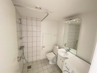 Ved siden af trappen finder du det velholdte badeværelse, der har en separat bruseniche og plads til både vaskemaskine og mulighed for at installere tørretumbler. Fra køkkenalrummet er der også adgang til en skøn altan med udsigt til den hyggelige gårdmiljø, perfekt til at nyde de rolige omgivelser.